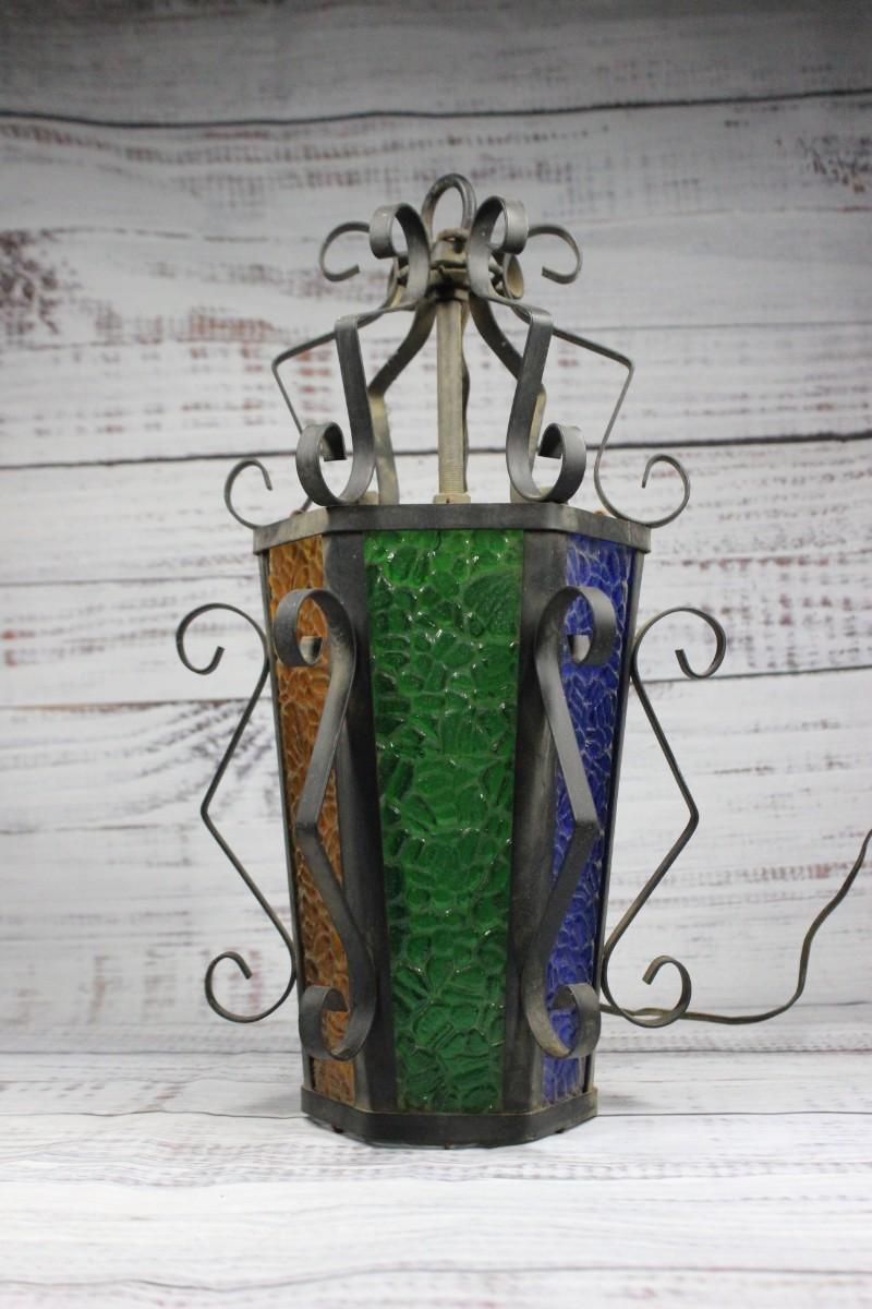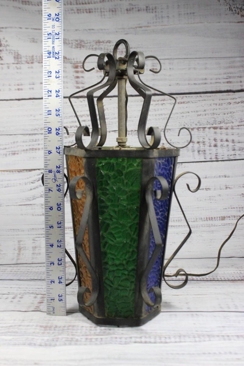 Vintage Wrought Iron Multicolored Spanish Gothic Glass Swag Lamp