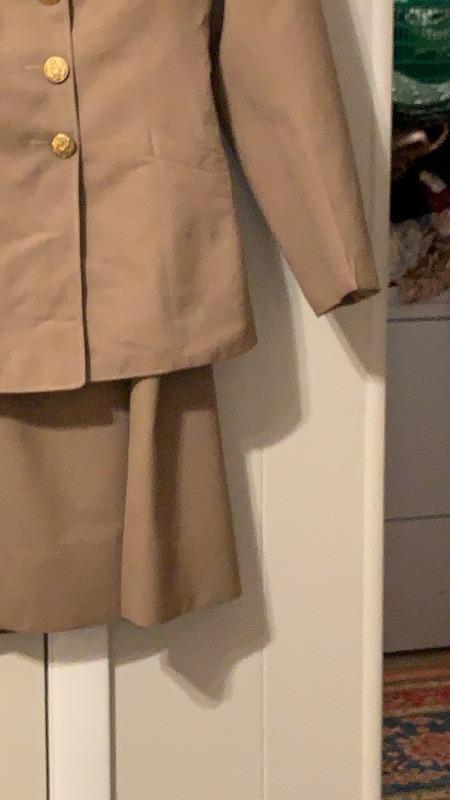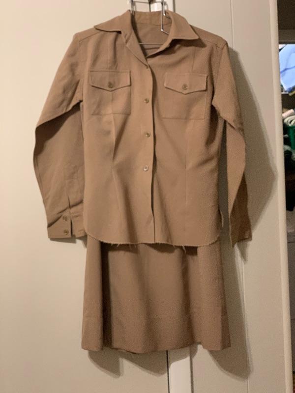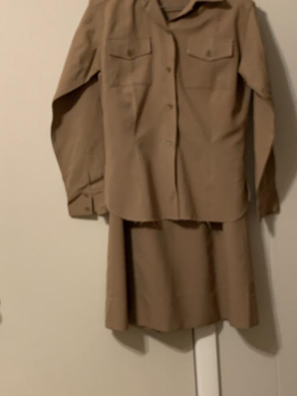 This uniform, which includes skirt, blouse and tunic with AAC/AAF shoulder patch was worn by Edith Rose Stevenson. She enlisted in 1949 and was a Korean War veteran. Size small. The skirt appears to be perfect but there are a few minor spots on the blouse and tunic as can be seen in the pictures. They are smaller than they appear in pictures. No holes or frayed areas. Check out our other military items in this sale.