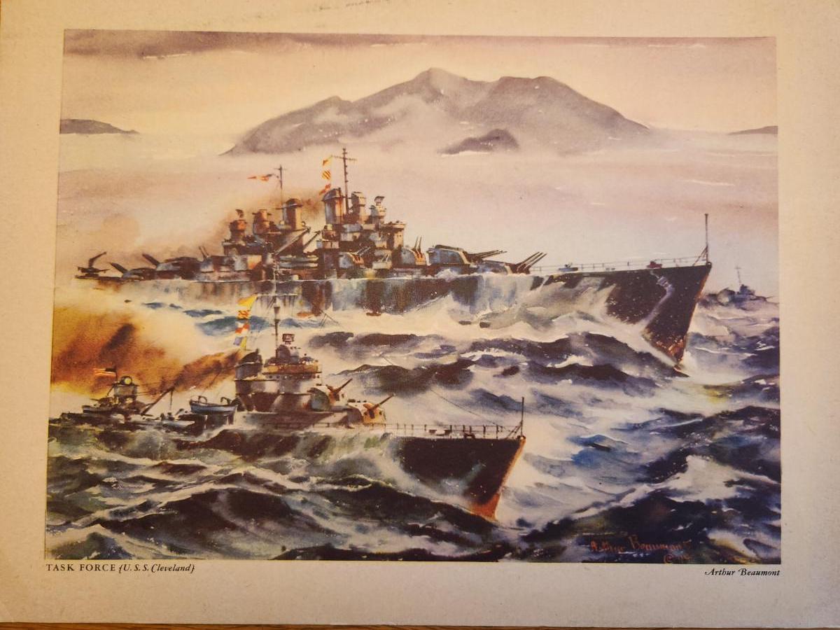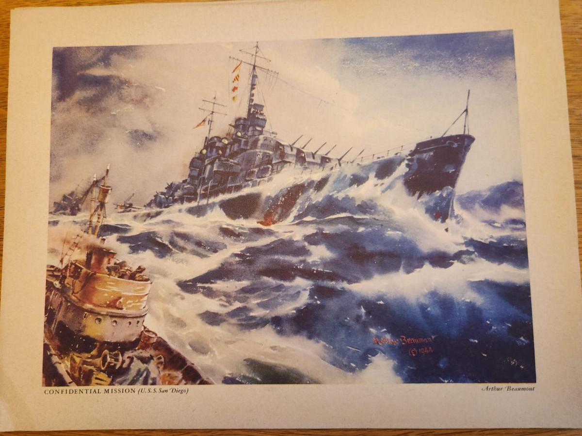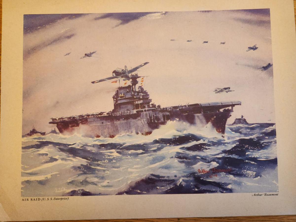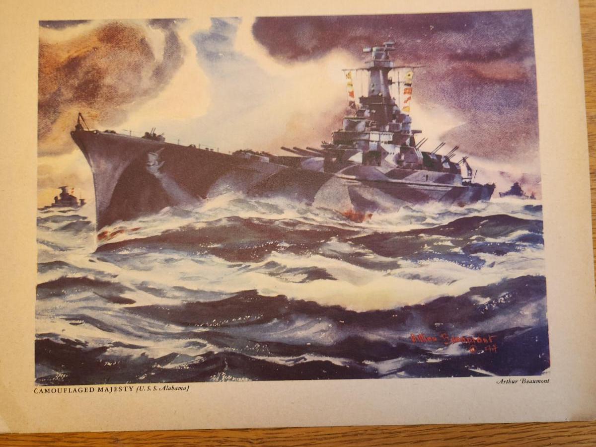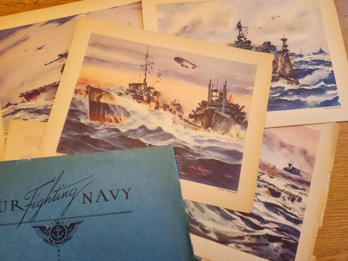This lot is for a Vintage WW2 Navy Ship Prints Folio by Beaumont. This folio holds eight prints in the remnants of a blue folder. Our Fighting Navy - Color Reproduction of Paintings by Arthur Beaumont. This collection holds eight different prints most all in good but aged condition. Each print measures about 10X13-inches. No dating on any. Would be a very handsome grouping on a wall. The prints include the USS Louisville, USS Alabama, USS Cleveland, USS San Diego, USS Enterprise, a Destroyer, a Destroyer Escort and Motor Torpedo Boats. Where you gonna find 'em.
