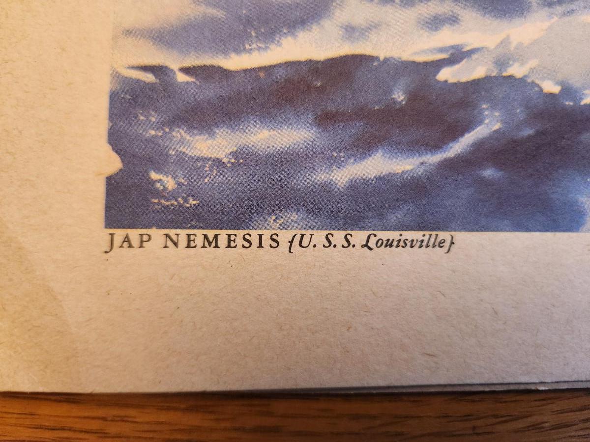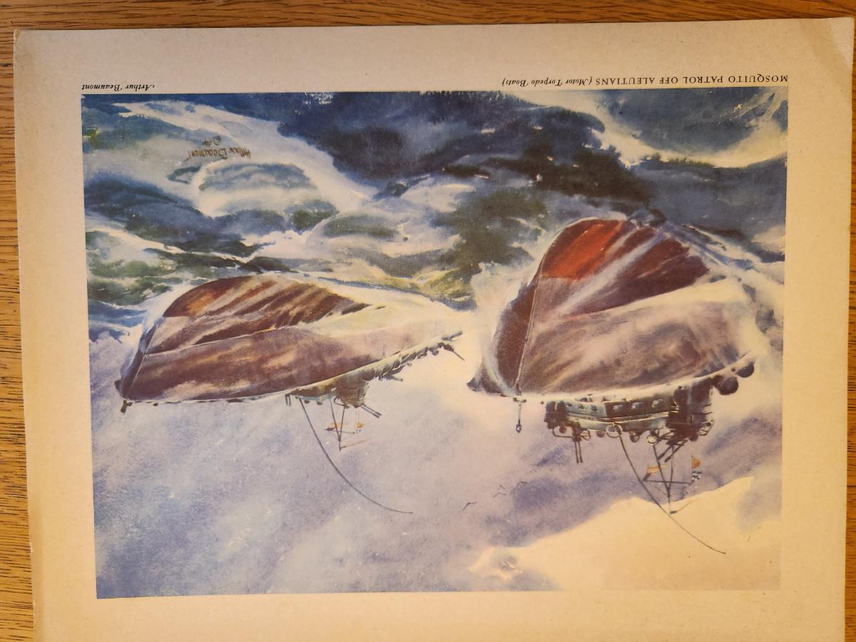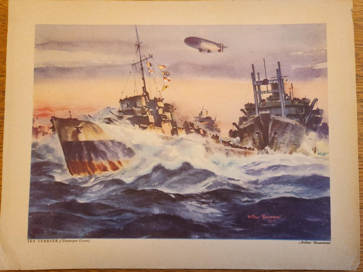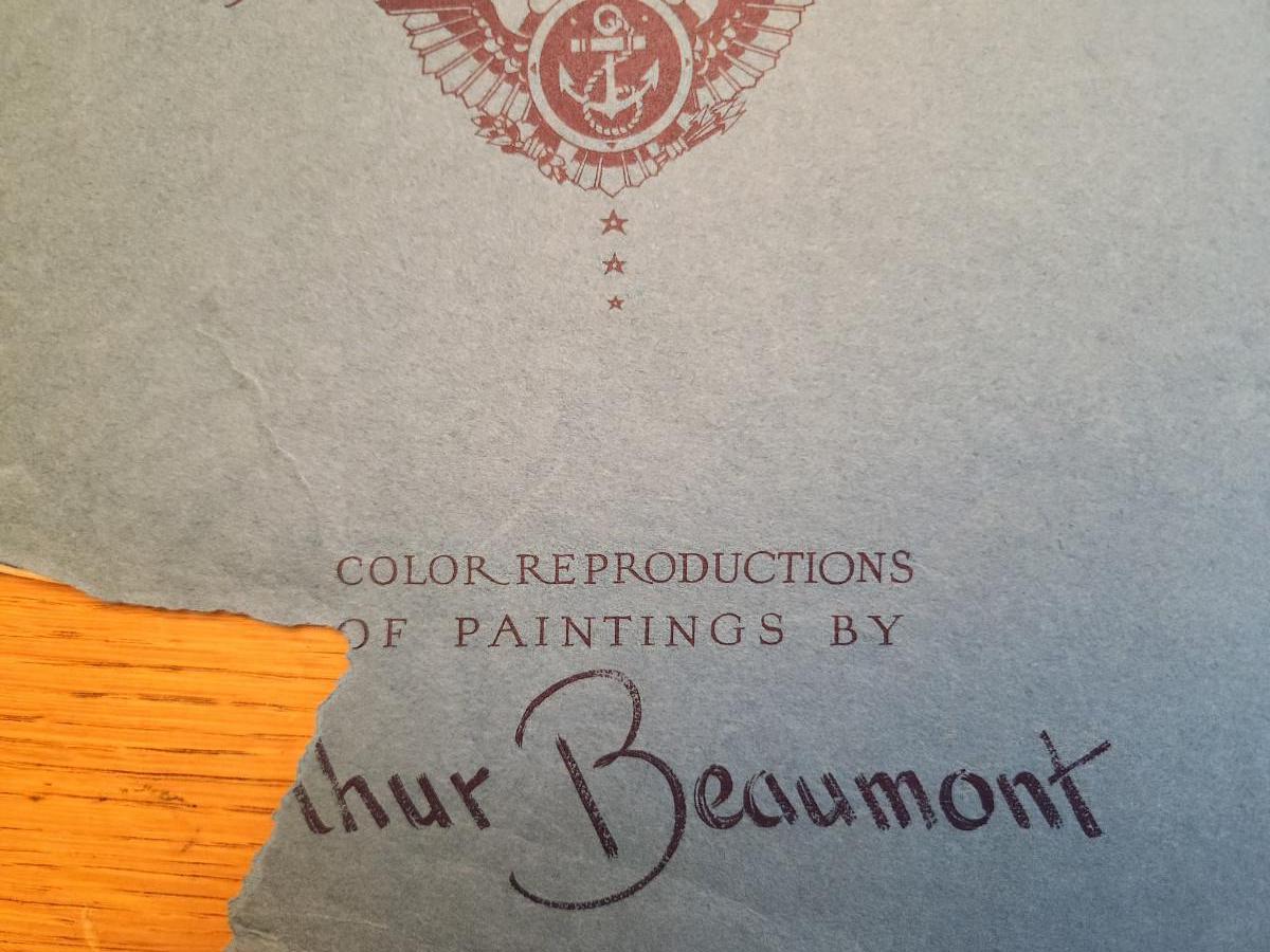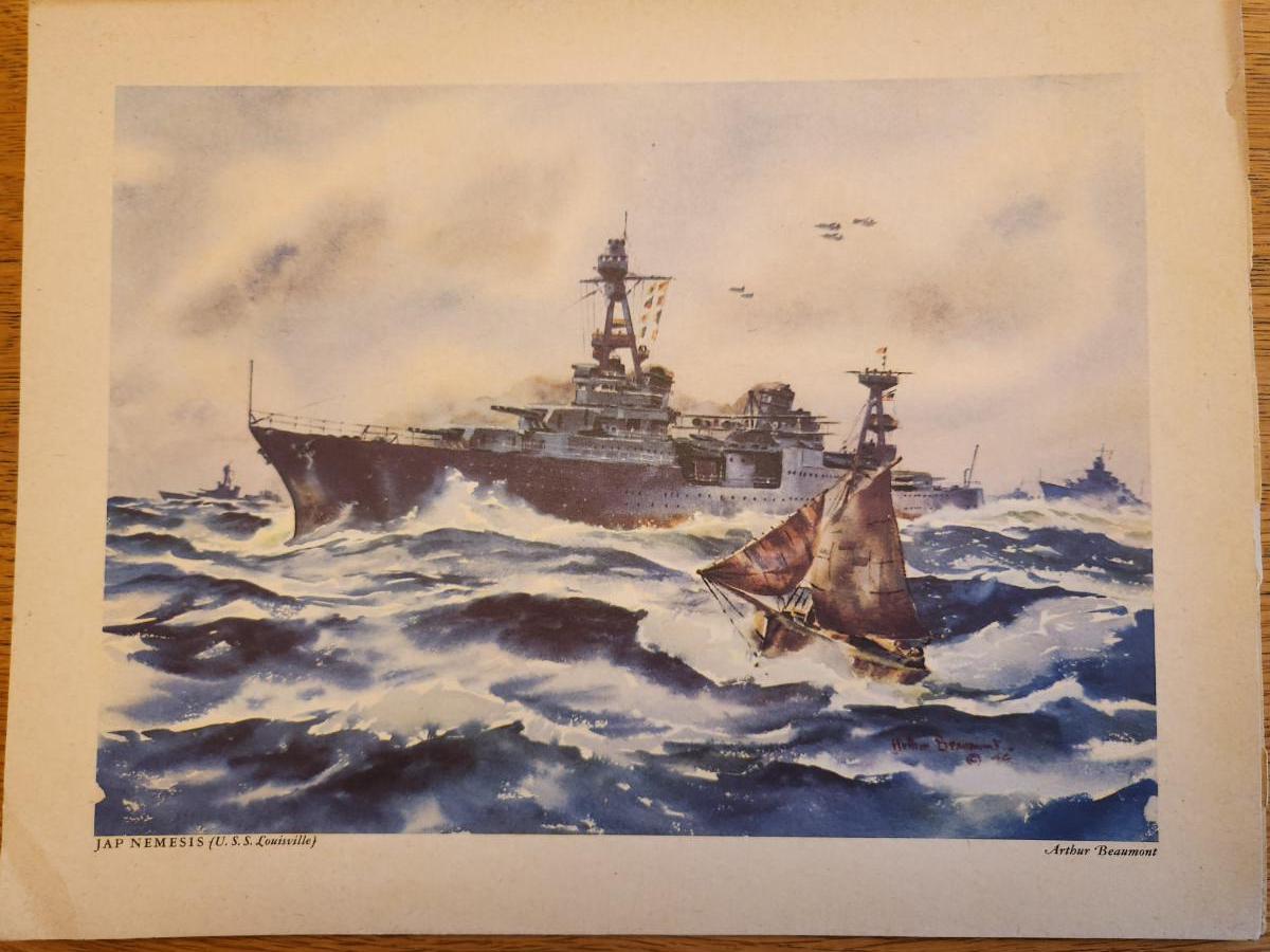 This lot is for a Vintage WW2 Navy Ship Prints Folio by Beaumont. This folio holds eight prints in the remnants of a blue folder. Our Fighting Navy - Color Reproduction of Paintings by Arthur Beaumont. This collection holds eight different prints most all in good but aged condition. Each print measures about 10X13-inches. No dating on any. Would be a very handsome grouping on a wall. The prints include the USS Louisville, USS Alabama, USS Cleveland, USS San Diego, USS Enterprise, a Destroyer, a Destroyer Escort and Motor Torpedo Boats. Where you gonna find 'em.