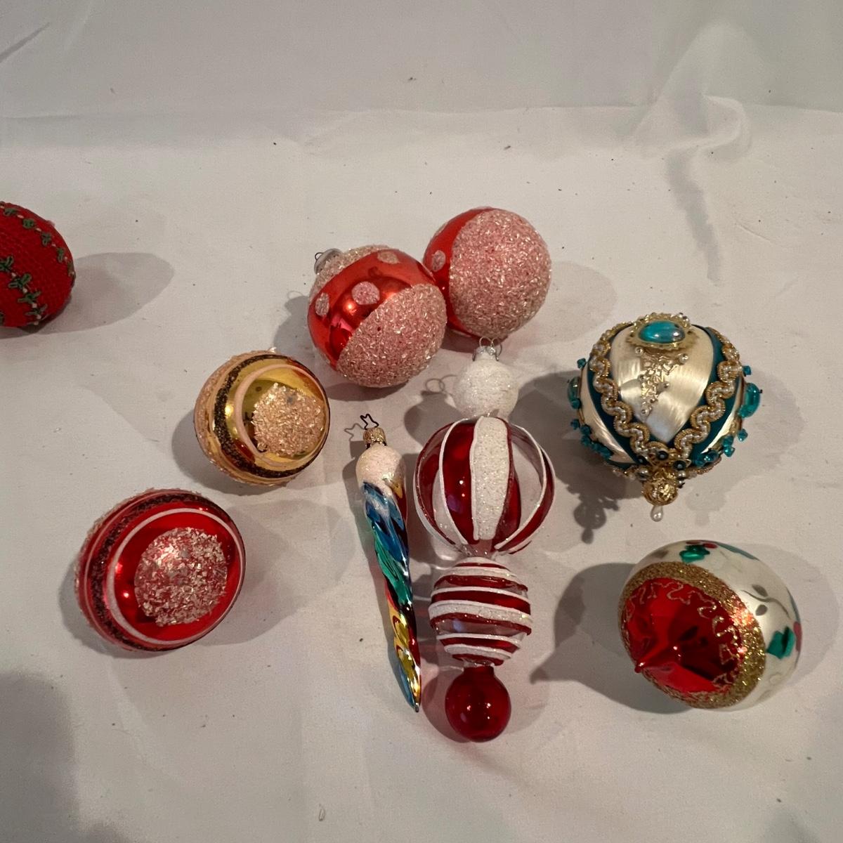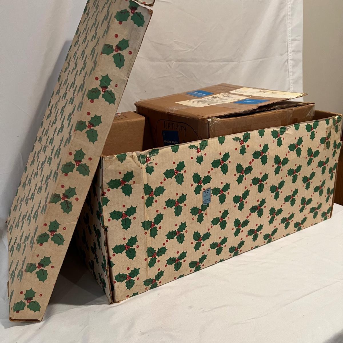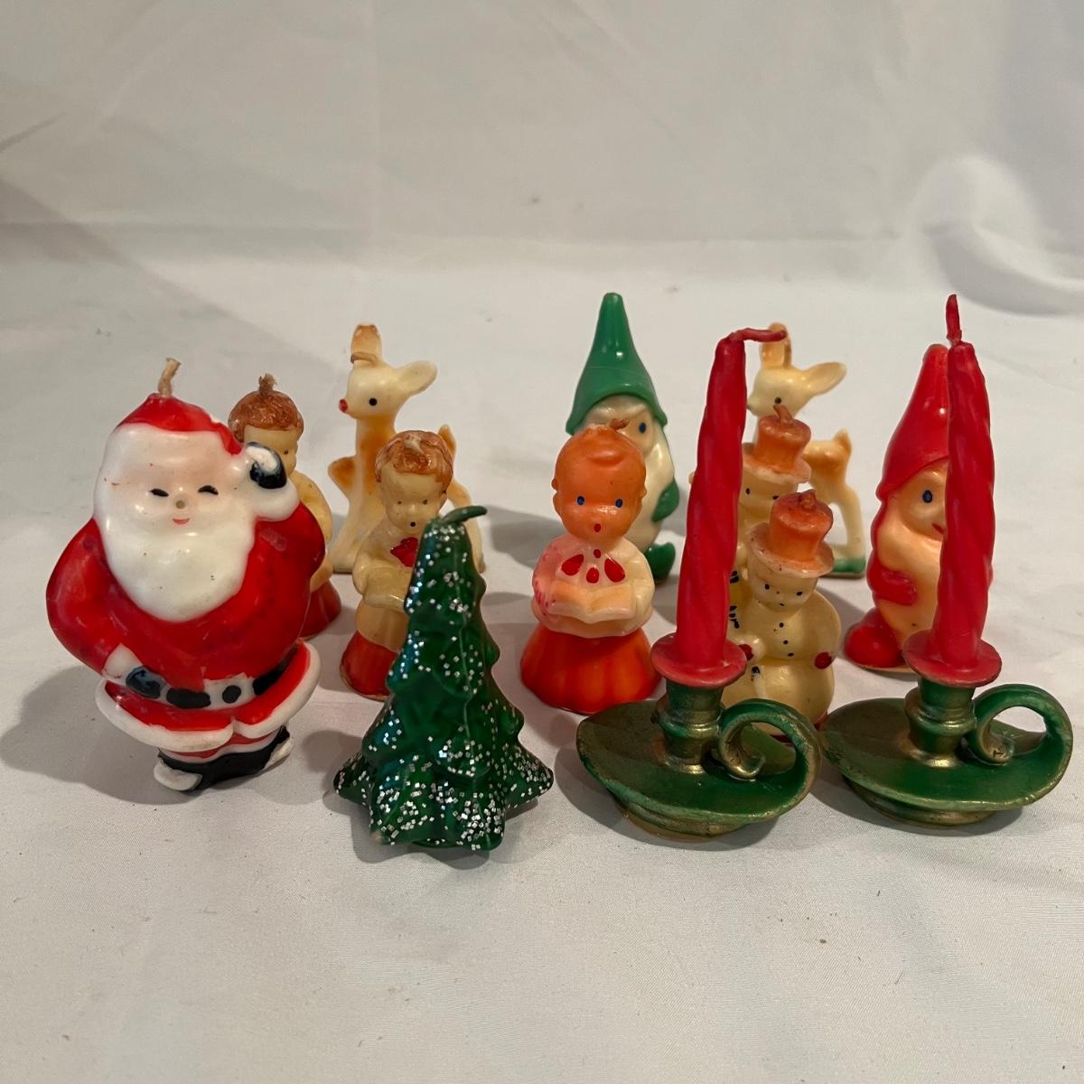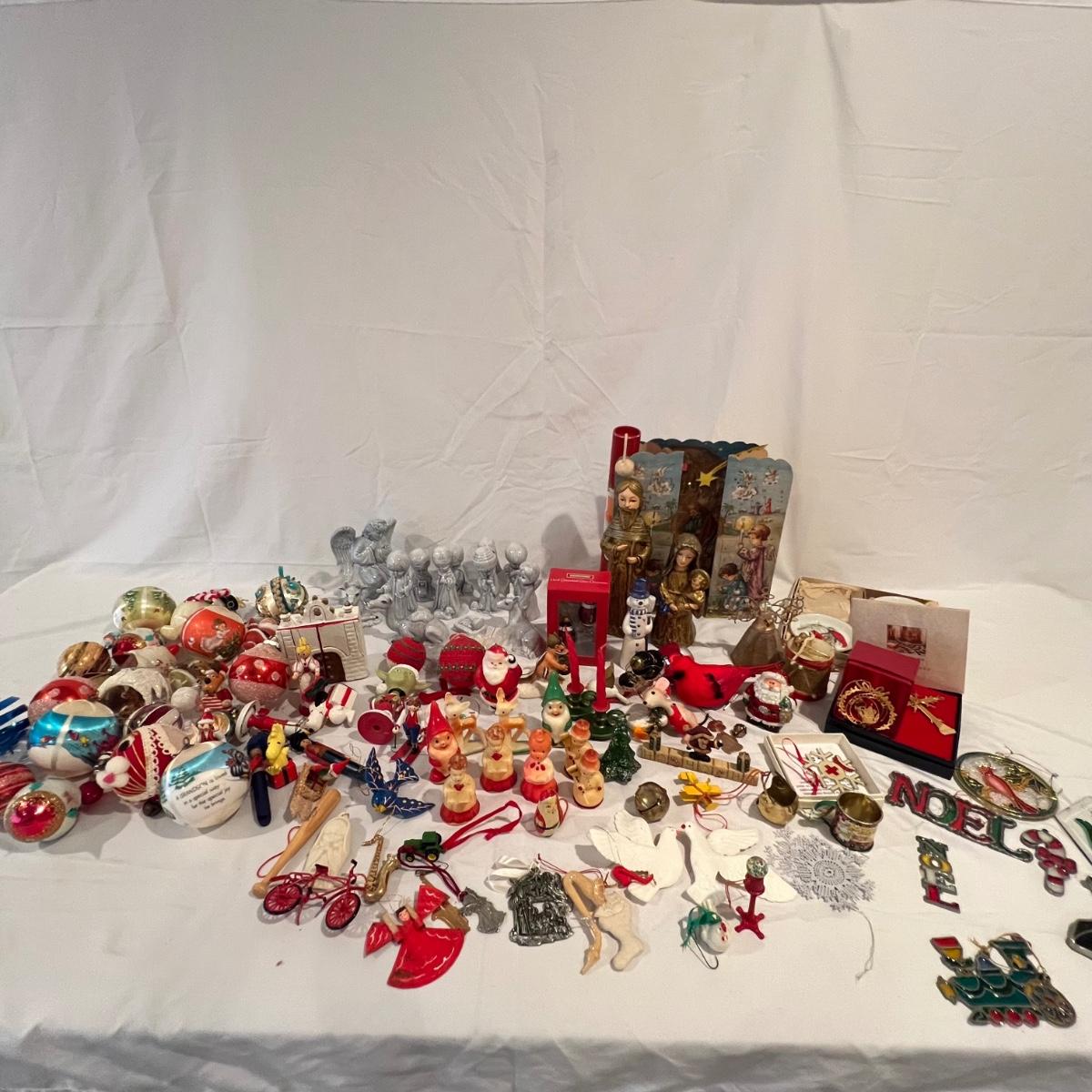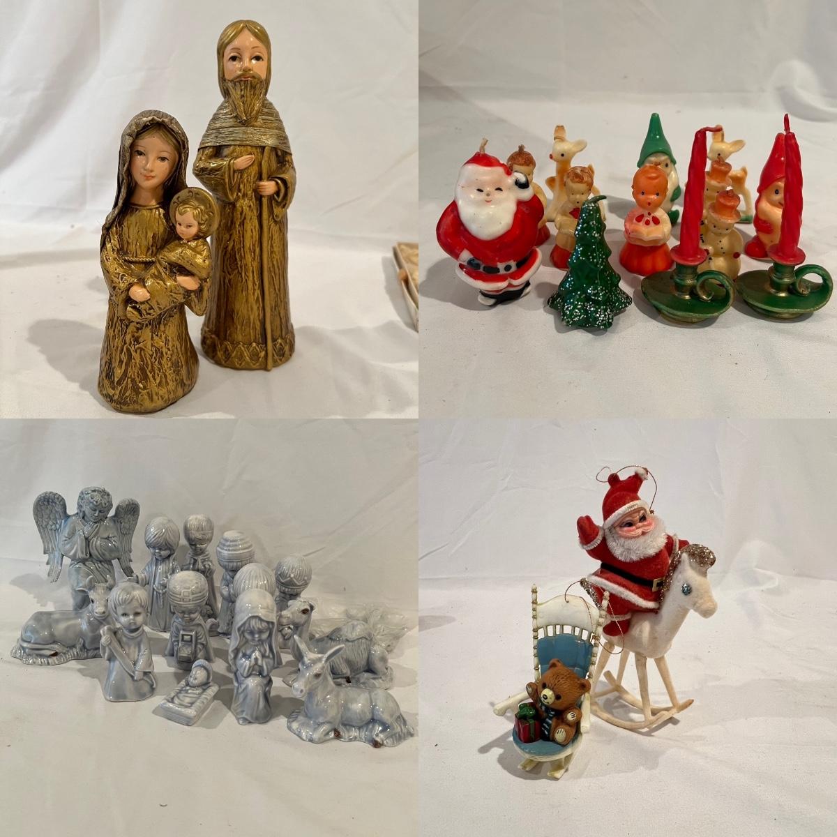 Some fabulous vintage items. Over 50 ornaments - some newer and some vintage. The Mary and Joseph figurines are Schmid Bros. Joseph measures 3”D x 10”H. The ceramic nativity includes 14 pieces; see images as some have different makers marks. The 10 Gurley candles have not been used. Note that Santa does have a chip and he and the tree do not have any identifying stickers.