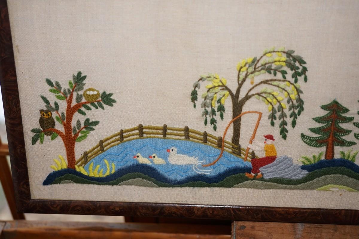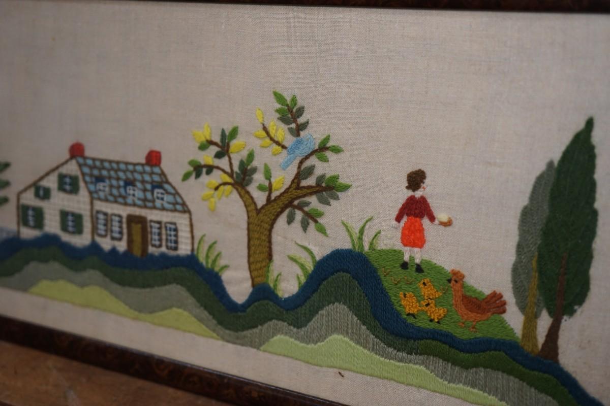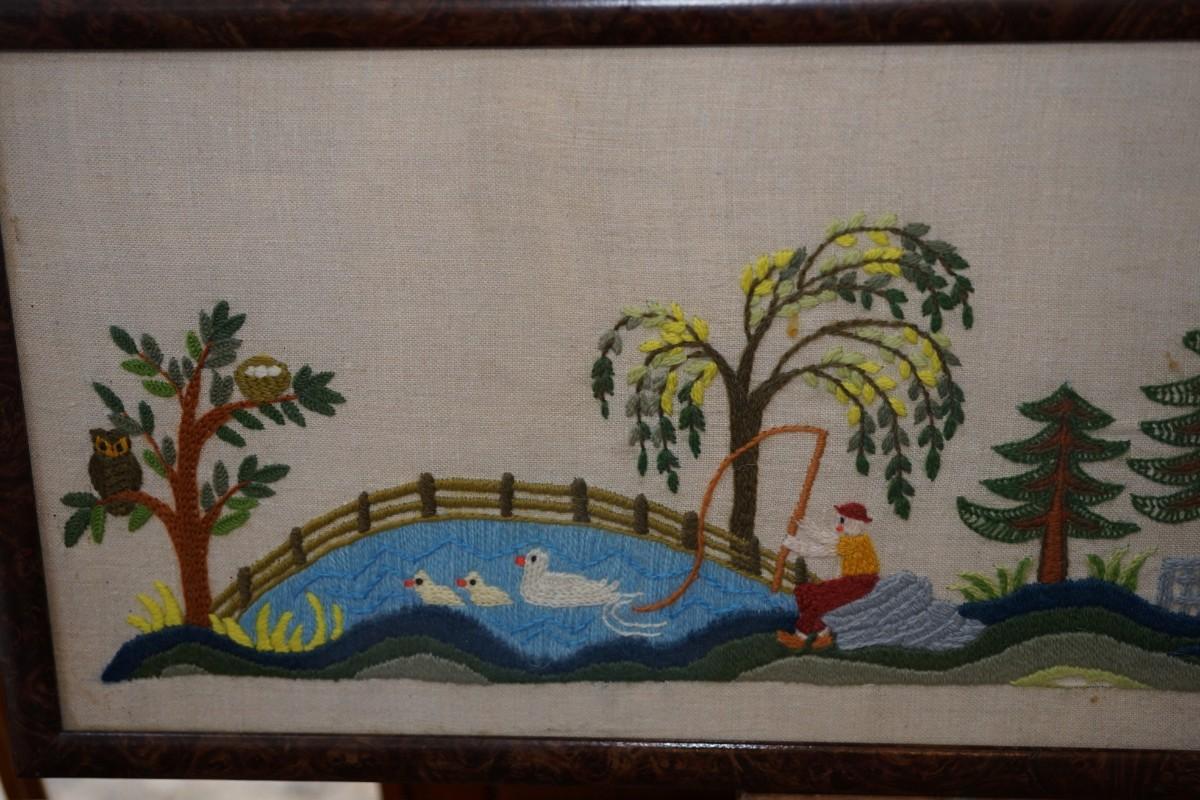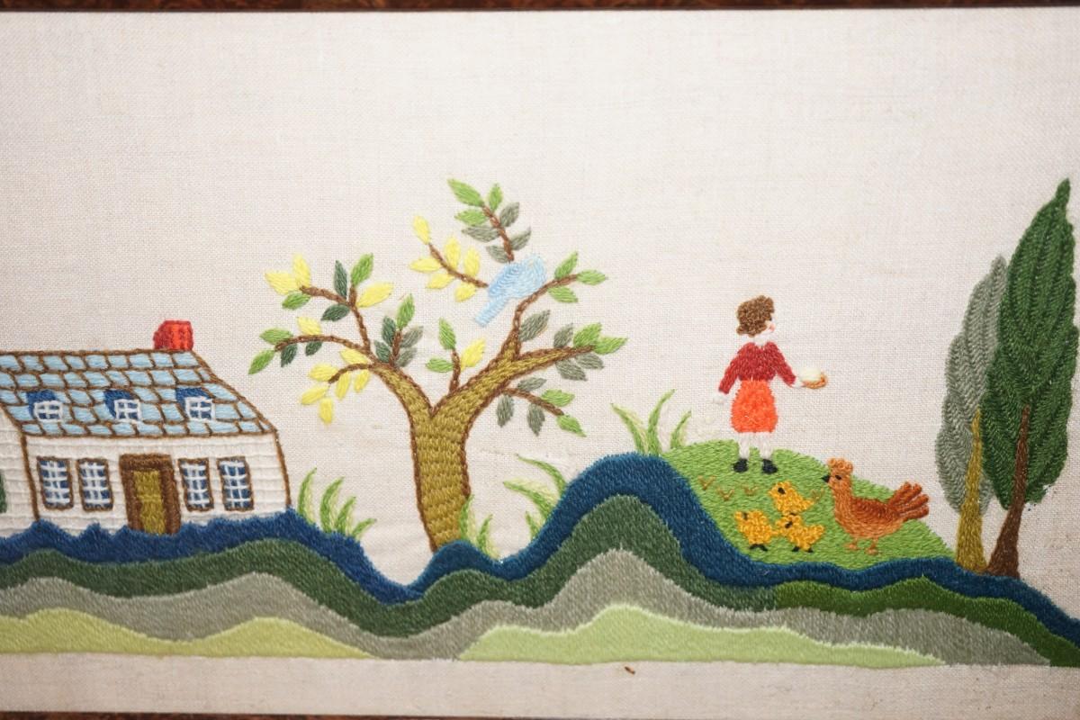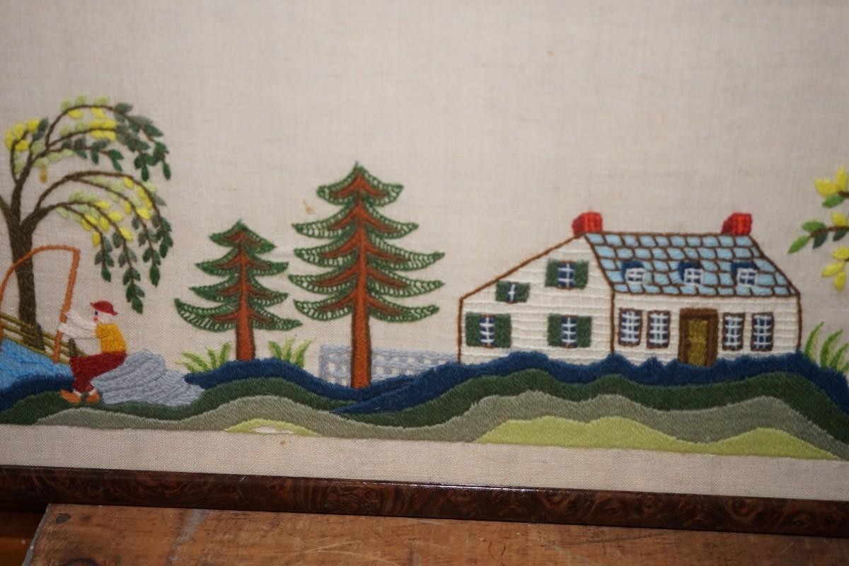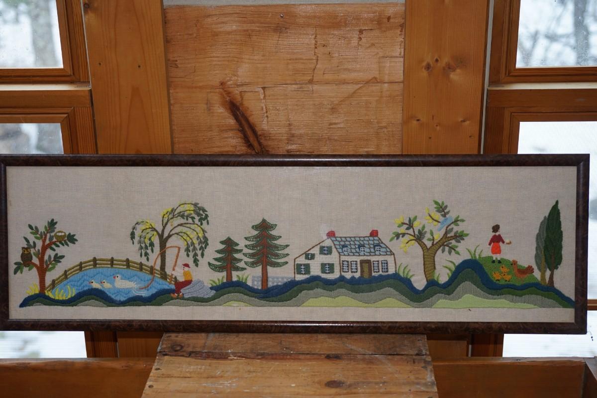 VINTAGE YARD LONG OF YARN ART HOMESTEAD WITH POND -WHIMSICAL