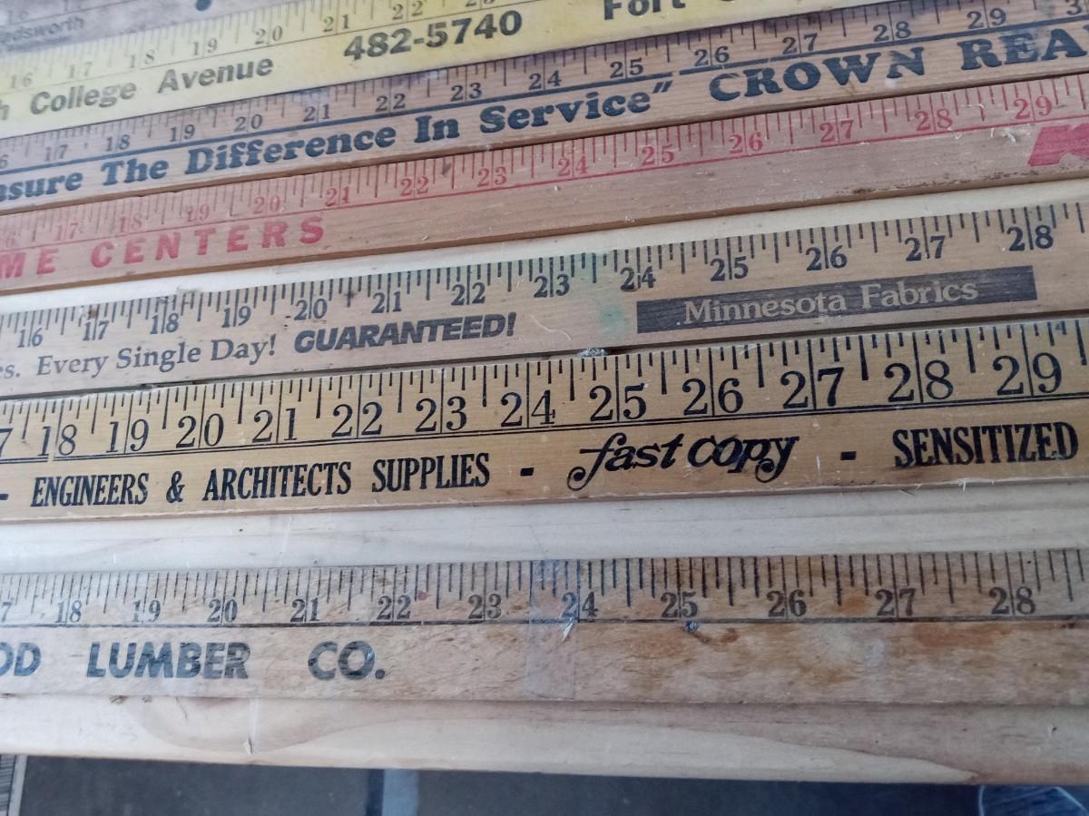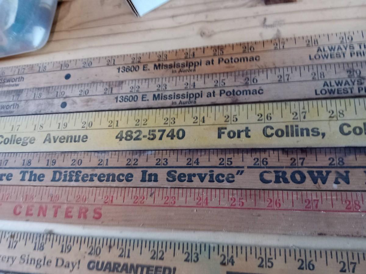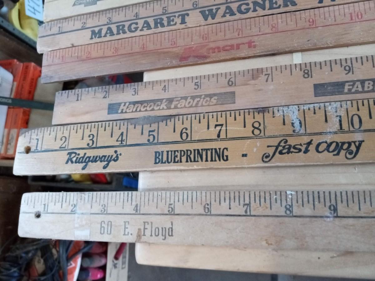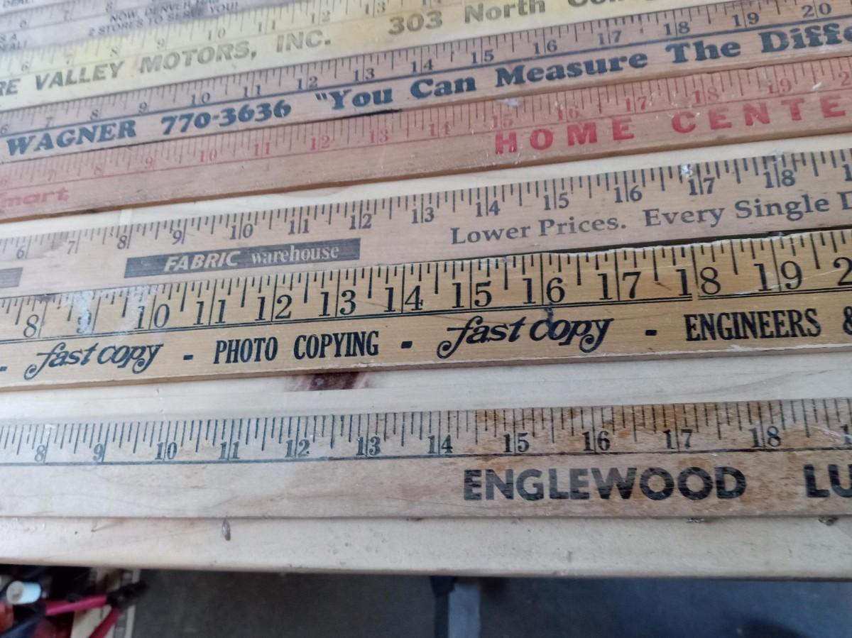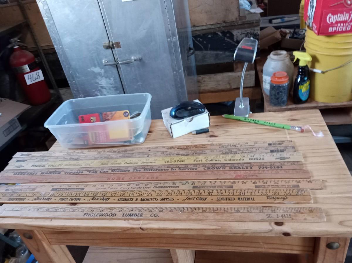 VINTAGE YARD STICKS, DESK CHAIR AND OFFICE SUPPLIES