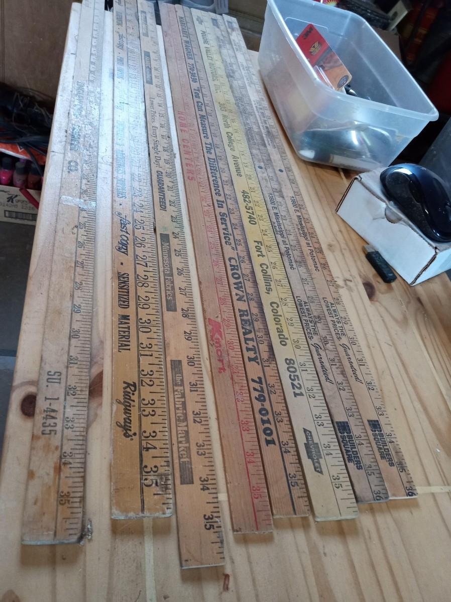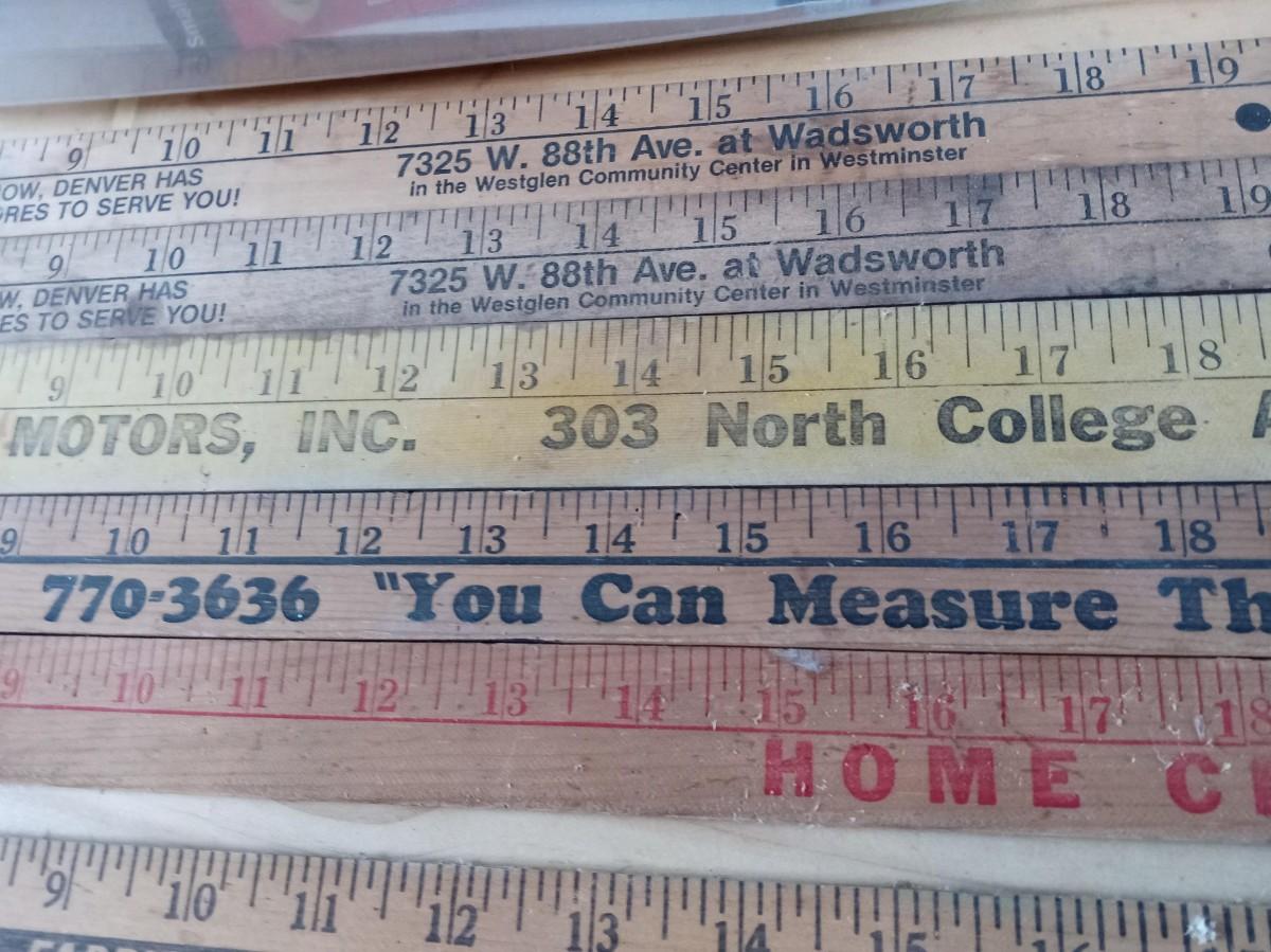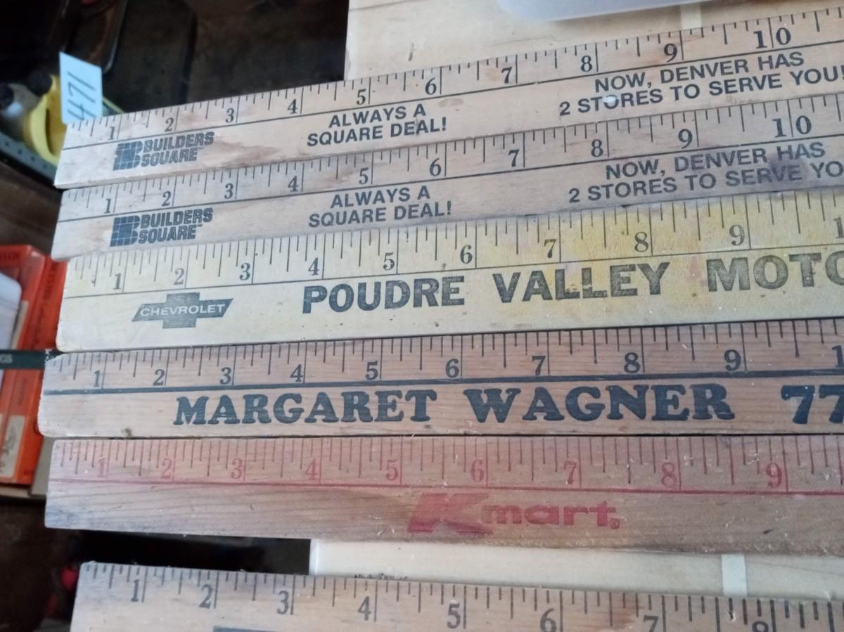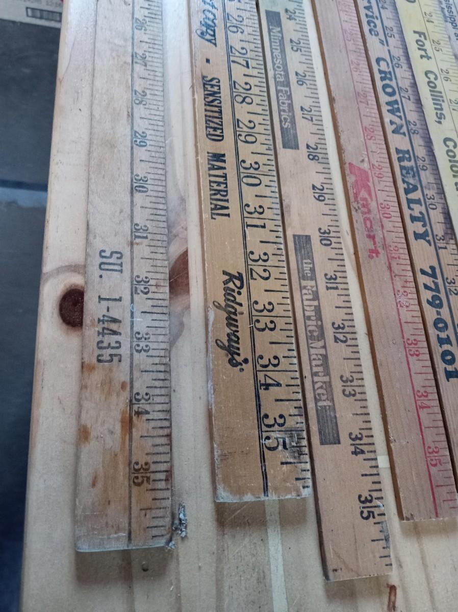 VINTAGE YARD STICKS, DESK CHAIR AND OFFICE SUPPLIES