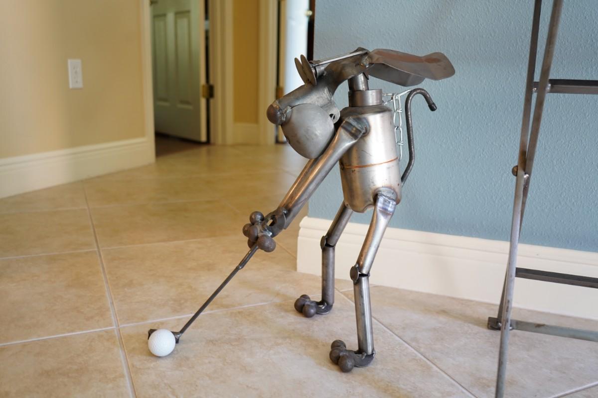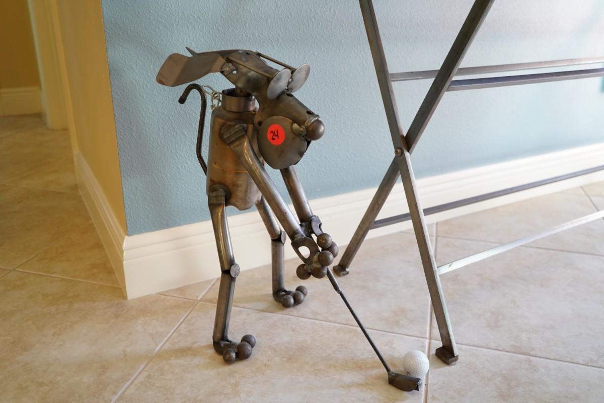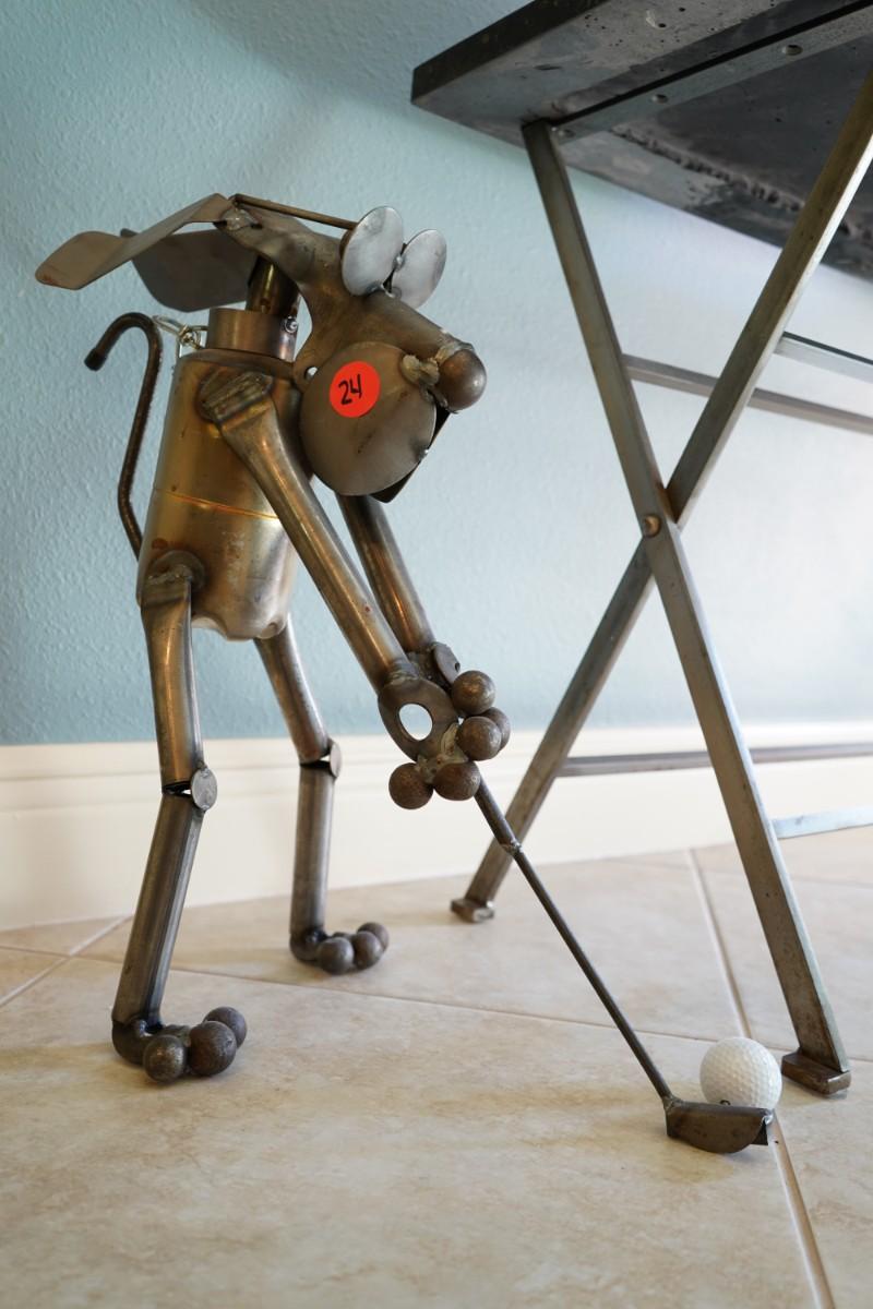 Whimsical Folk Art Welded Metal Dog Golfer - Measures 20W x 11D x 20H.