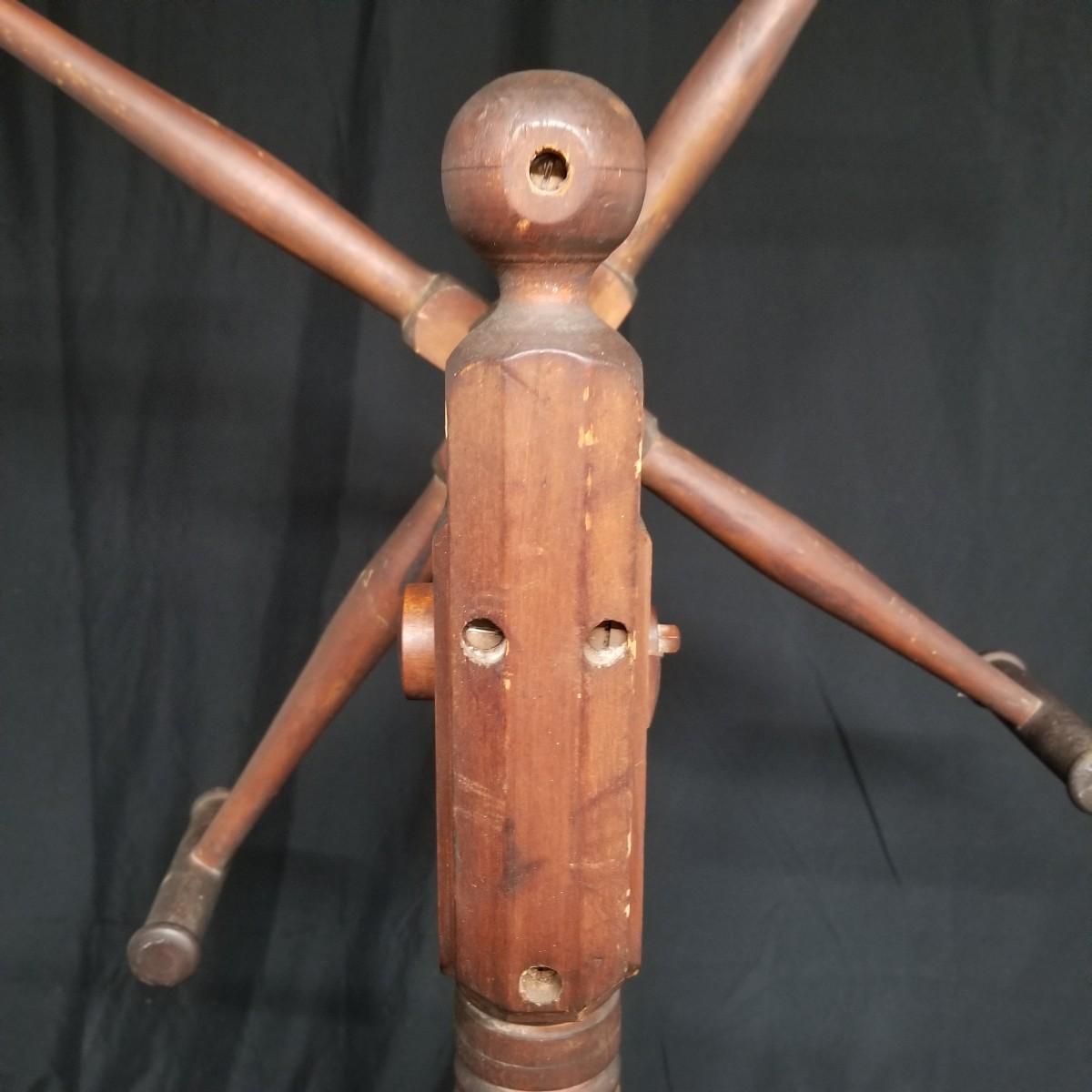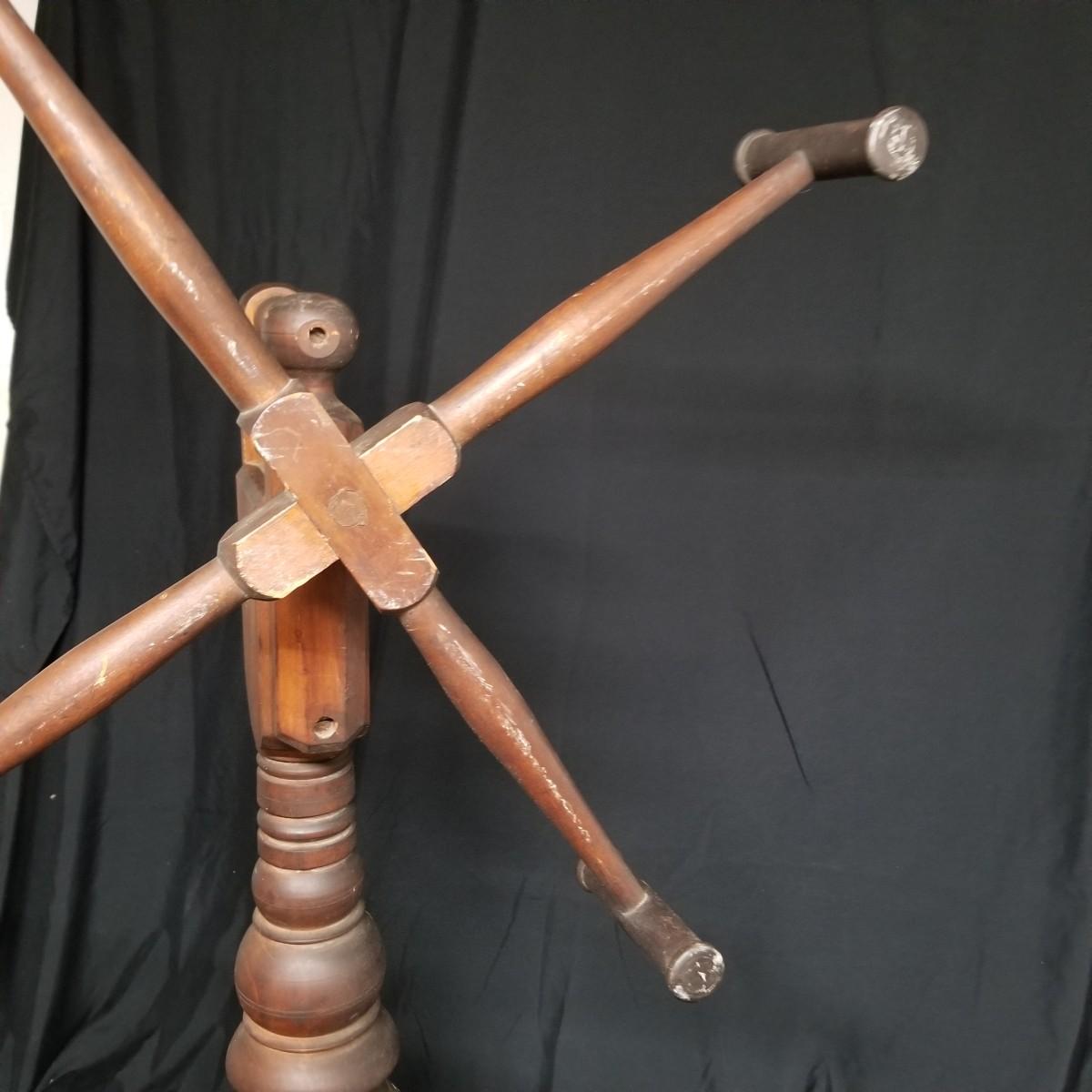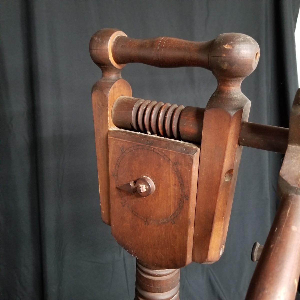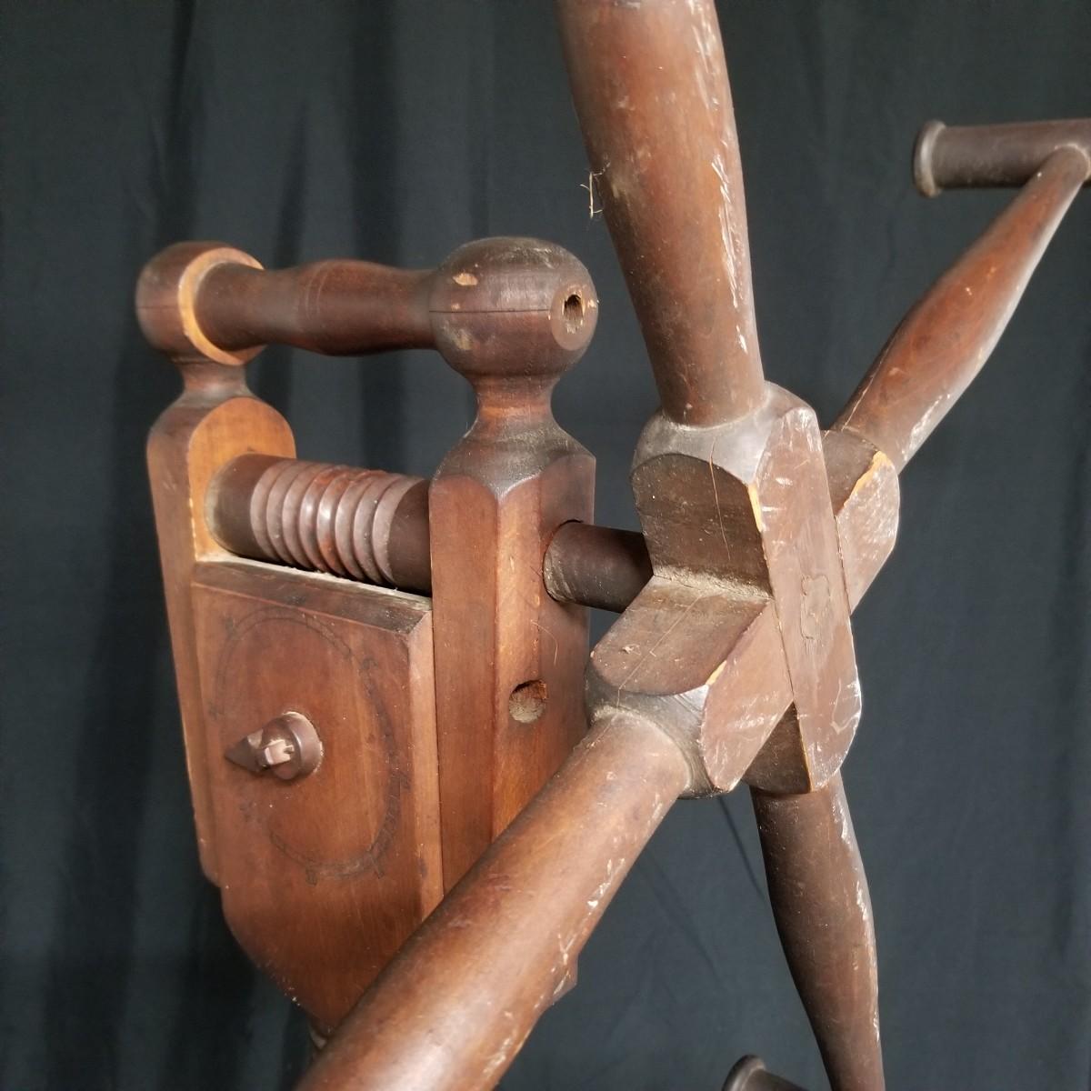 Four arm vintage yarn winder with counter. all wood construction, has tripod feet, wooden gear mechanism to count yardage. Turned column, item is 36" to top of handle, 21" span at base of feet. The arms span is 24". No markings or manufacture name. Item is in good shape, shows some wear. Local pickup only.