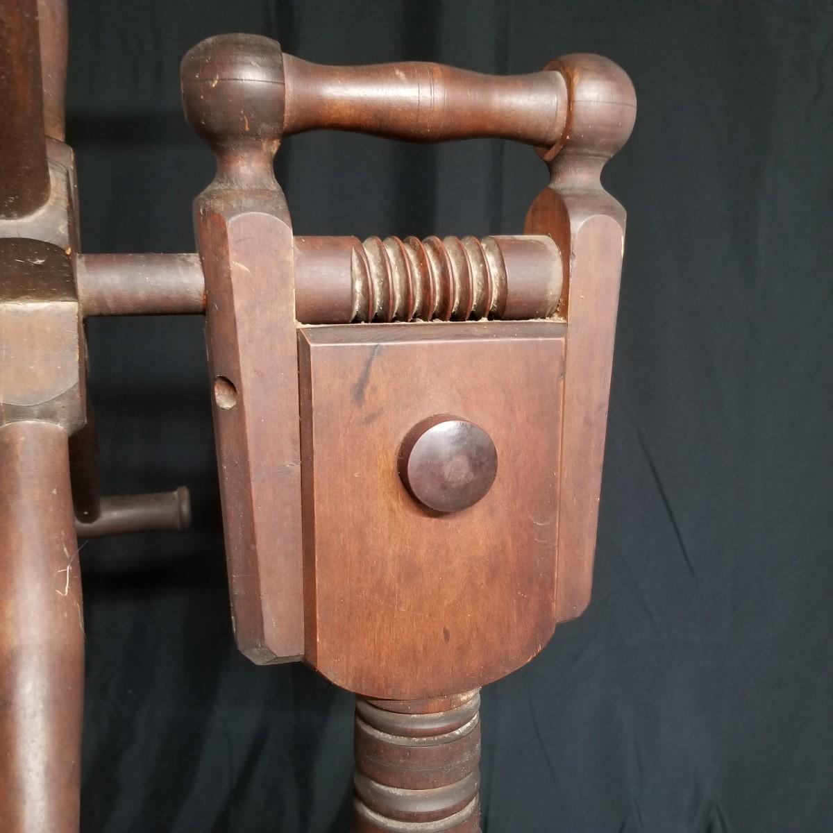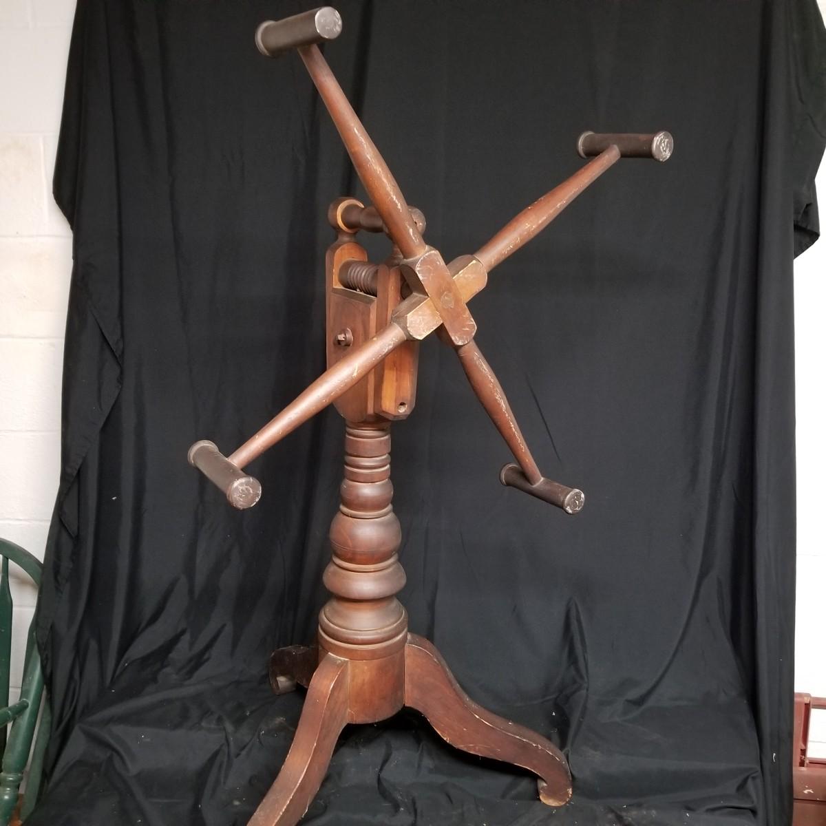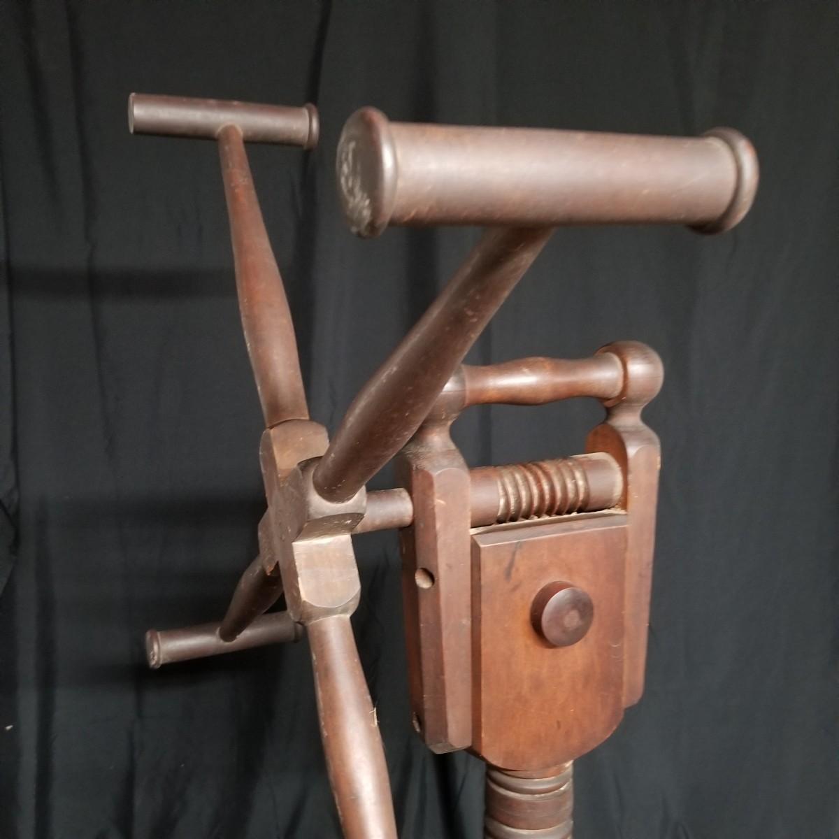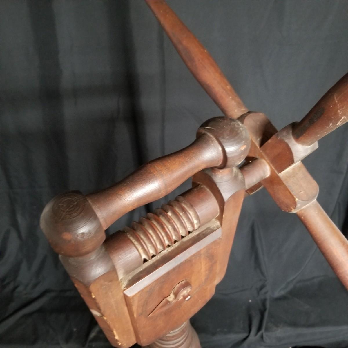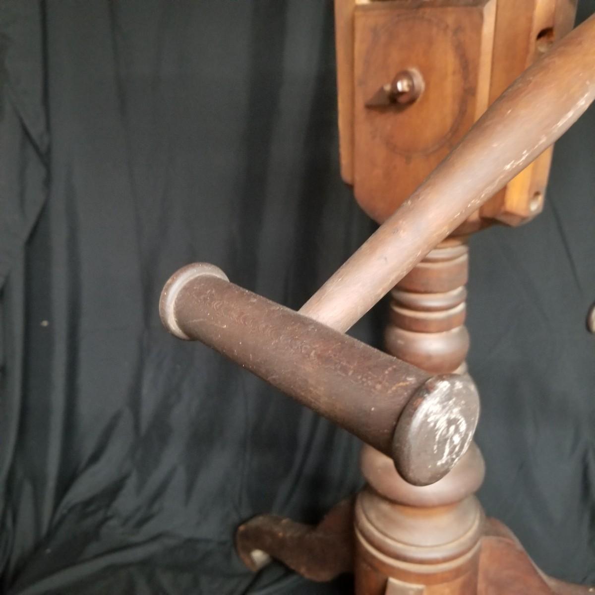 Four arm vintage yarn winder with counter. all wood construction, has tripod feet, wooden gear mechanism to count yardage. Turned column, item is 36" to top of handle, 21" span at base of feet. The arms span is 24". No markings or manufacture name. Item is in good shape, shows some wear. Local pickup only.