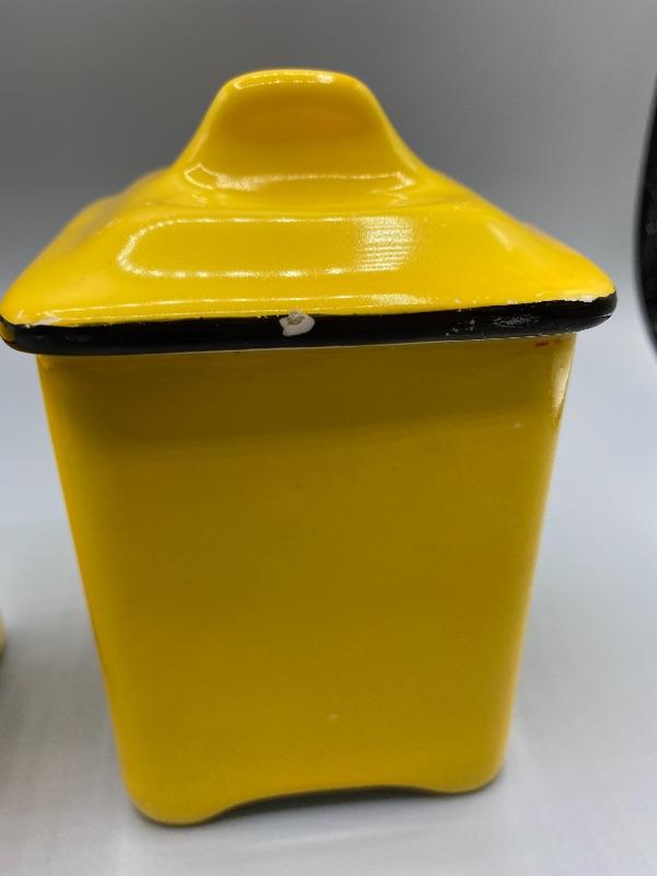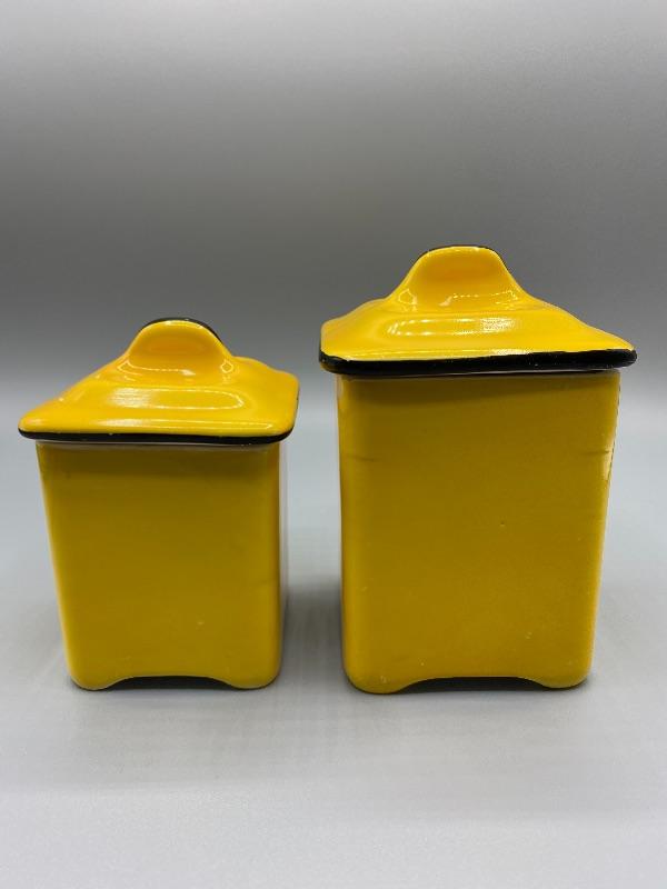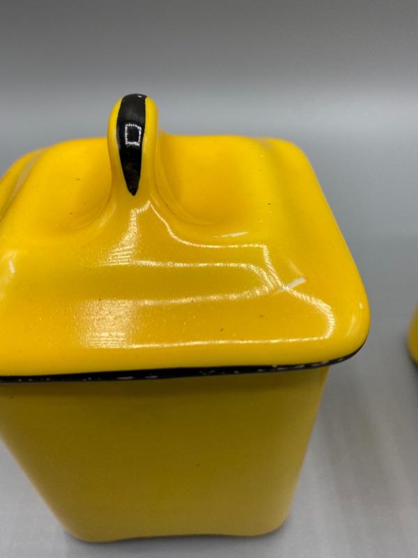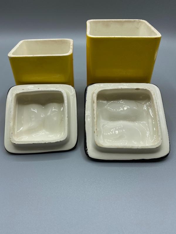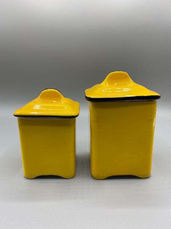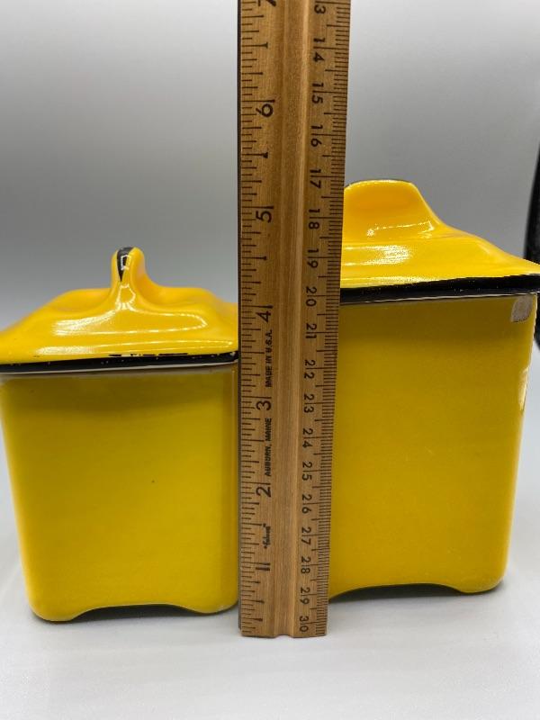Vintage yellow ceramic canisters. Set of two. Black edge. Lidded. There is a couple minor chips here and there. Display nicely. Marked with the letter “H” and Roman numerals on the bottoms.