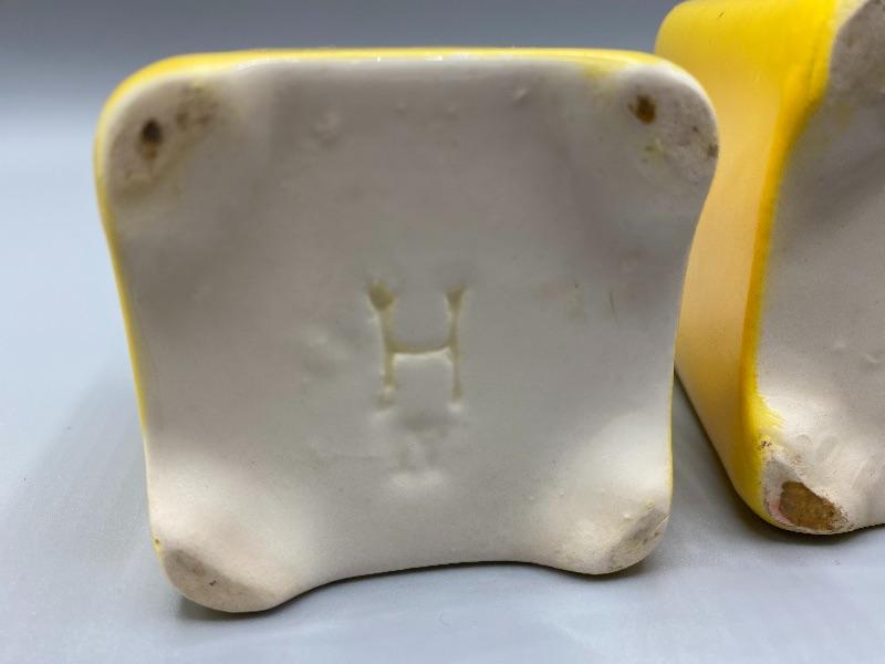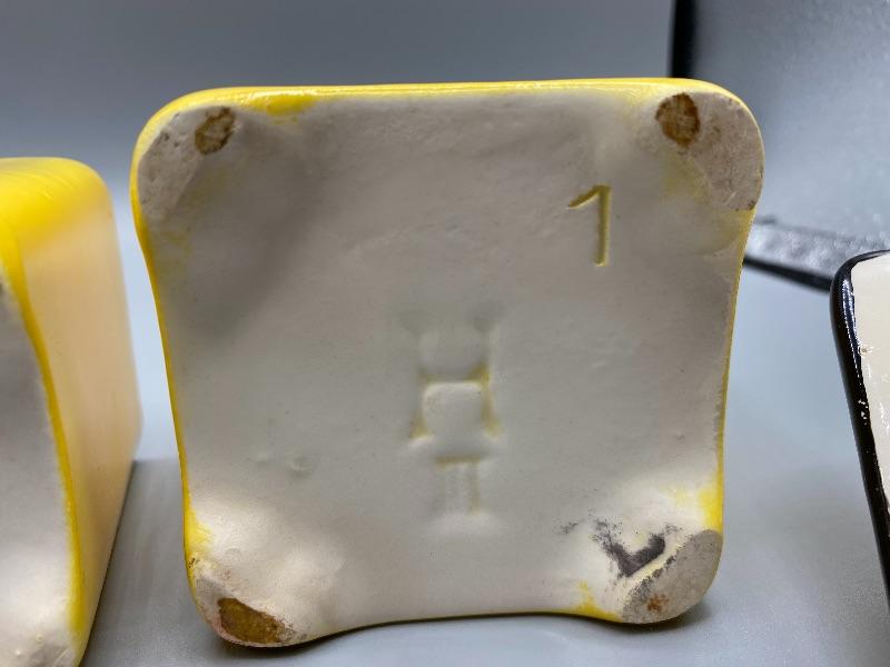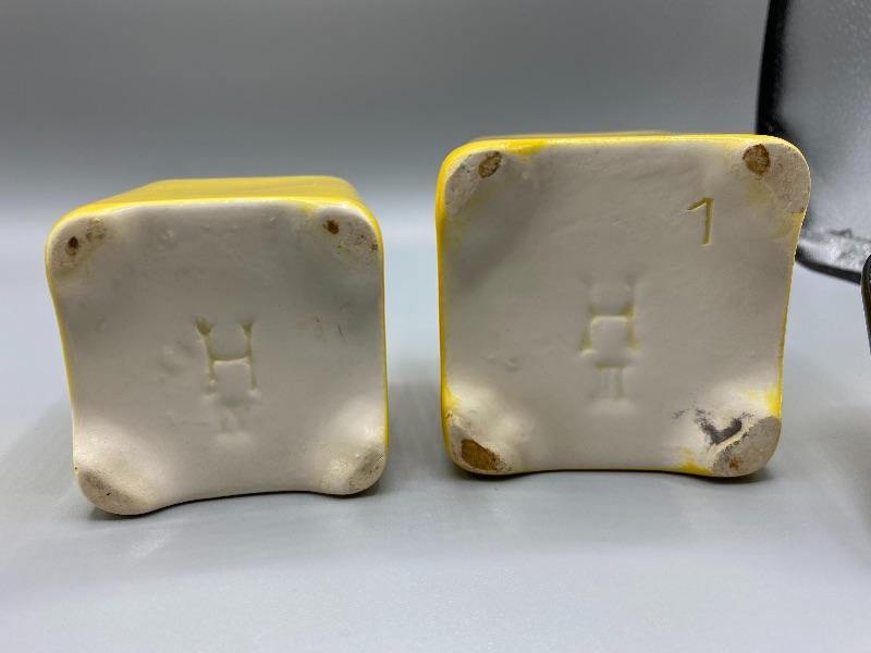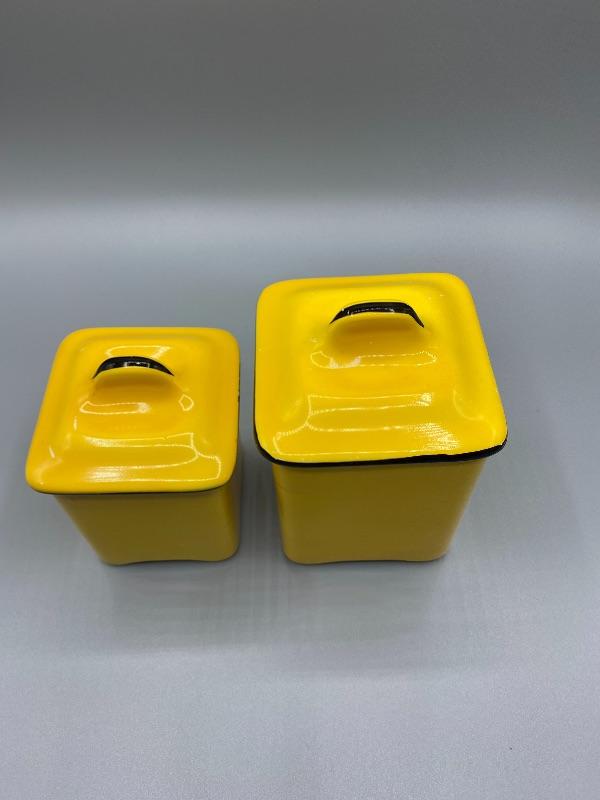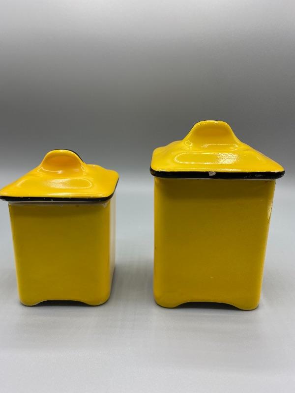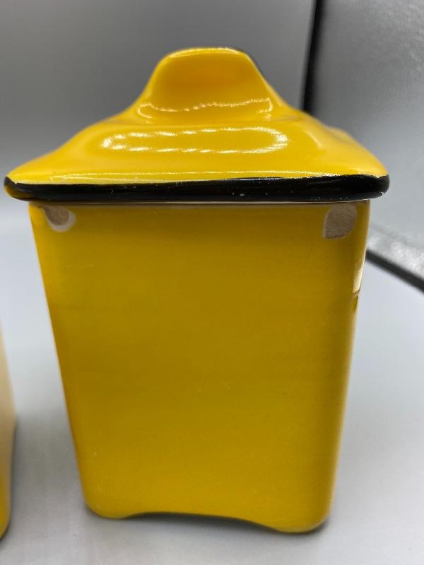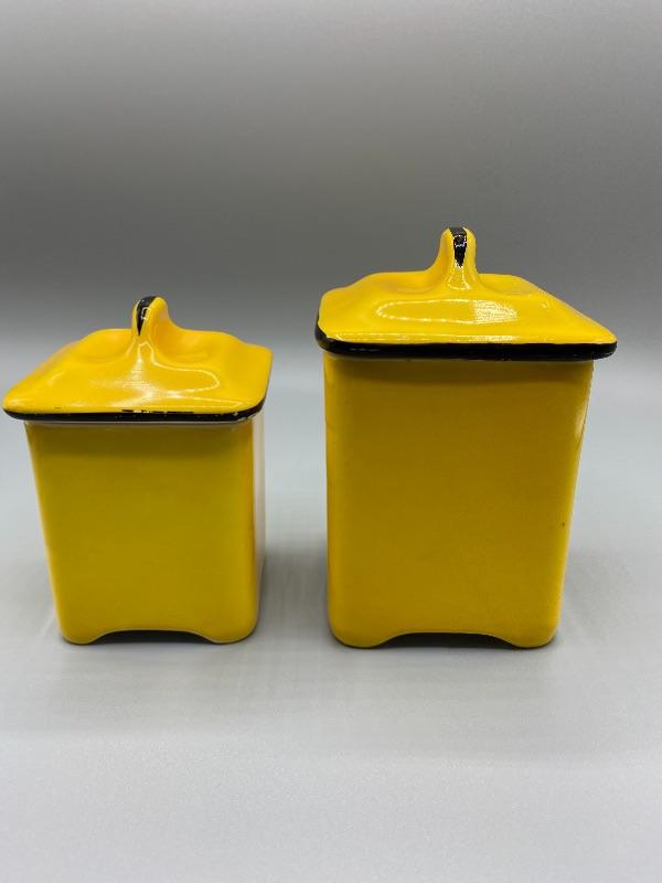 Vintage yellow ceramic canisters. Set of two. Black edge. Lidded. There is a couple minor chips here and there. Display nicely. Marked with the letter “H” and Roman numerals on the bottoms.