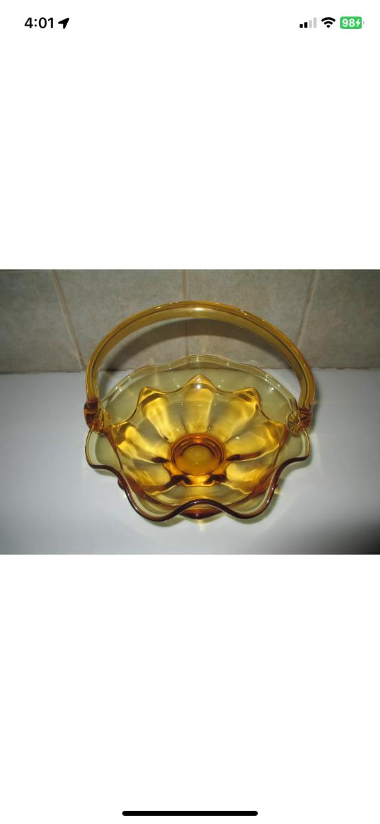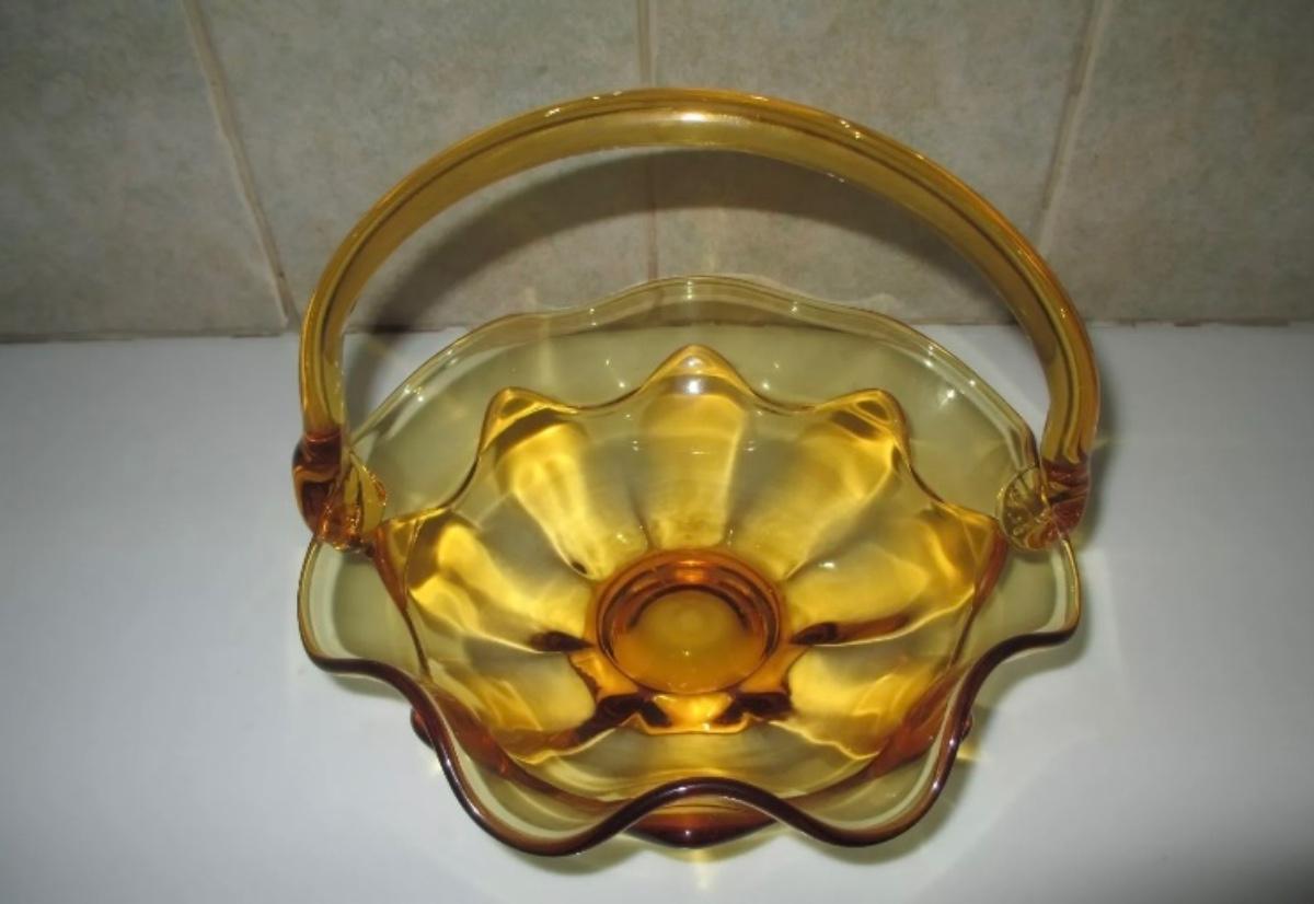 Vintage beautiful deep yellow depression-glass basket with handle, 7-1/2 T x 8-1/2 dia.