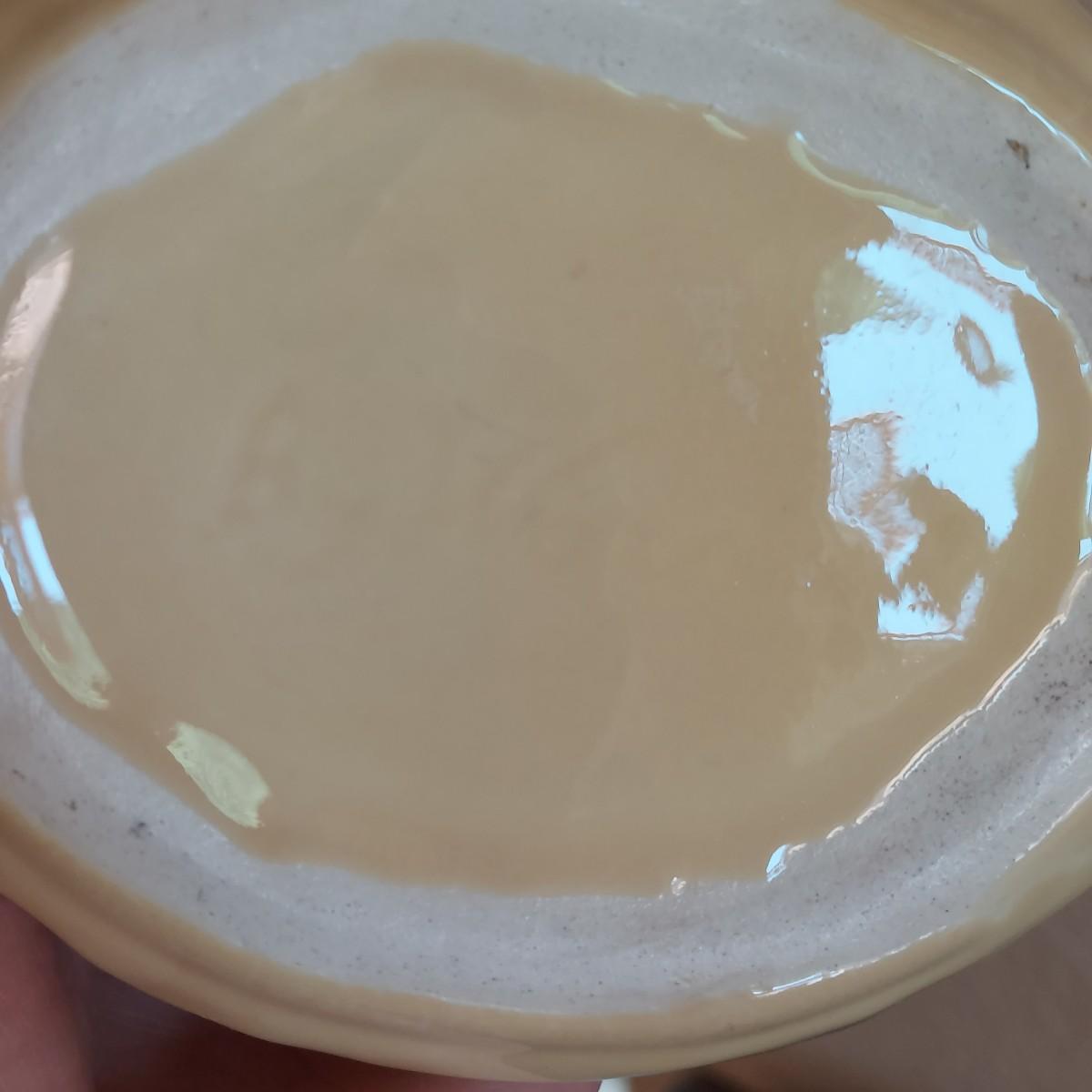 Six pieces of collectible pottery with a light yellow glaze in various sizes. Included are a McCoy pitcher that is 5" tall. A large Haegar dish that is 9" across with an 8" opening. A small basket piece has a bottom signature stamped that is not legible. A Cookson Pottery footed piece is stamped CP 92 USA. The rectangular basket piece is stamped 350 USA. And the Oxford Ware small bowl. Shipping available.