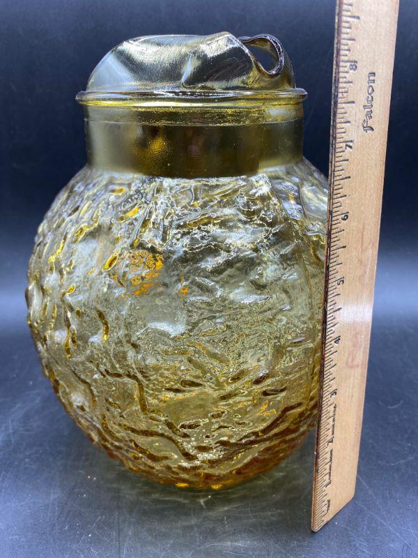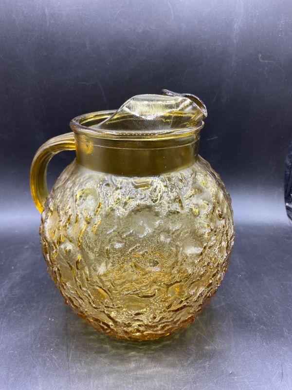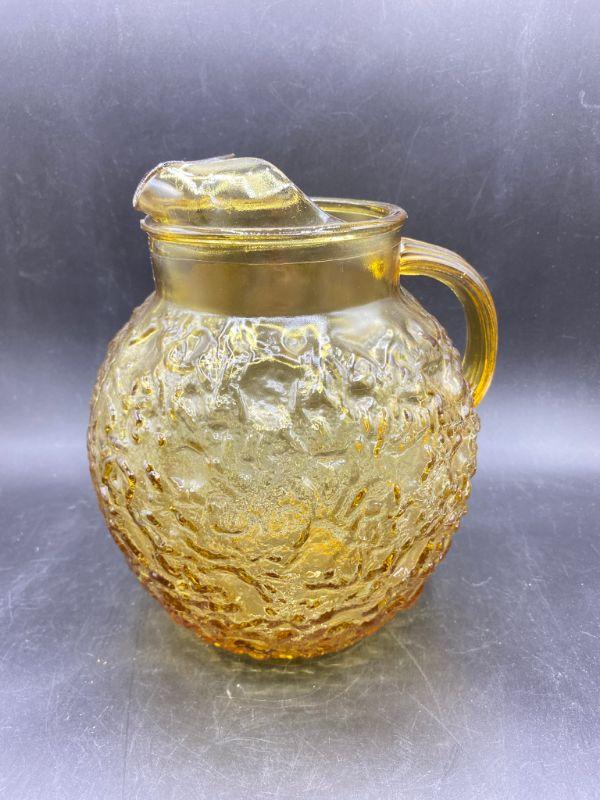 Vintage yellow gold glass water pitcher. Textured embossed glass. Good size almost 9" tall. Great condition.