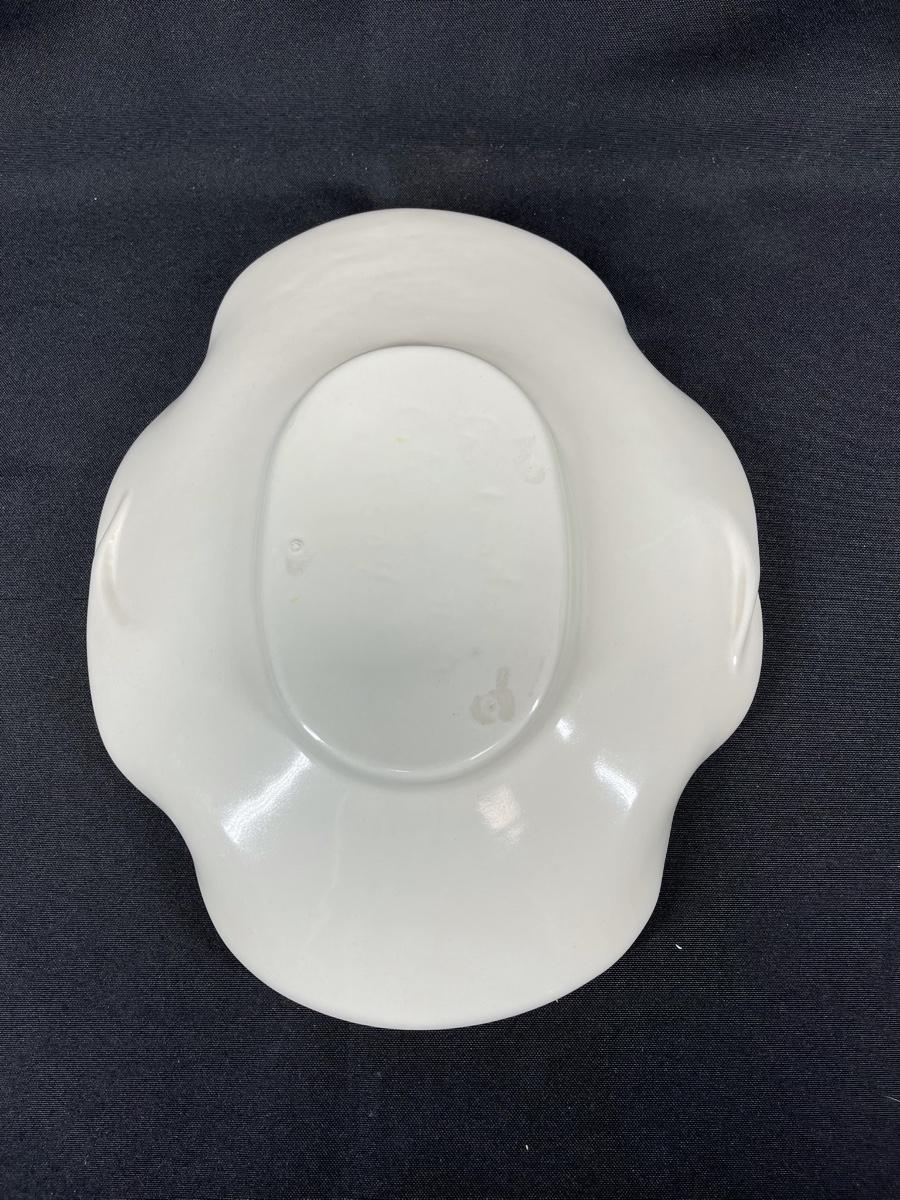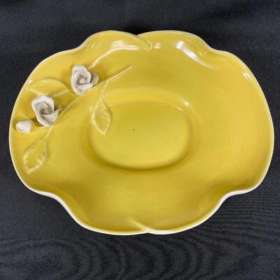 Sunshine yellow Haldeman Caliente pottery dish with white roses. Very shallow to be a bowl. Displays great. About 11" size. In good condition.