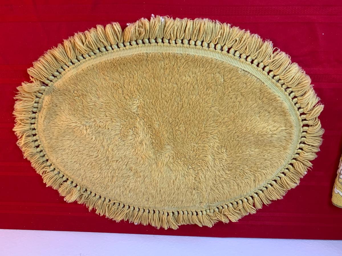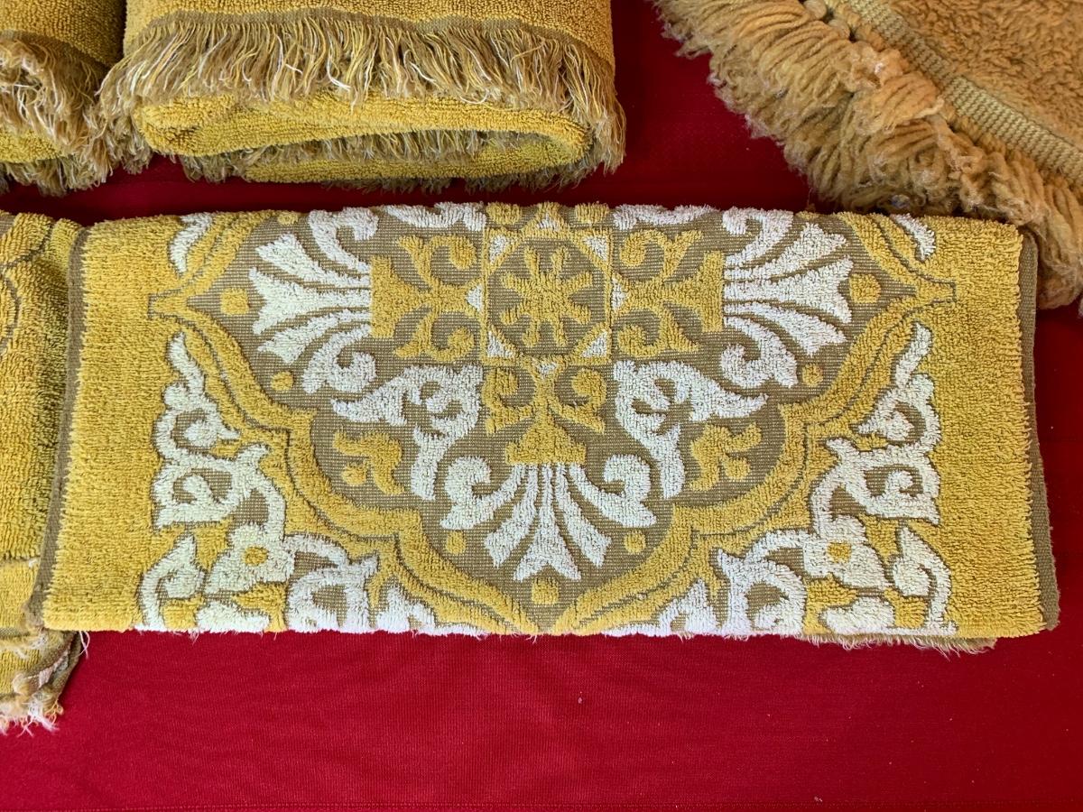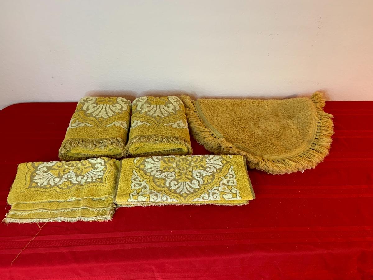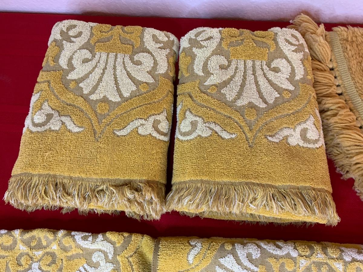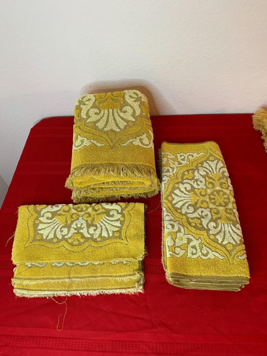 2 body towels, 3 wash cloths, 2 hand towels and one small rug (34 inches by 25 inches). All in good condition with normal wear.