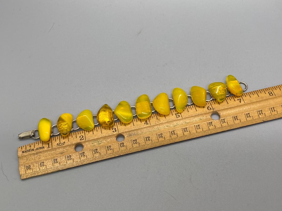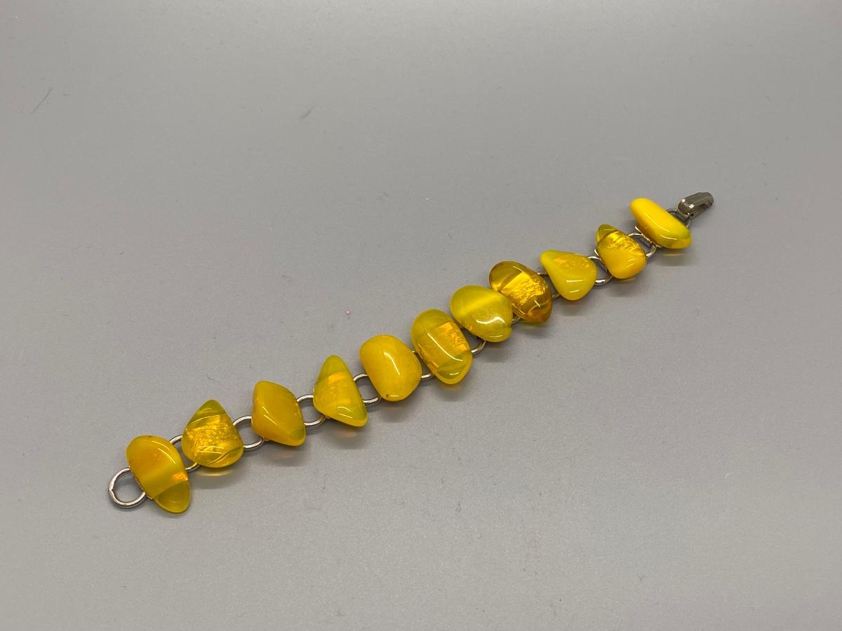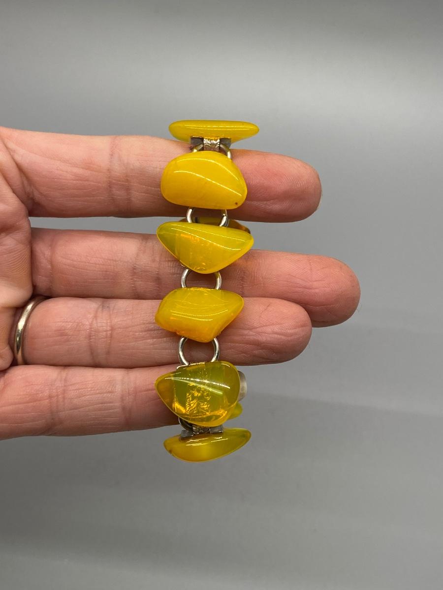 Vintage yellow faux polished stone bracelet. Silver tone metal with lucite stones. Unbranded. Good condition. About 7" length.