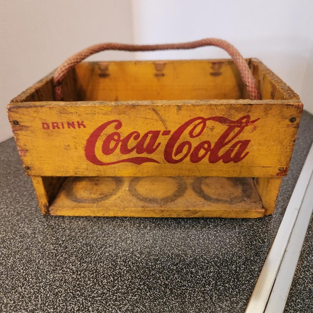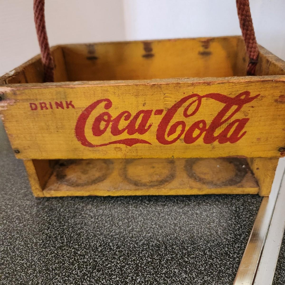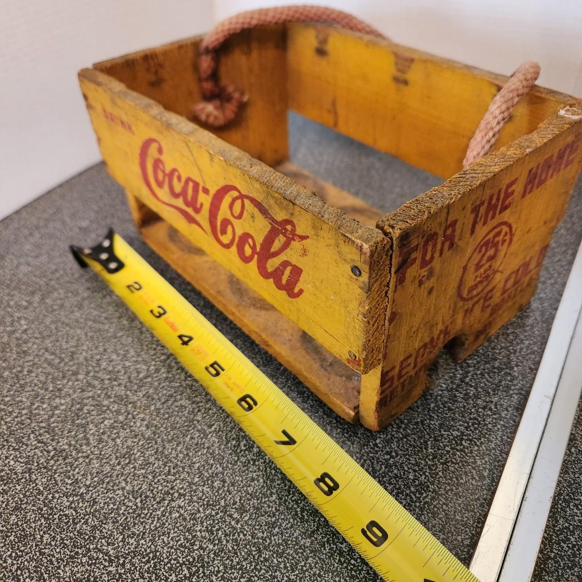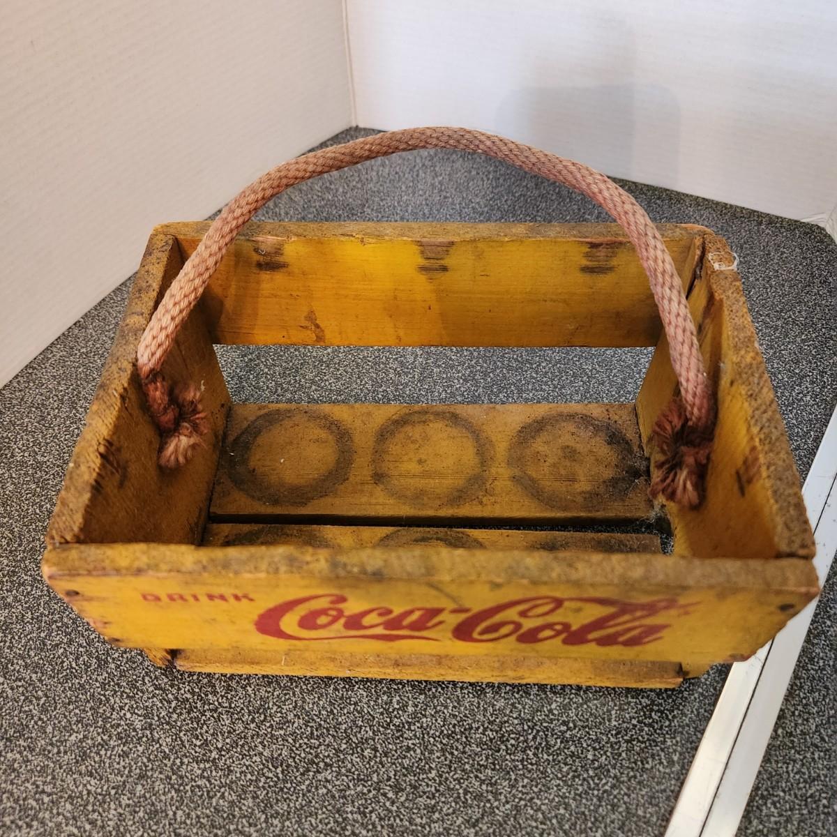 Vintage Yellow Red Coca-Cola Wooden 6 Pack Crate w Rope handle