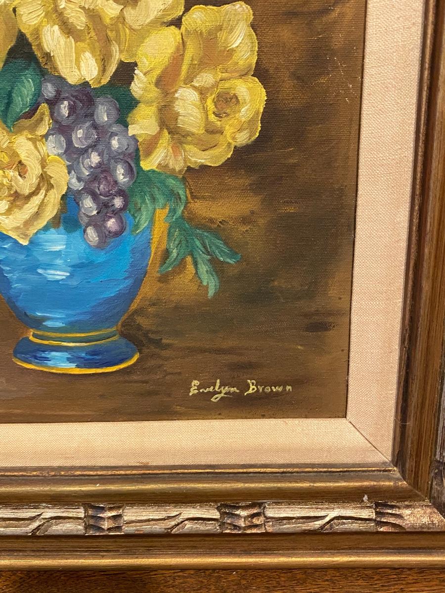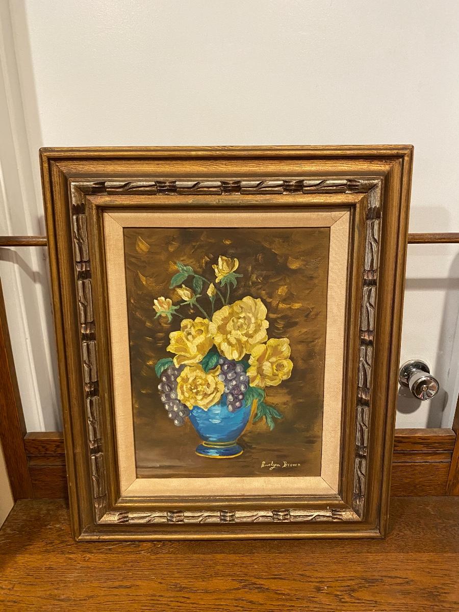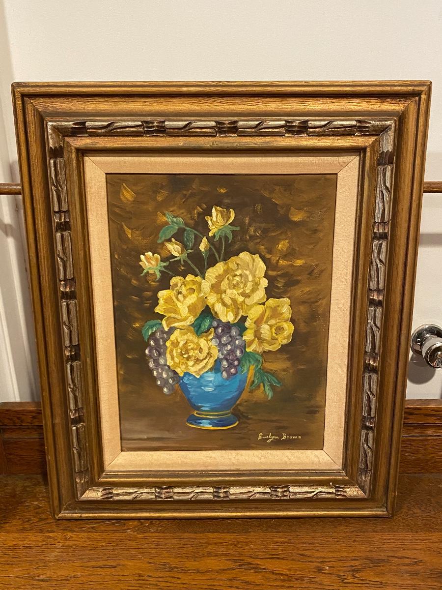 Vintage yellow rose oil painting. Yellow roses in blue vase painted by previous owner. Large 24 inch size.