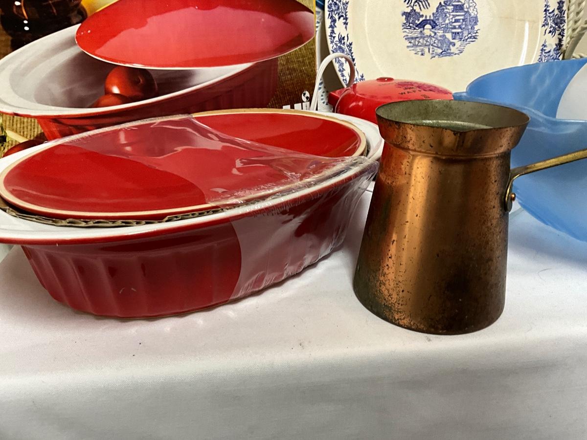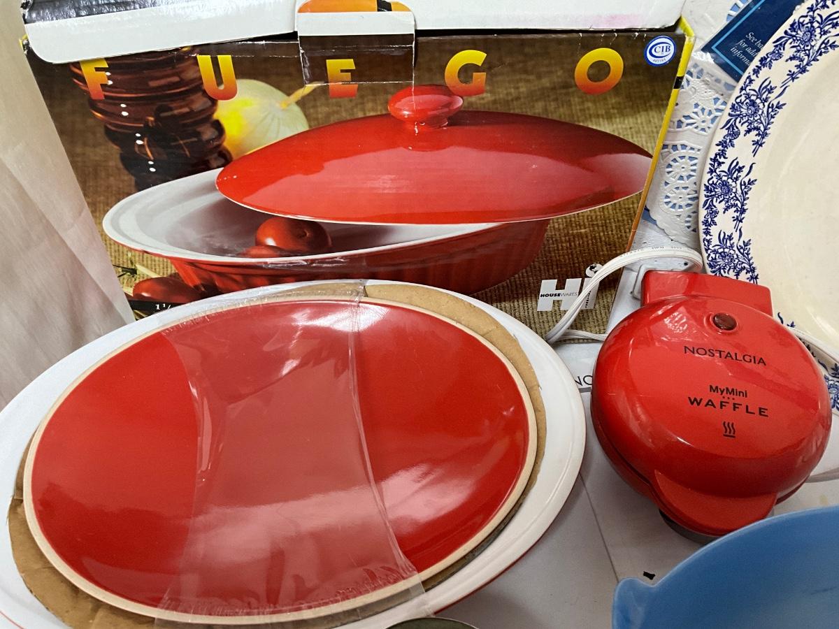Vintage, yet new Fuego 1 1/2 qt Casserole dish, Copper serving cup, Mini waffle maker,