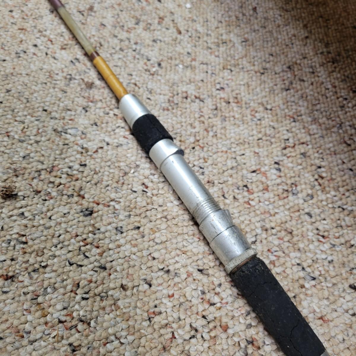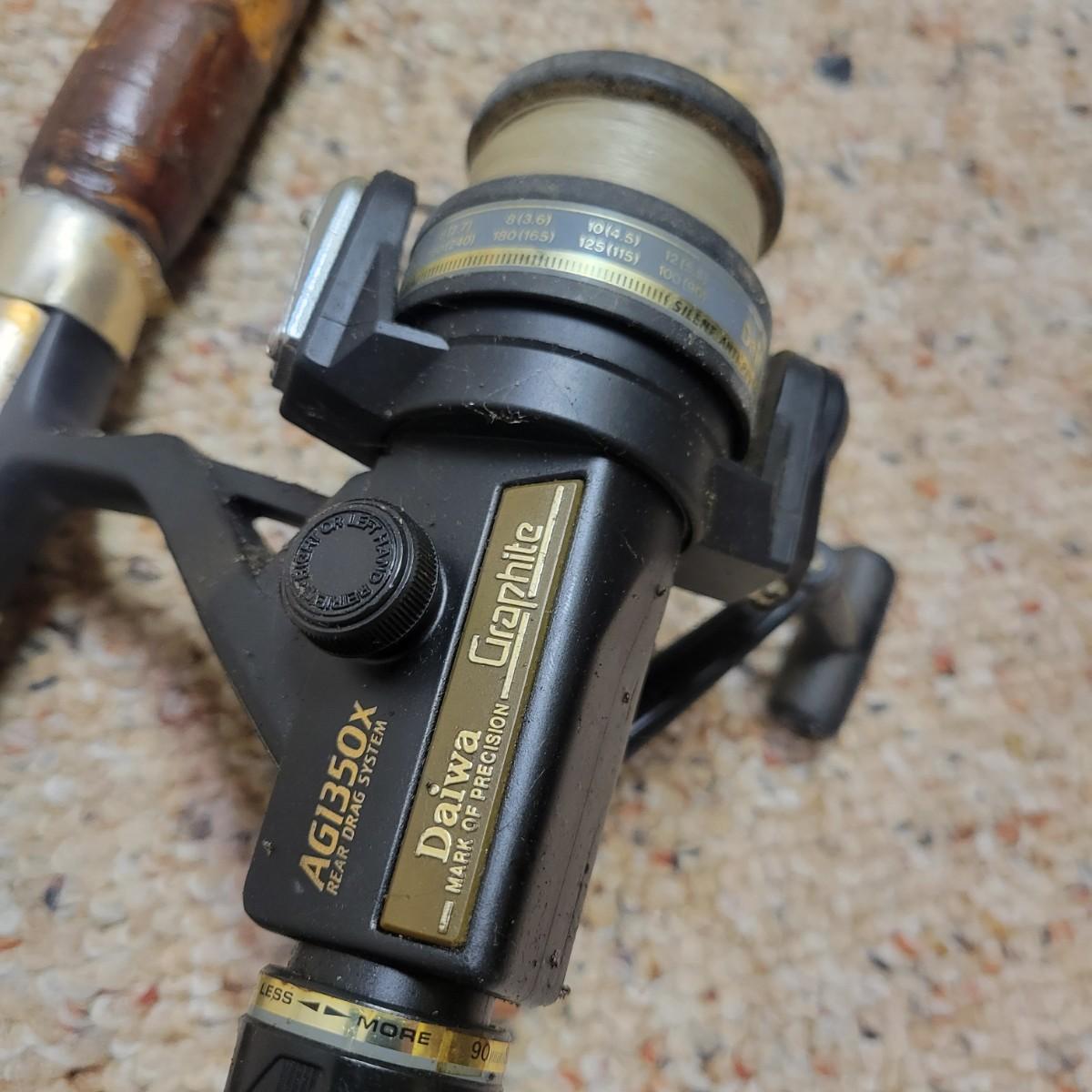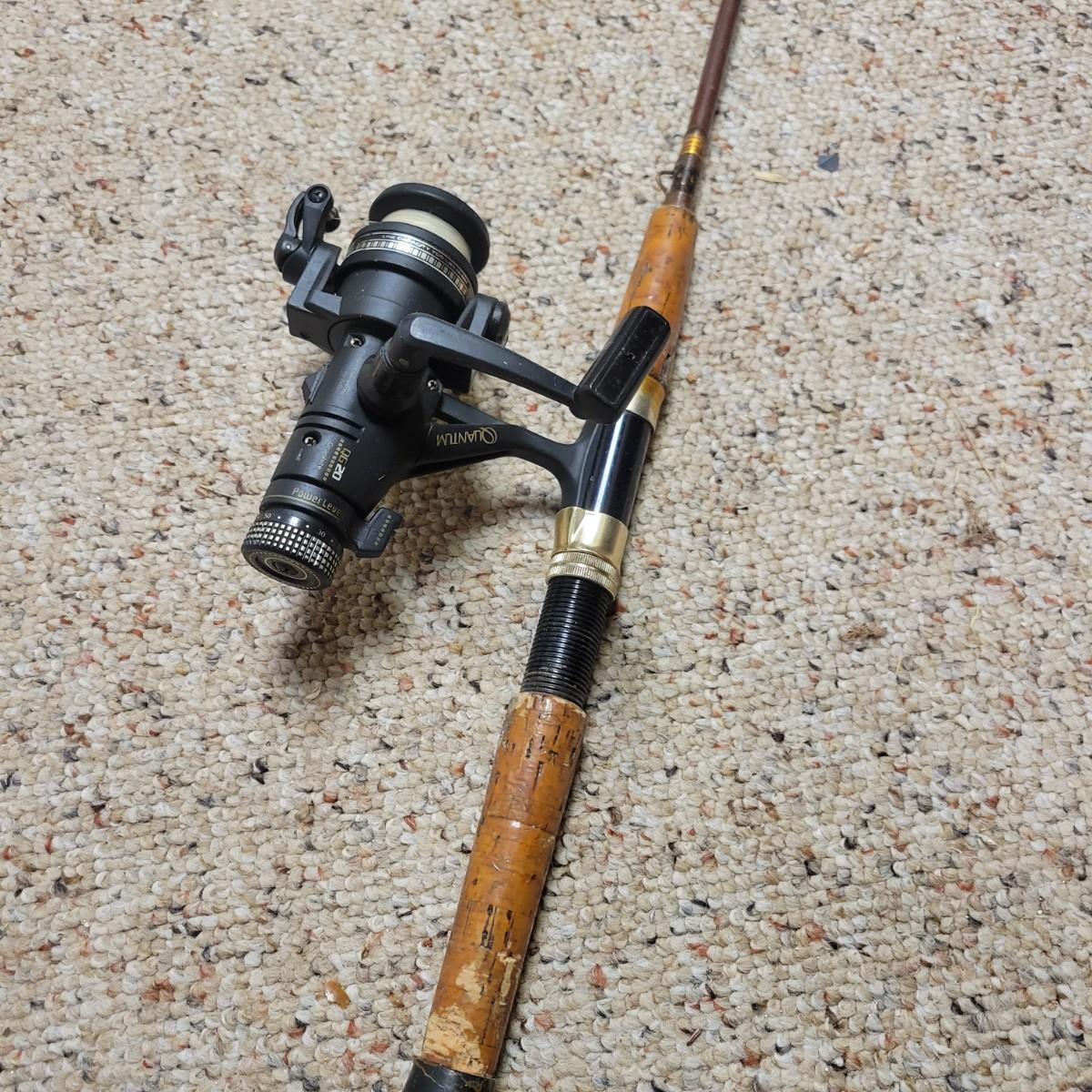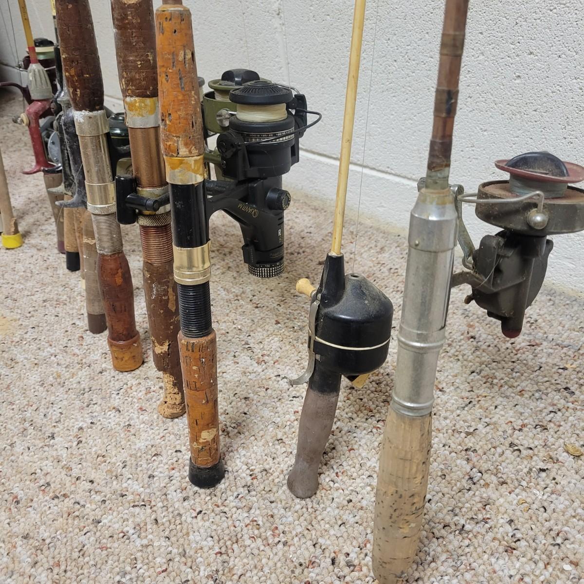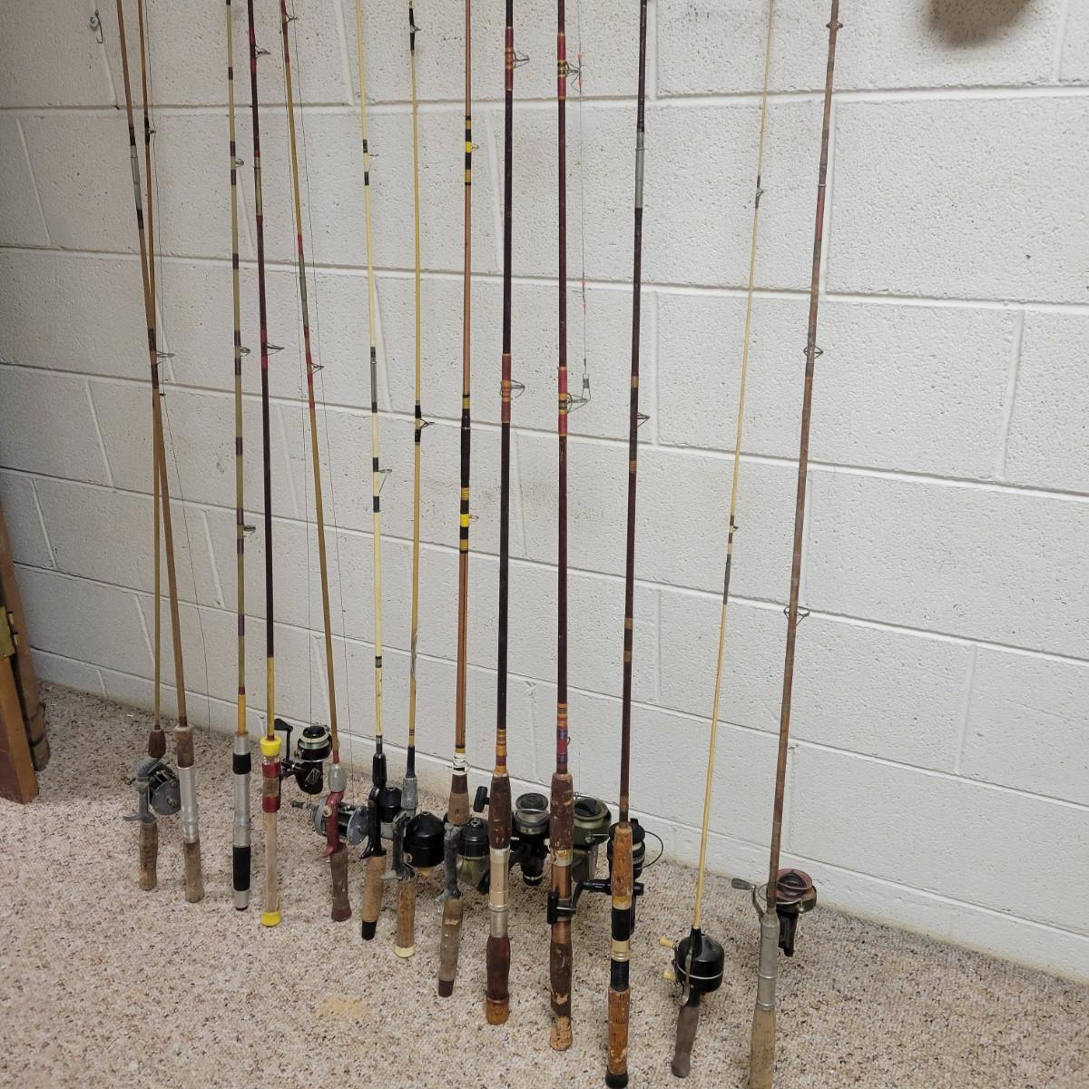 A assortment of vintage rods and reels in good to fair condition. All rods have intact ferrules and tips, but many have damage to their cork handles. Most of the rods are slow action glass, but there is one bamboo rod in the mix. Lot also includes an assortment of spin reels and bait casters that appear to be in good condition for their age. Manufacturers include Zebco, Shakespeare, Daiwa, Quantum and more. Rods range in length from 5' to 7'. Local pickup only