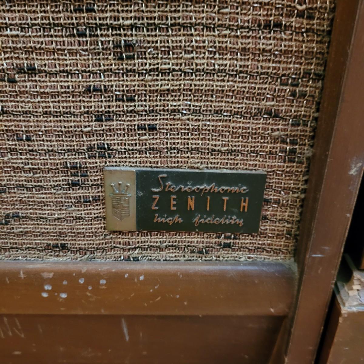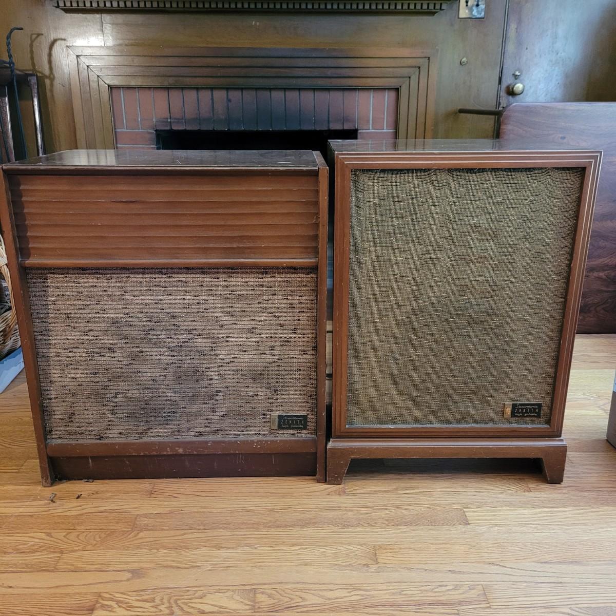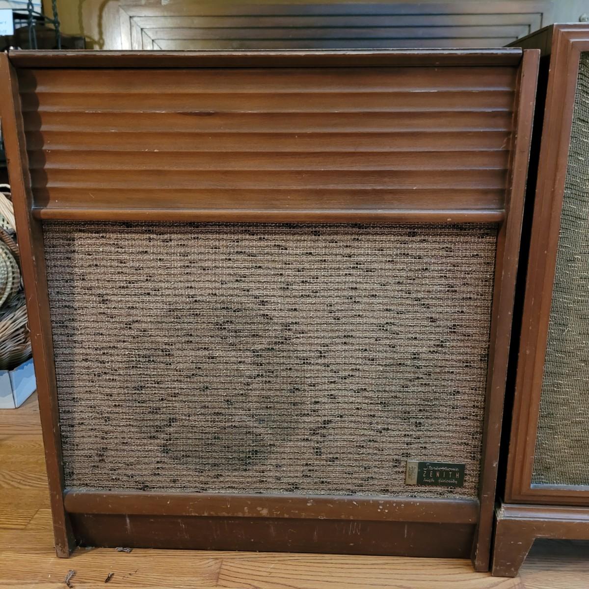 Vintage Zenith high fidelity phonograph with speaker. Unable to test if it works. Phonograph measures approximately 26"L x 17"D x29.5"H and speaker 21"L x16"D x31"H. Local pickup only.