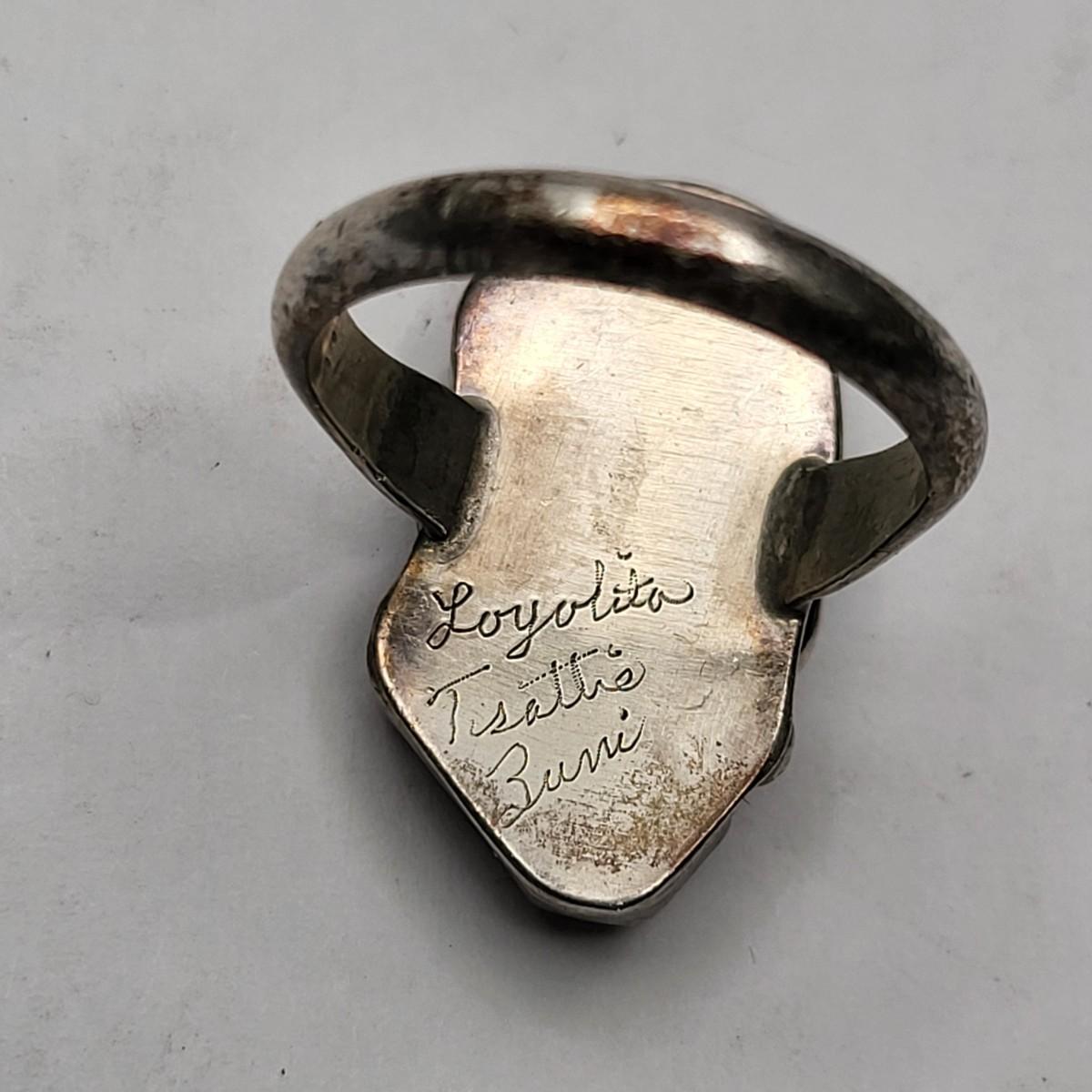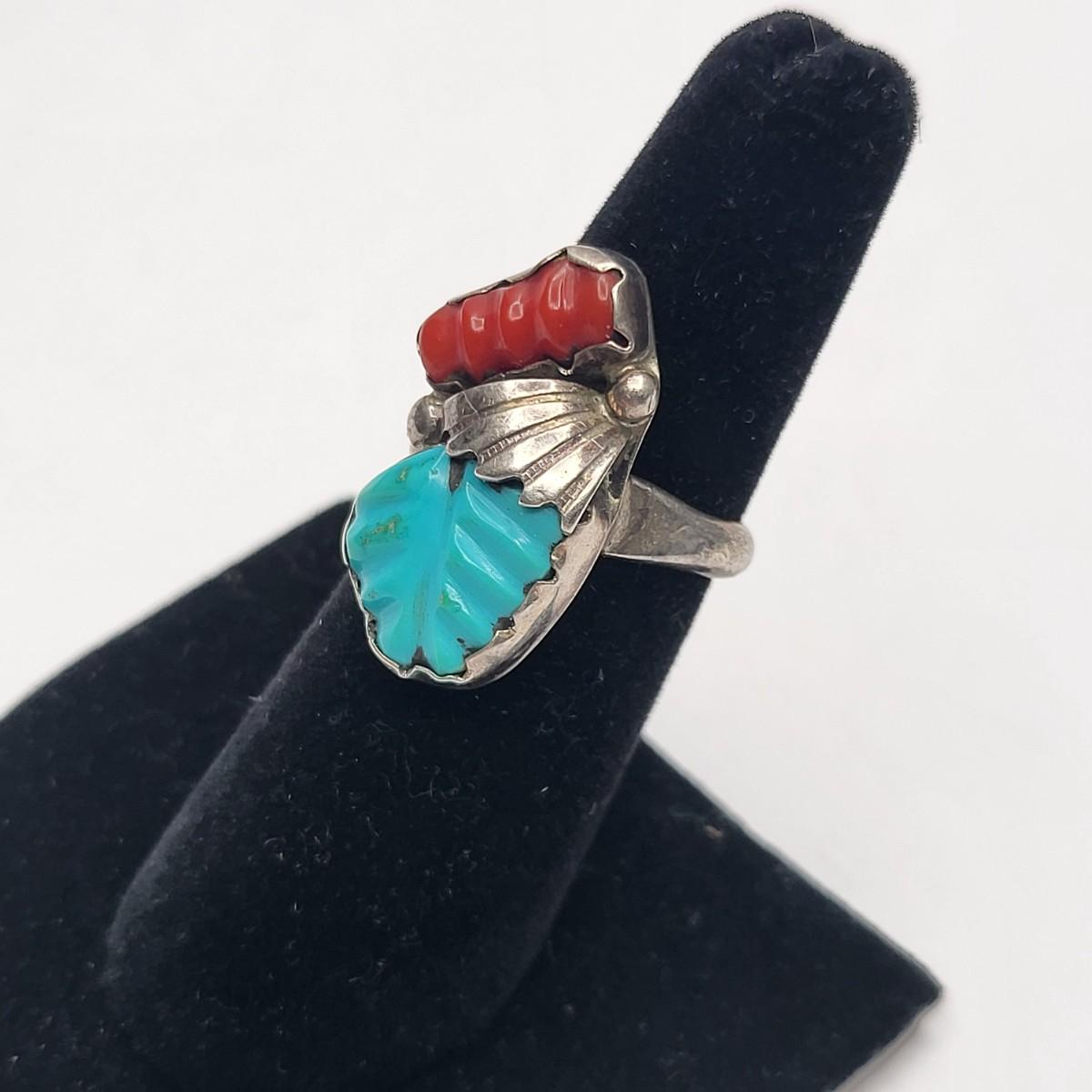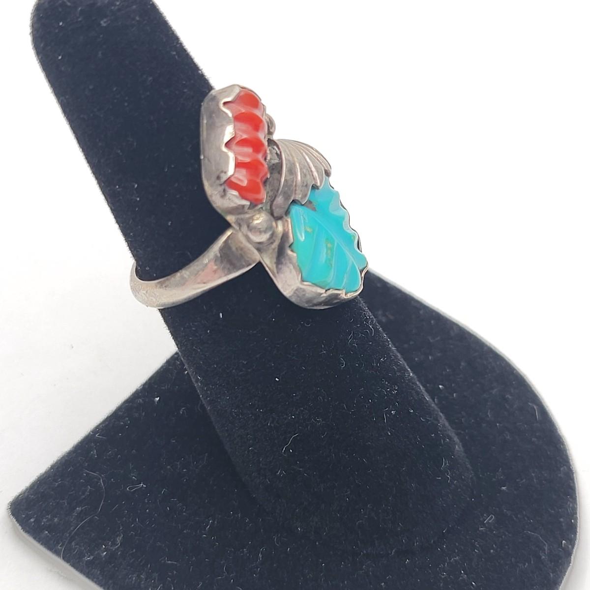 Zuni turquoise & coral sterling silver ring, artist etched signature.
