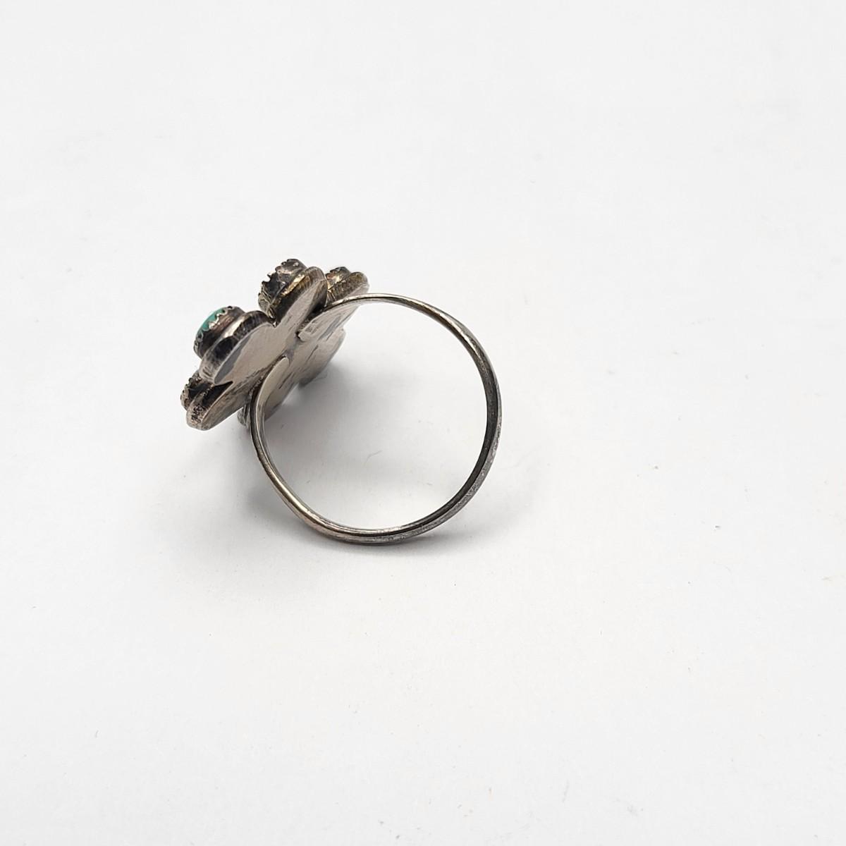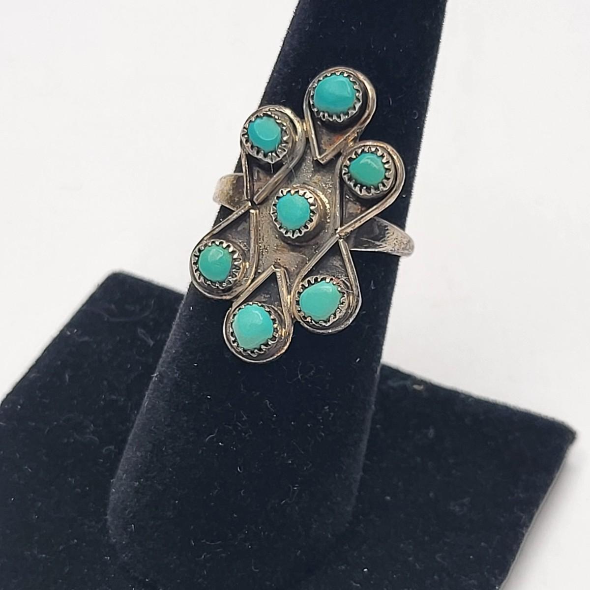 Unmarked sterling silver ring with 7 small turquoise stones. Both are size 7.5.
