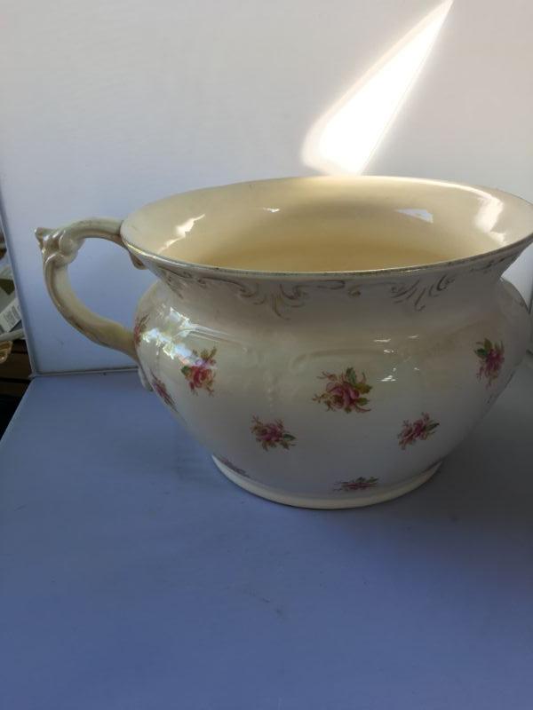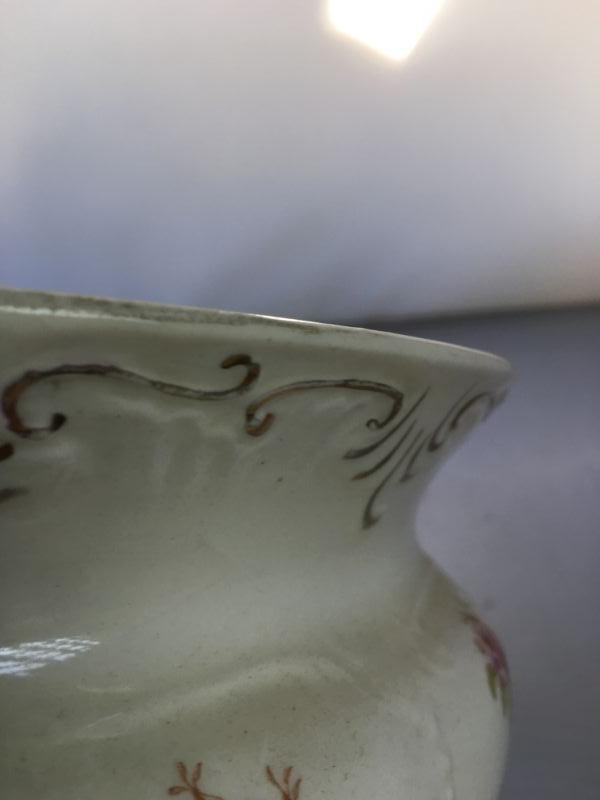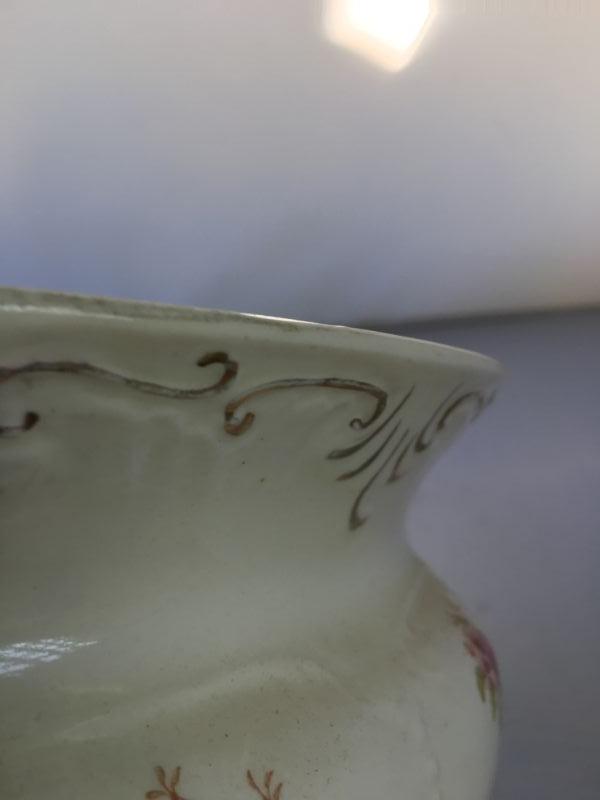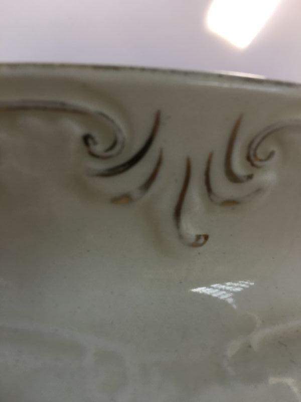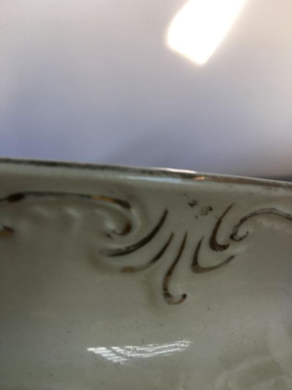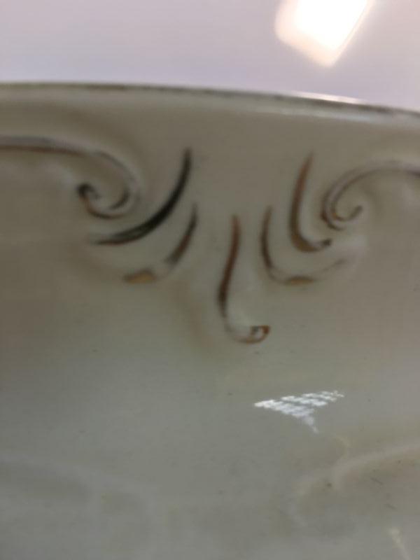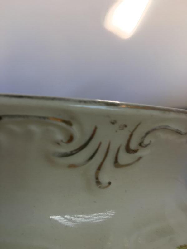 Large floral bowl hand painted and gilded all around the edges, in VG conditions. has a repaired small repaired hairline (see photo). Measures 10.5" X 6".