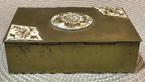 Vintage/Antique CHINESE Solid Brass Hinged Trinket Box Wooden Lined Interior 3.25" x 4.75" x 1-3/8" in Good Preowned Condition. (w/Teapots & Vases Accents).