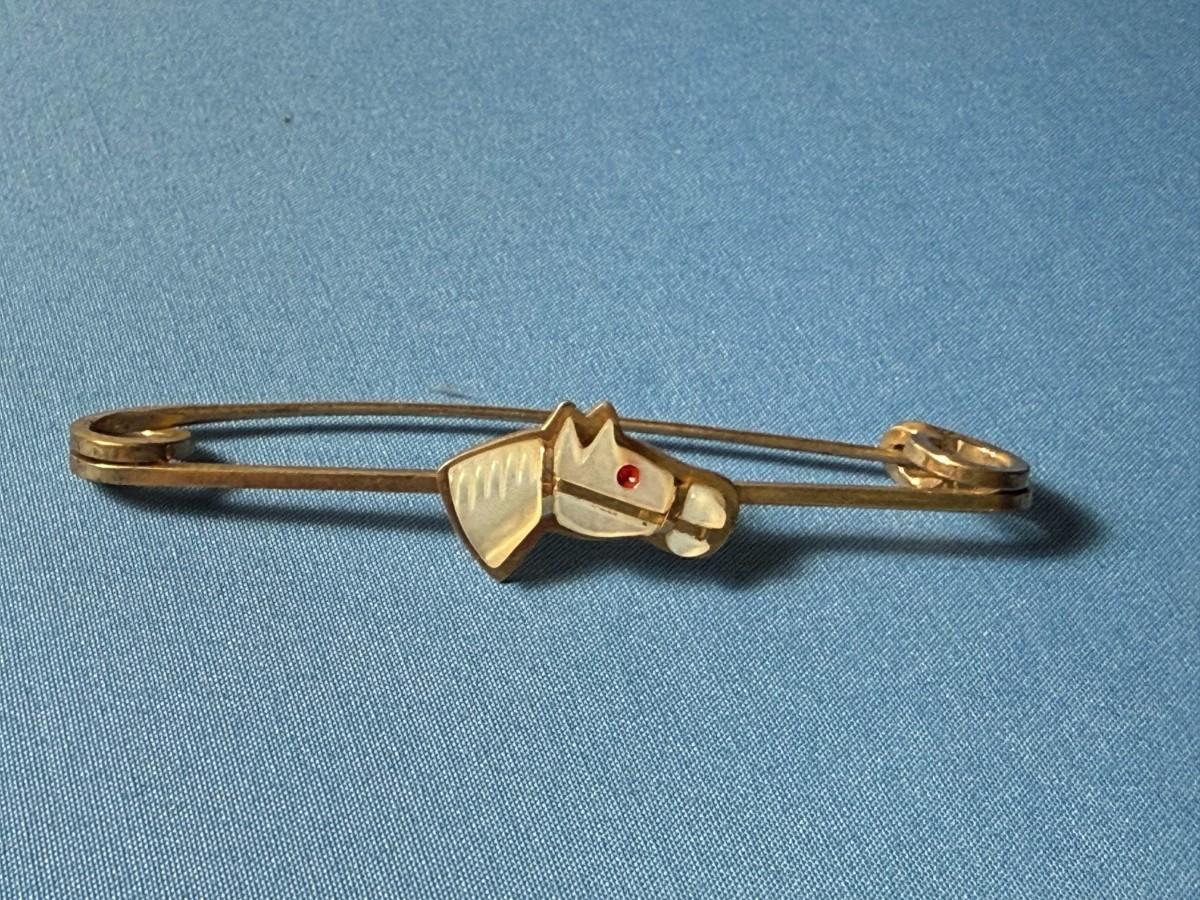 Vintage/Antique "Horse Head" 3" Mother of Pearl Horse Blanket Safety Pin in Good Preowned Condition. $5 DOMESTIC SHIPPING.
