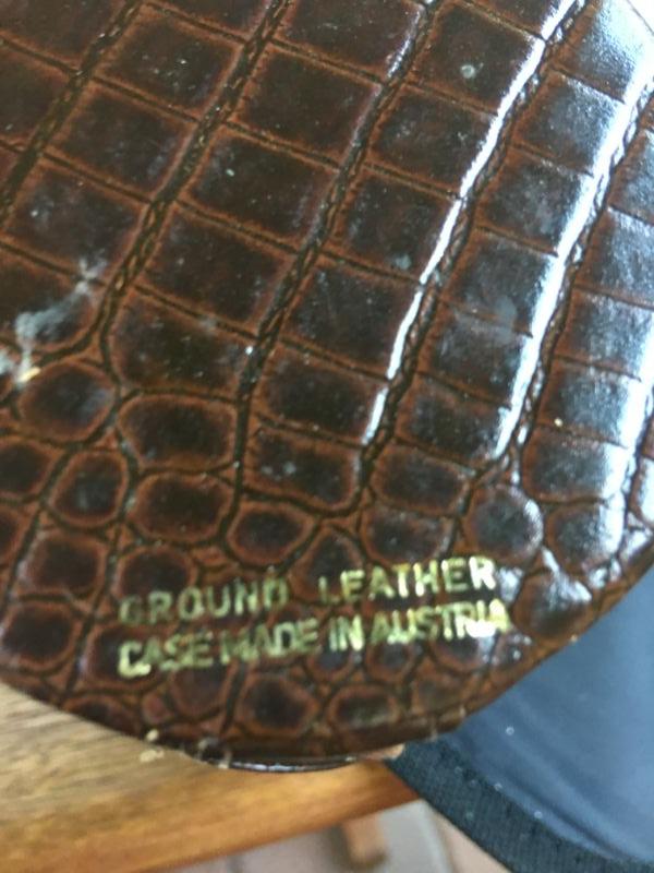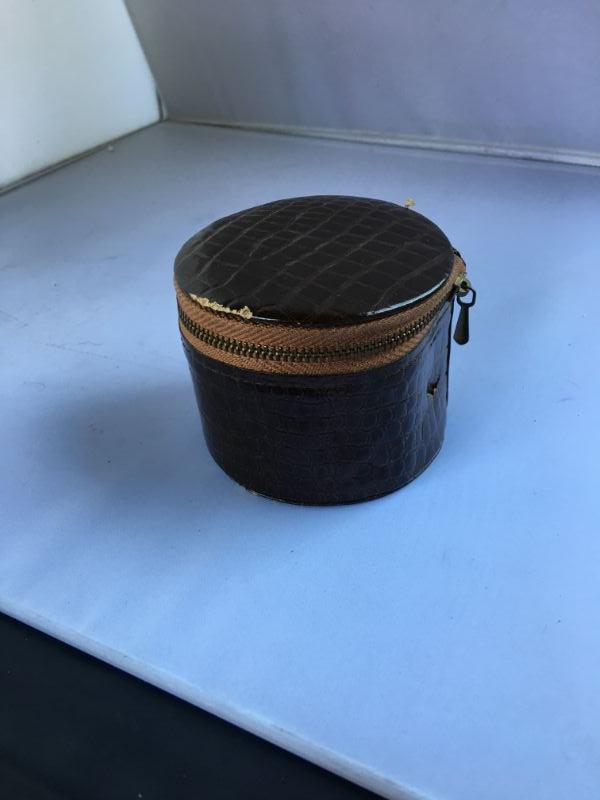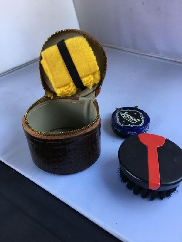 The box/pouch is made of leather which shows signs of wear. Inside you will find the cloth, the shoe shine cream and a small shoe shine brush. Quite different! 3.25" X 2.5".