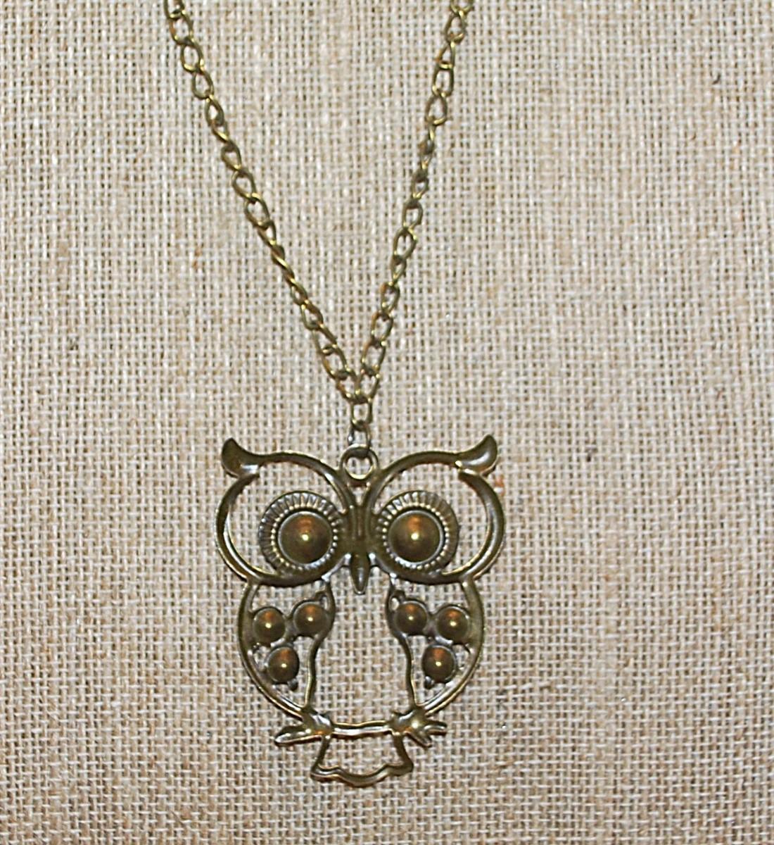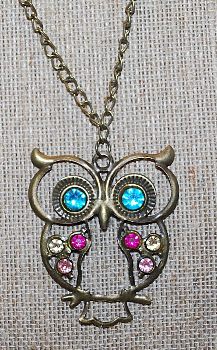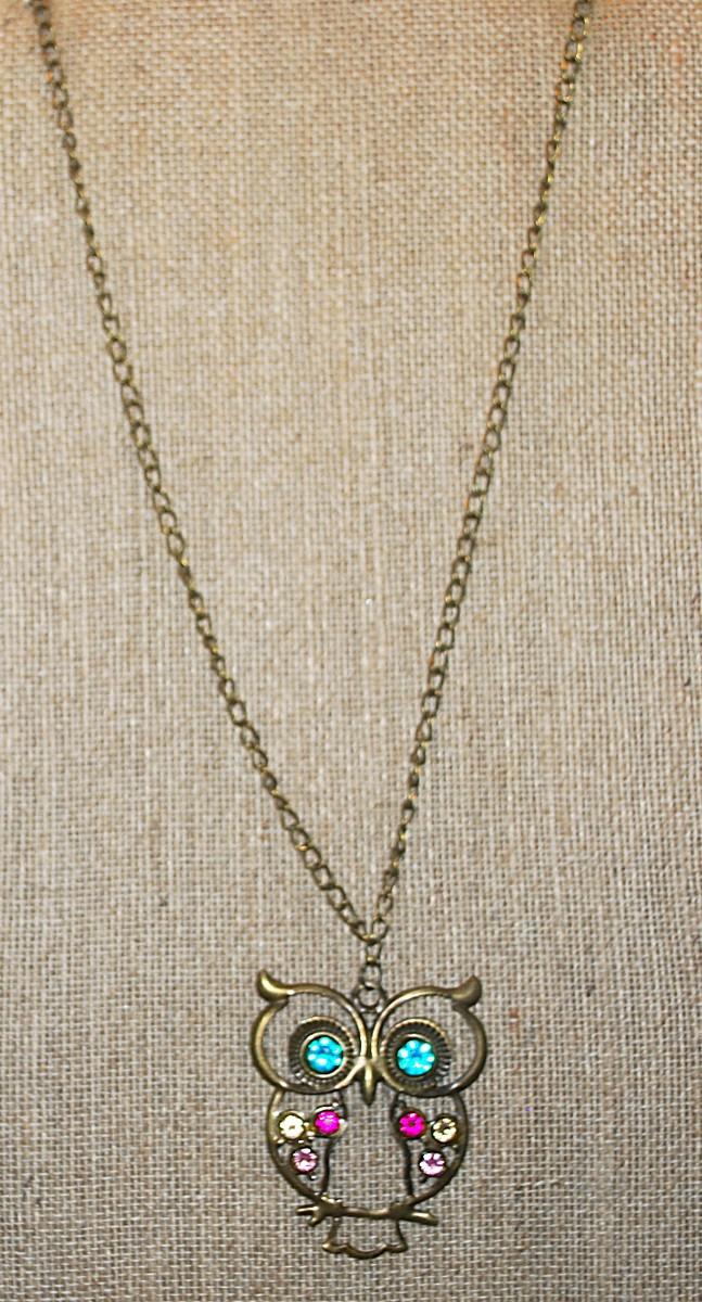 Vintage-Style Bejeweled OWL PENDANT/NECKLACE Combo with Brass-Tone Necklace Chain 24" L