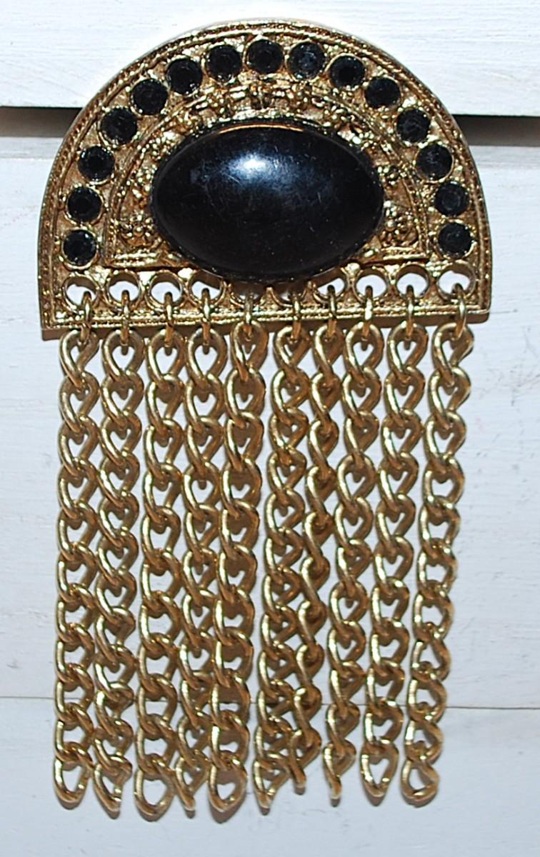 Vintage-Style Half Moon Black Oval Stone BROOCH (3½" x 1¾") with 10 Chain Link Dangles & Gold Tone Setting