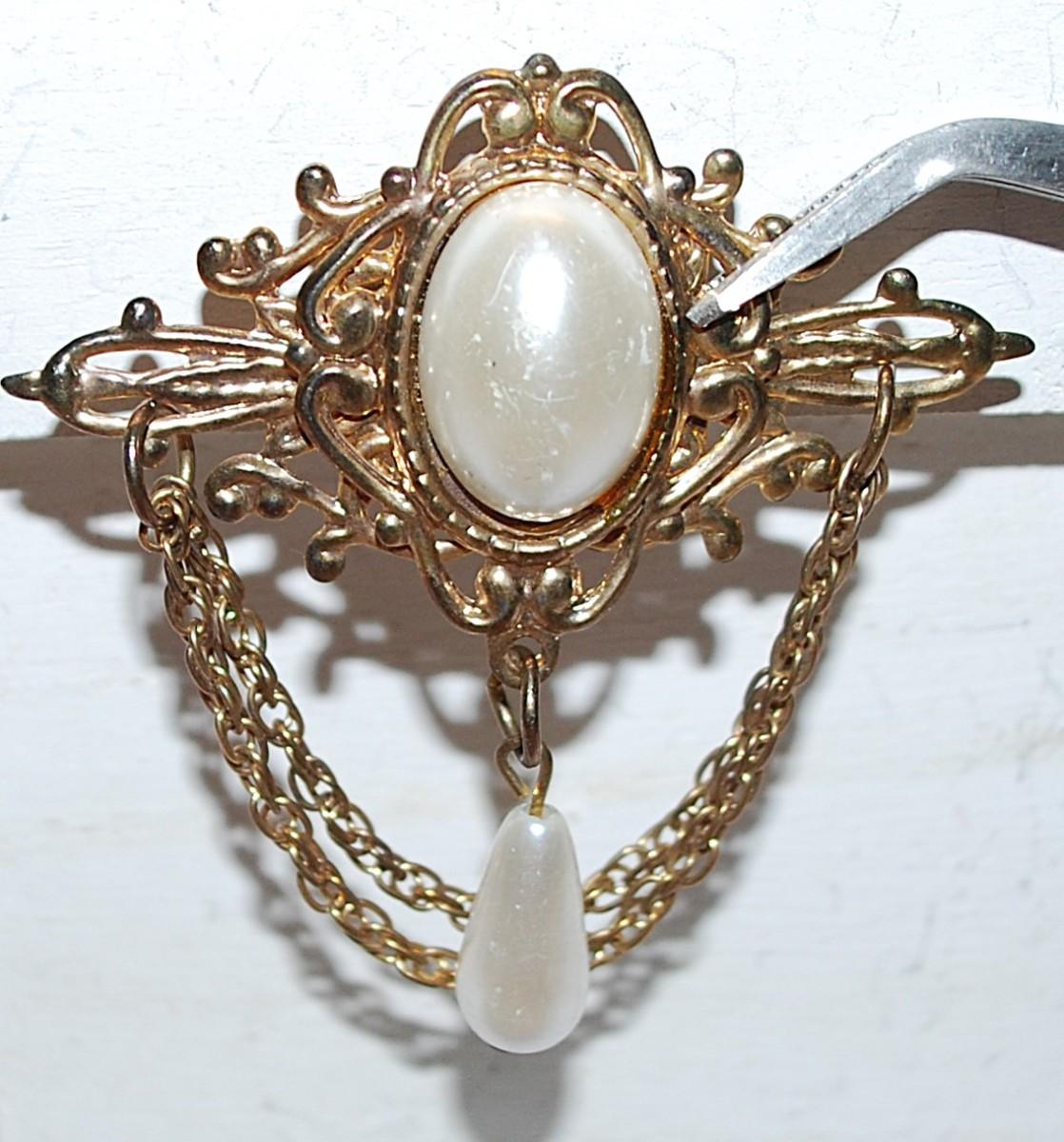 Vintage-Style White Oval Button BROOCH (2" x 2") with Chain Dangles on a Gold Tone Setting