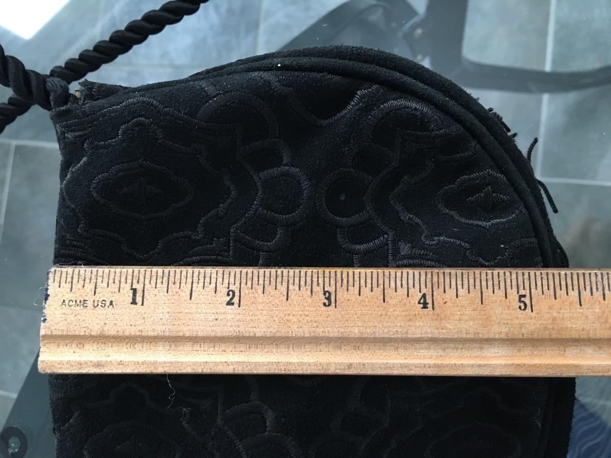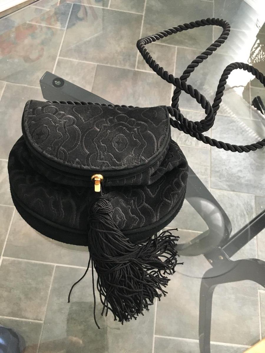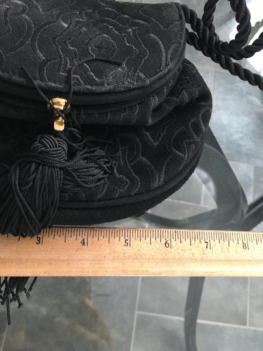 Textured velvet evening bag with tassle accent at closing. Interior zipper. Excellent condition.