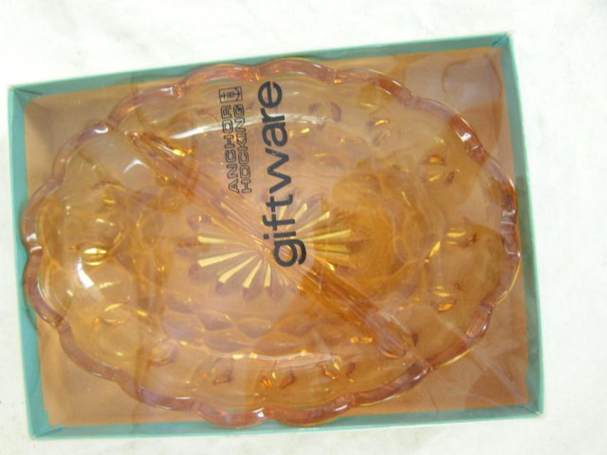Vintage Anchor Hocking Fairfield Amber 2-part oval relish dish. C.1970s In OEM gift box.