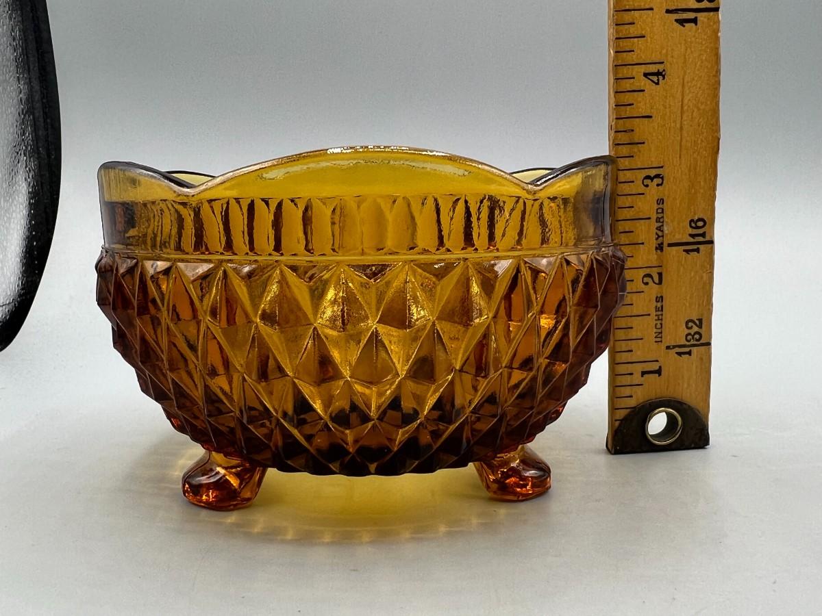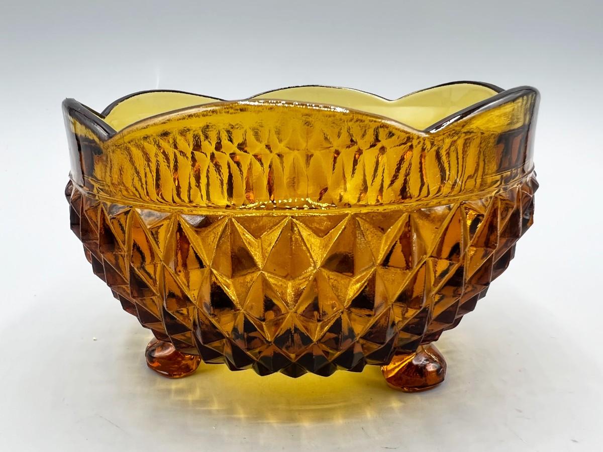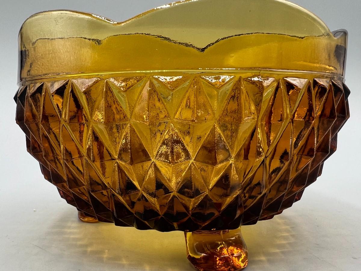 Vintage Indiana Glass Amber Colored Diamond Point Pattern Dish Bowl. There are no significant cracks or chips to the glass and is in good collectible condition. Check pictures for more details and for sizing.