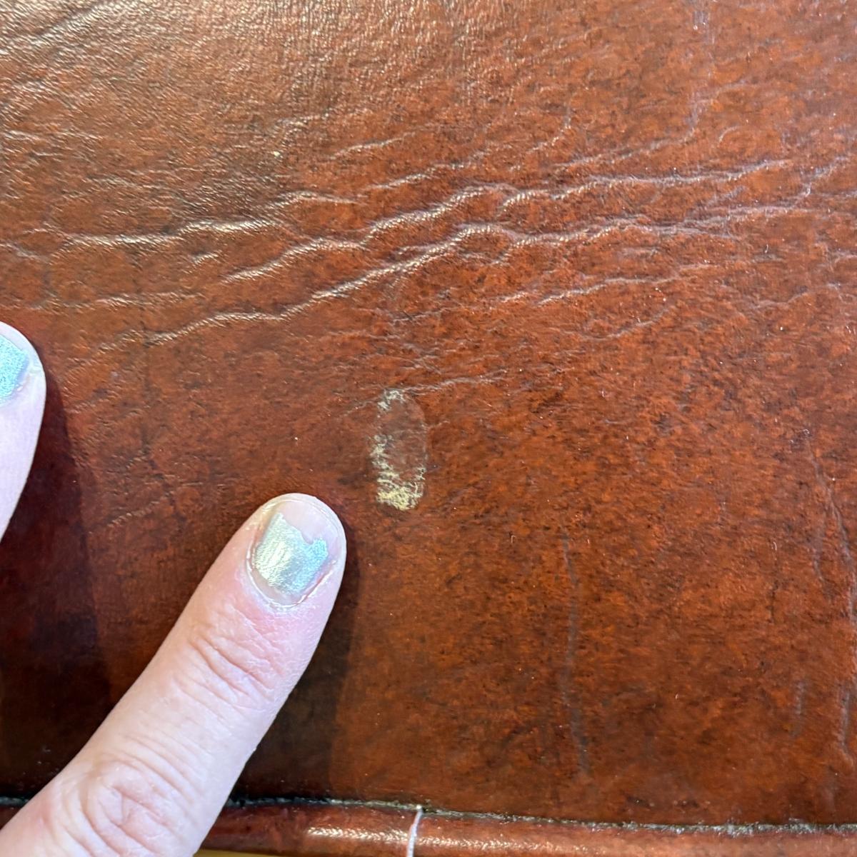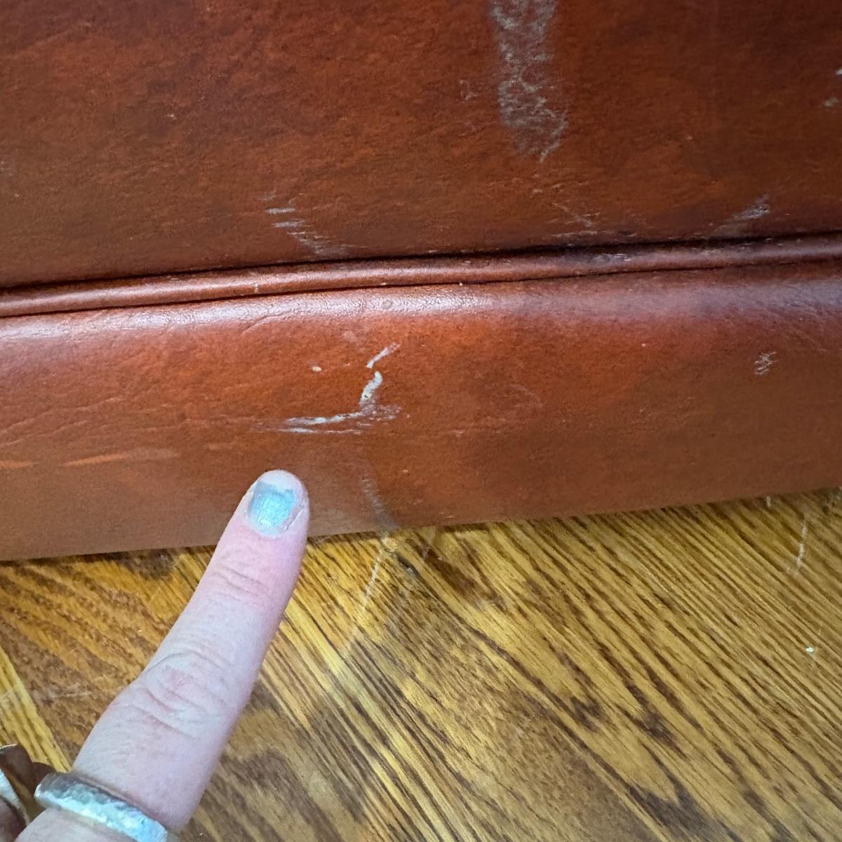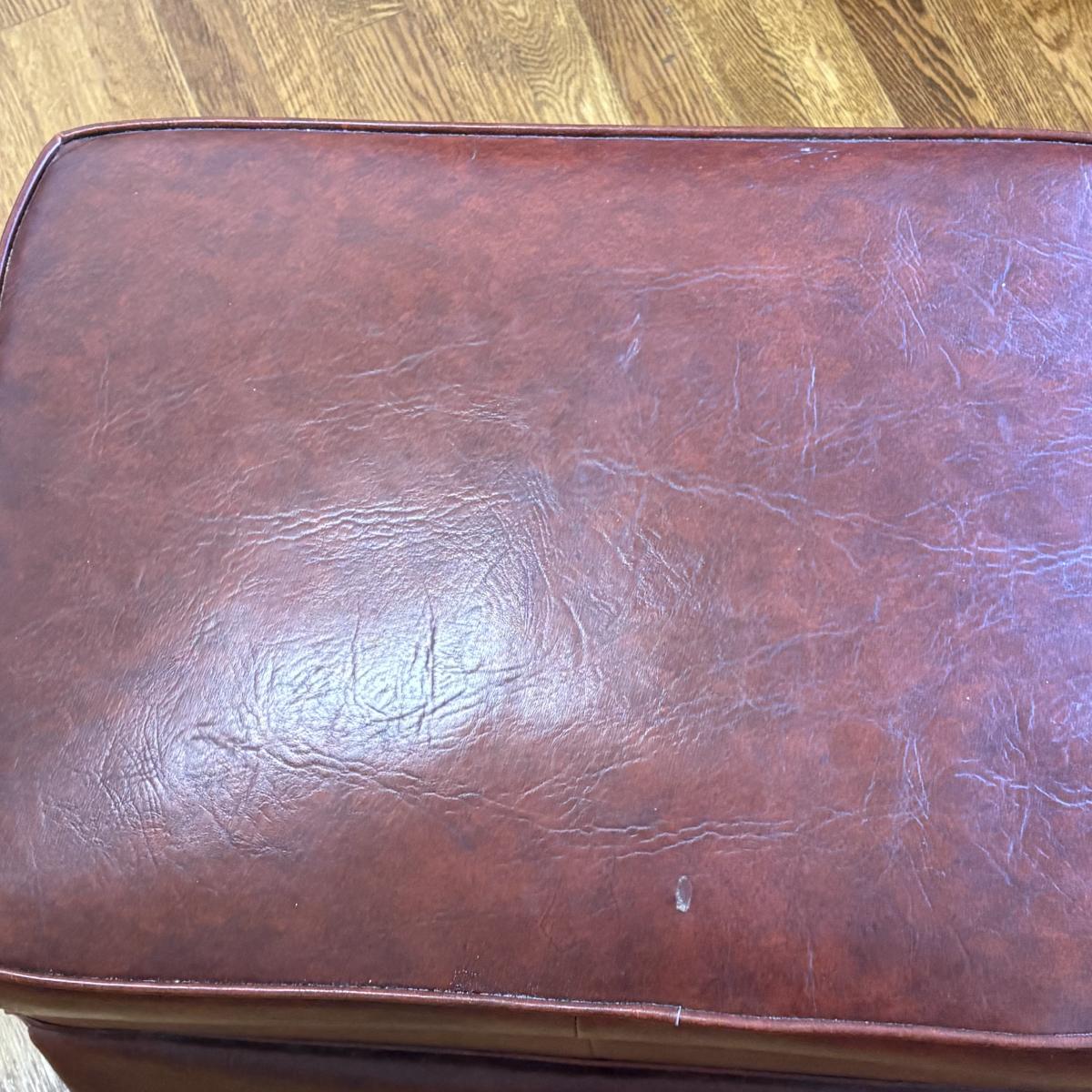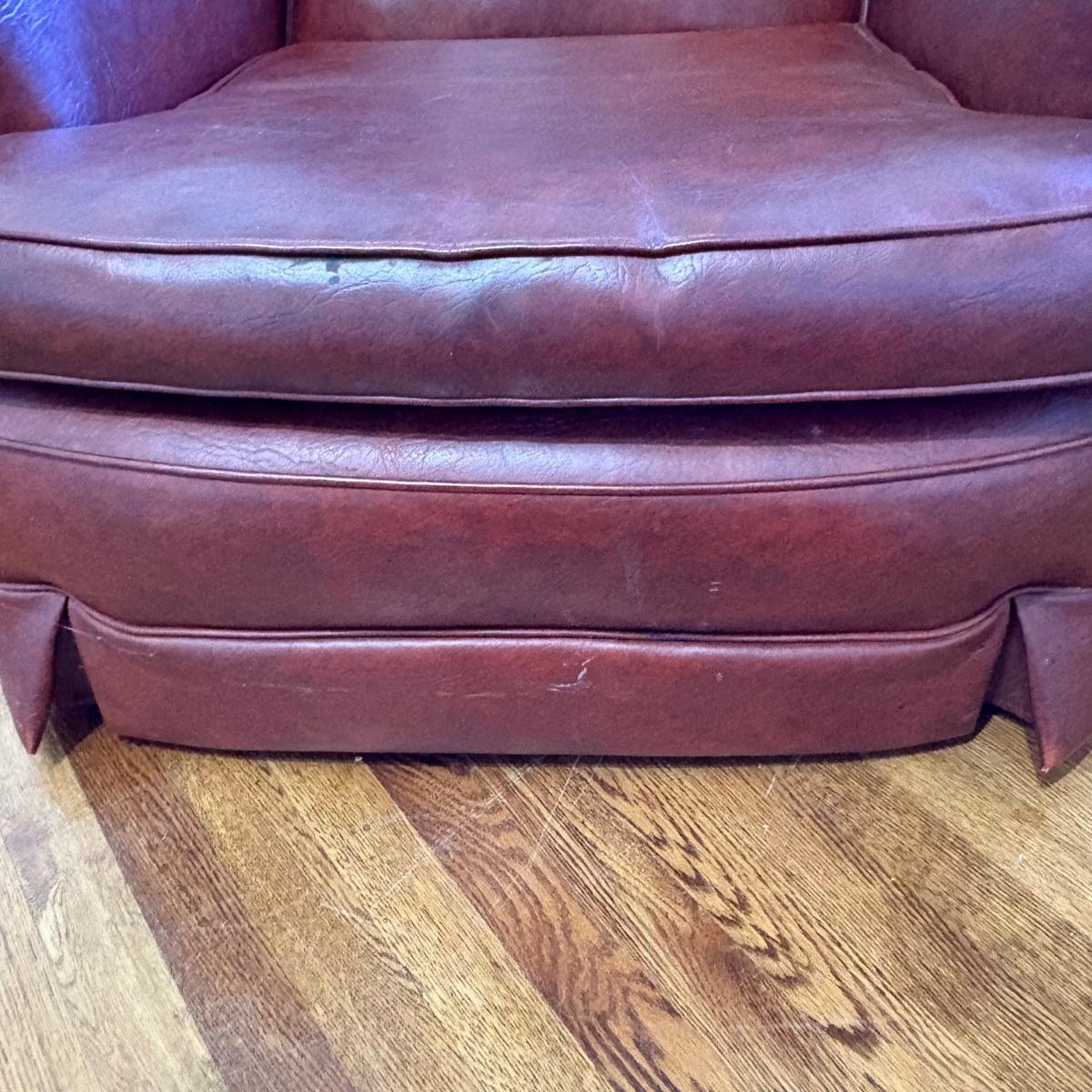 Armchair and matching ottoman. Covered in a brown vinyl fabric. Chair measures 36” x 39” x 35”H. With a seat height of 16”. Ottoman measures 18” x 25” x 16” H. Signs of wear.