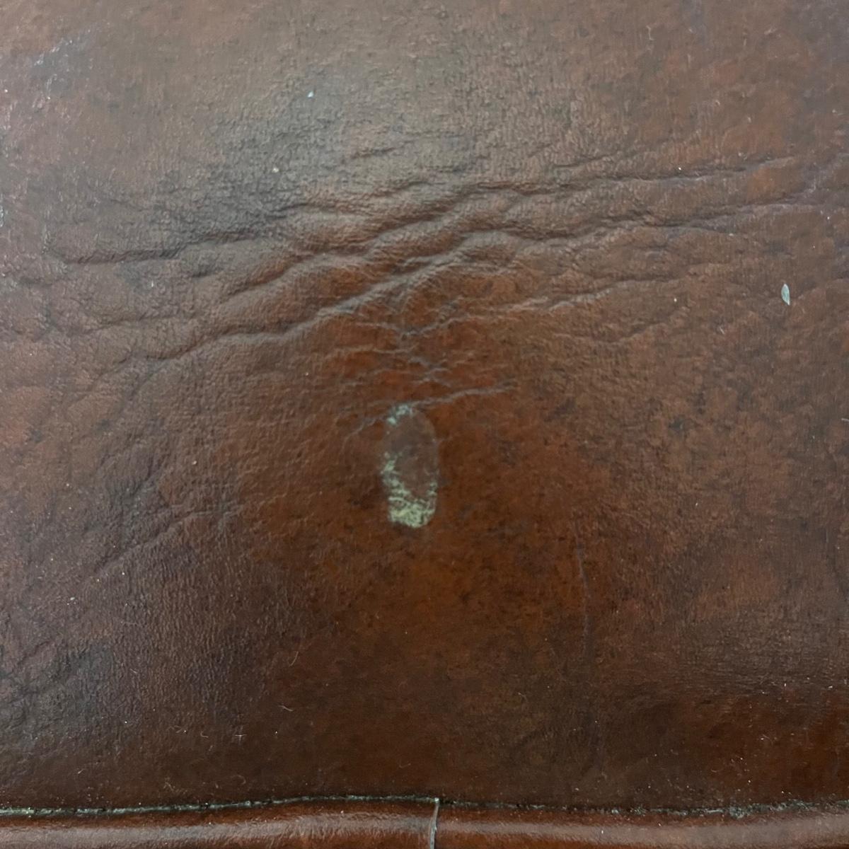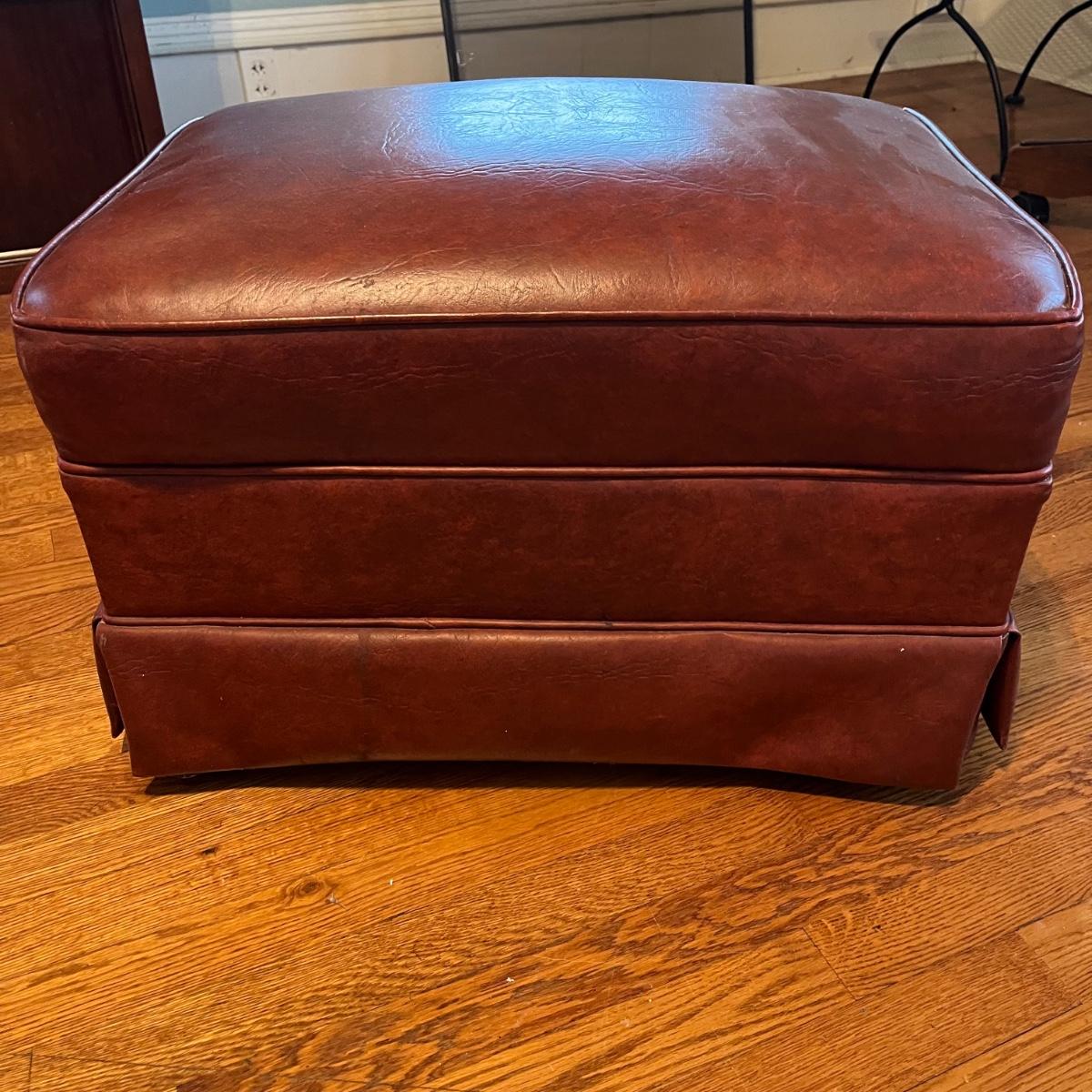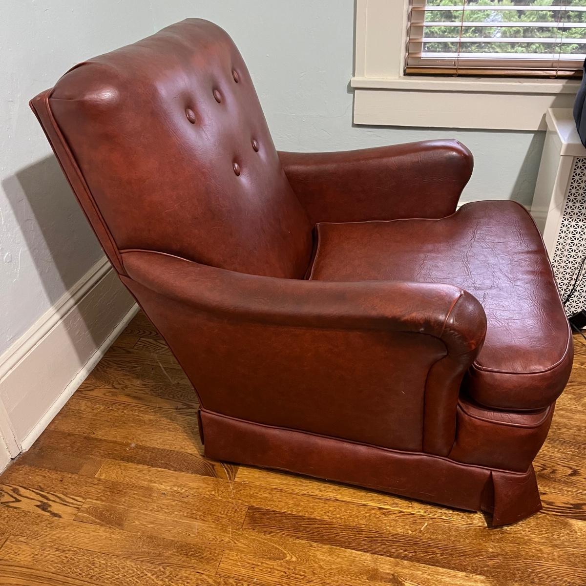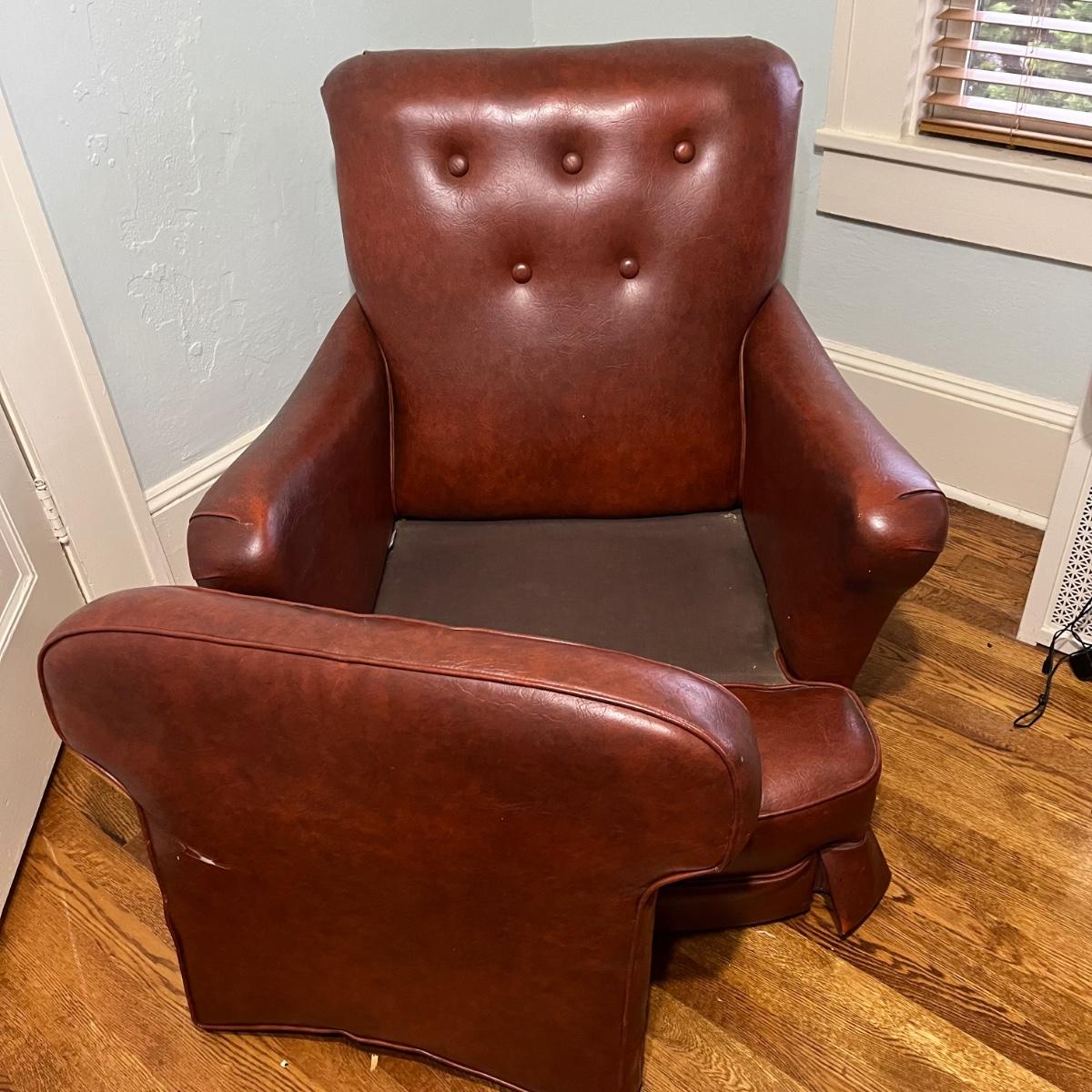 Armchair and matching ottoman. Covered in a brown vinyl fabric. Chair measures 36” x 39” x 35”H. With a seat height of 16”. Ottoman measures 18” x 25” x 16” H.