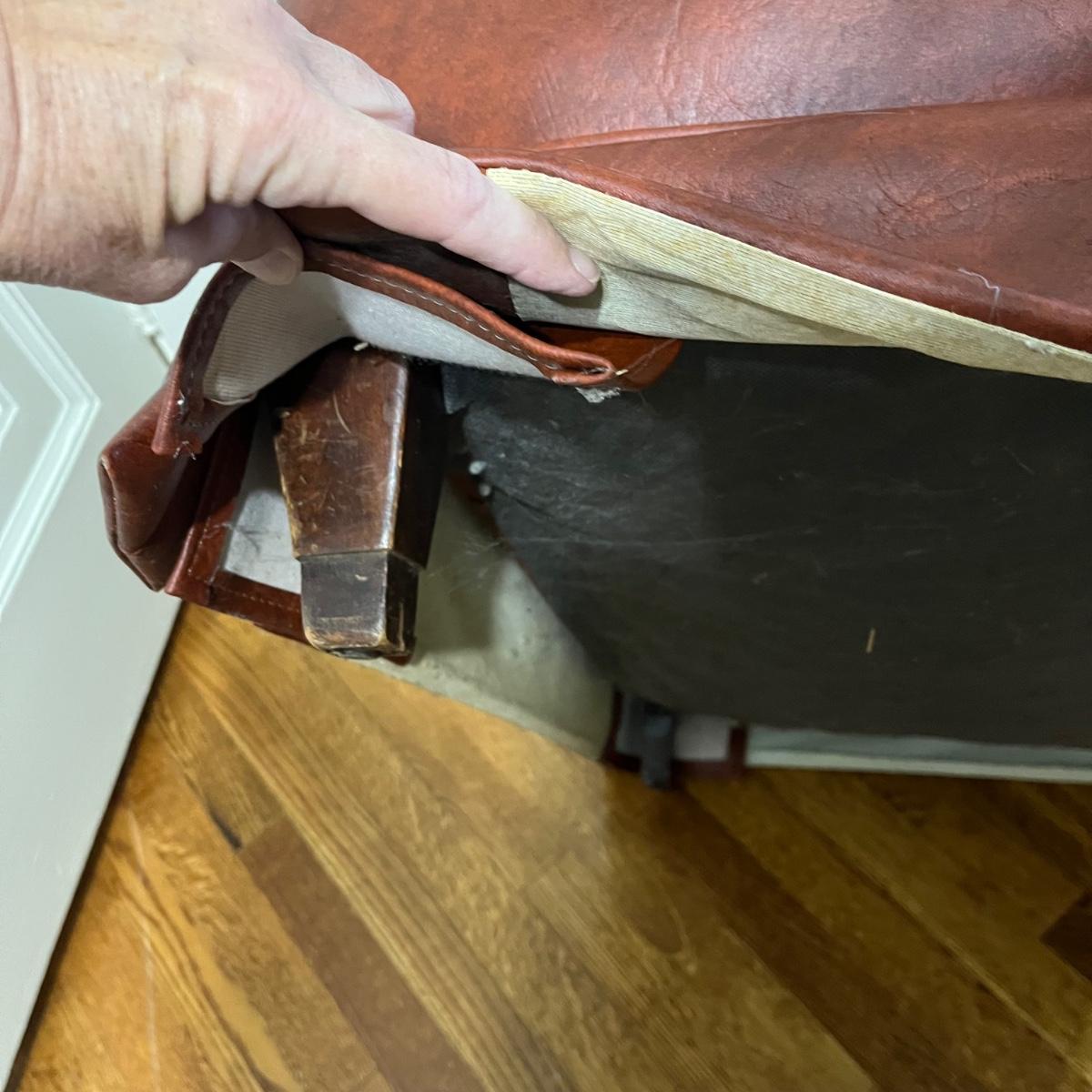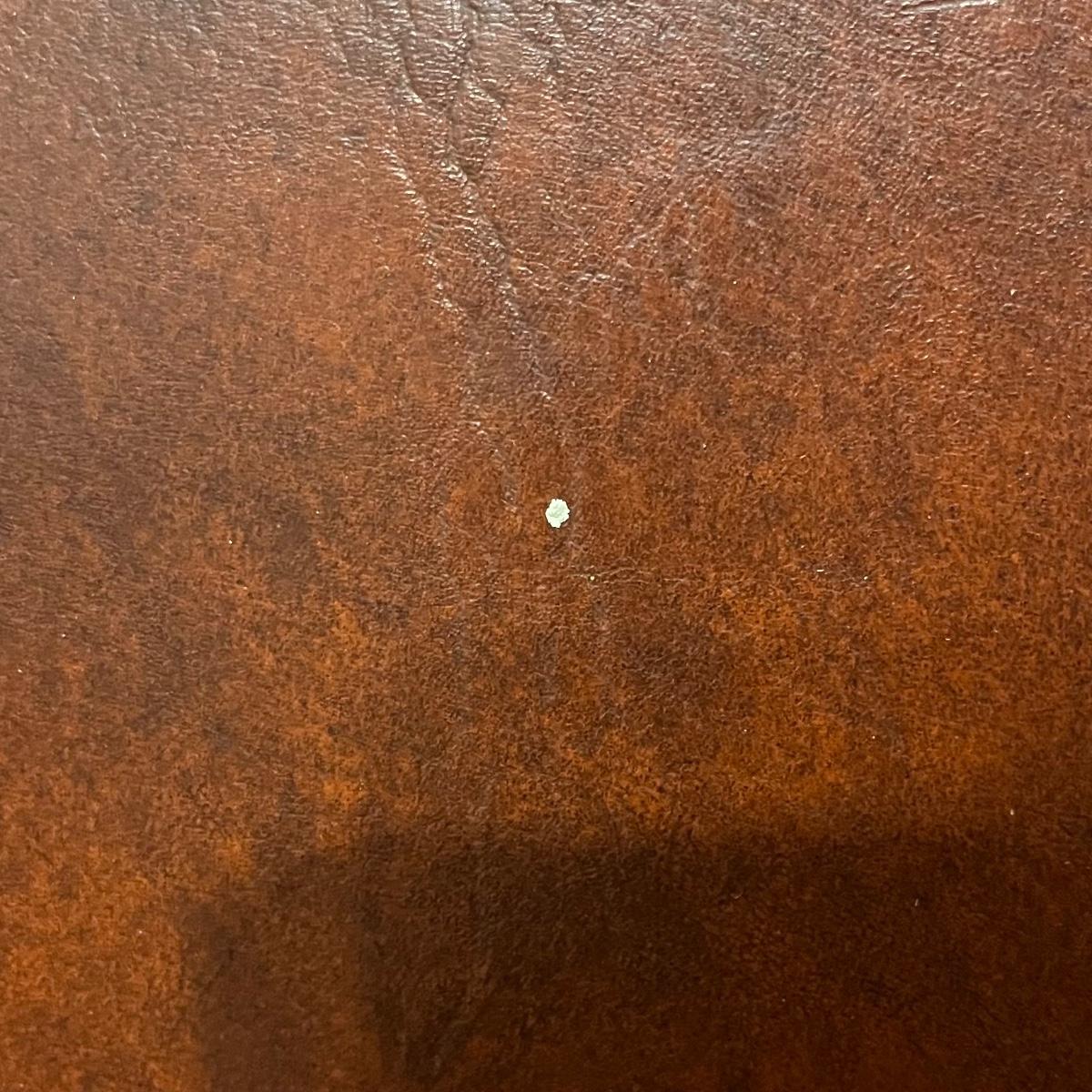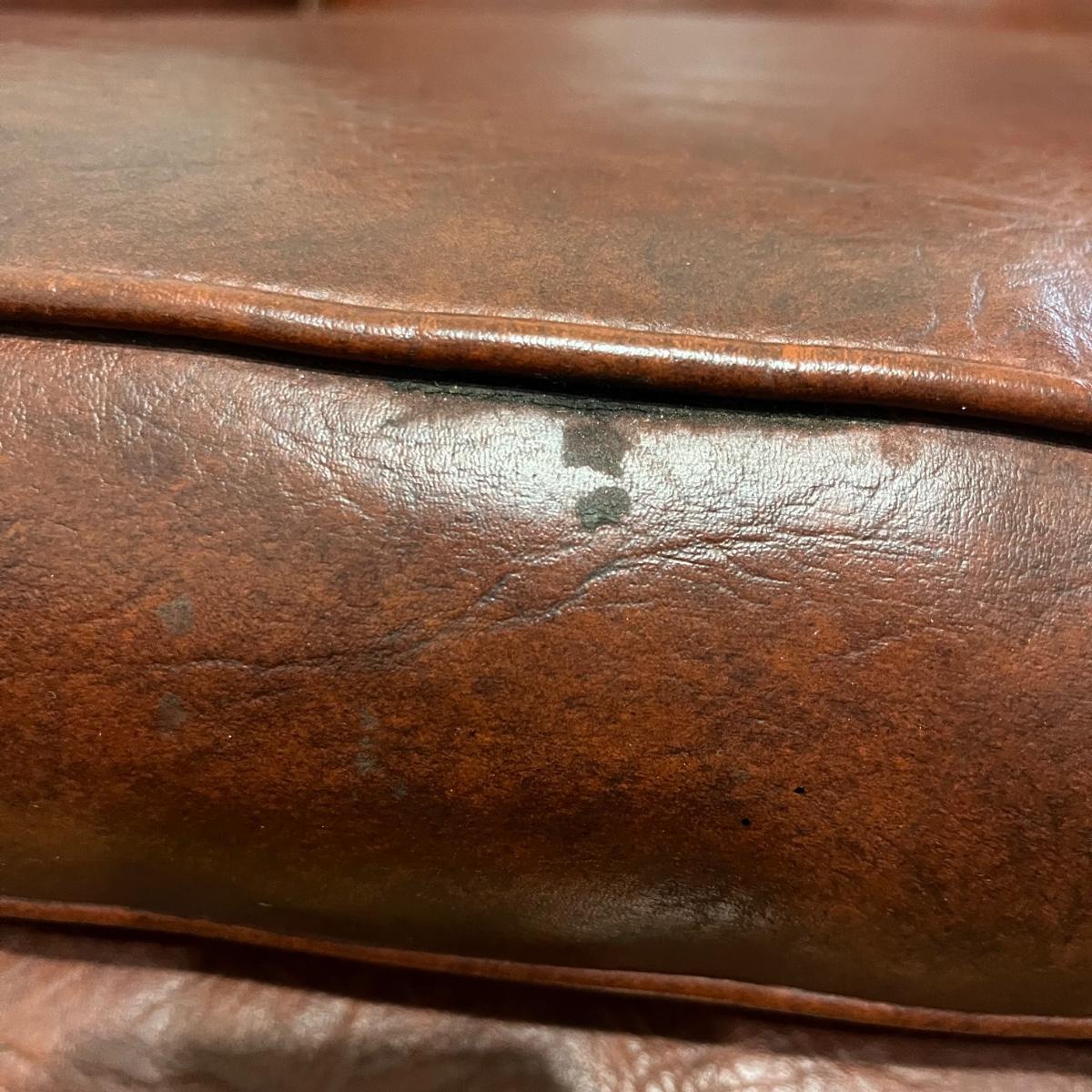 Armchair and matching ottoman. Covered in a brown vinyl fabric. Chair measures 36” x 39” x 35”H. With a seat height of 16”. Ottoman measures 18” x 25” x 16” H.