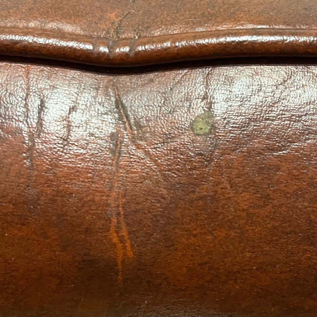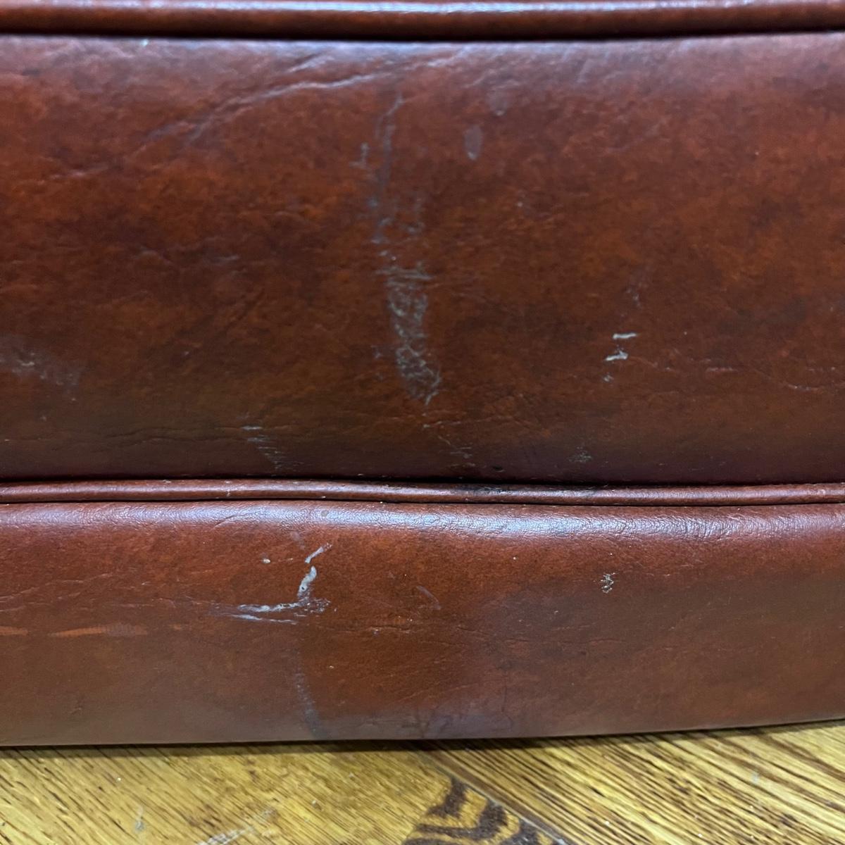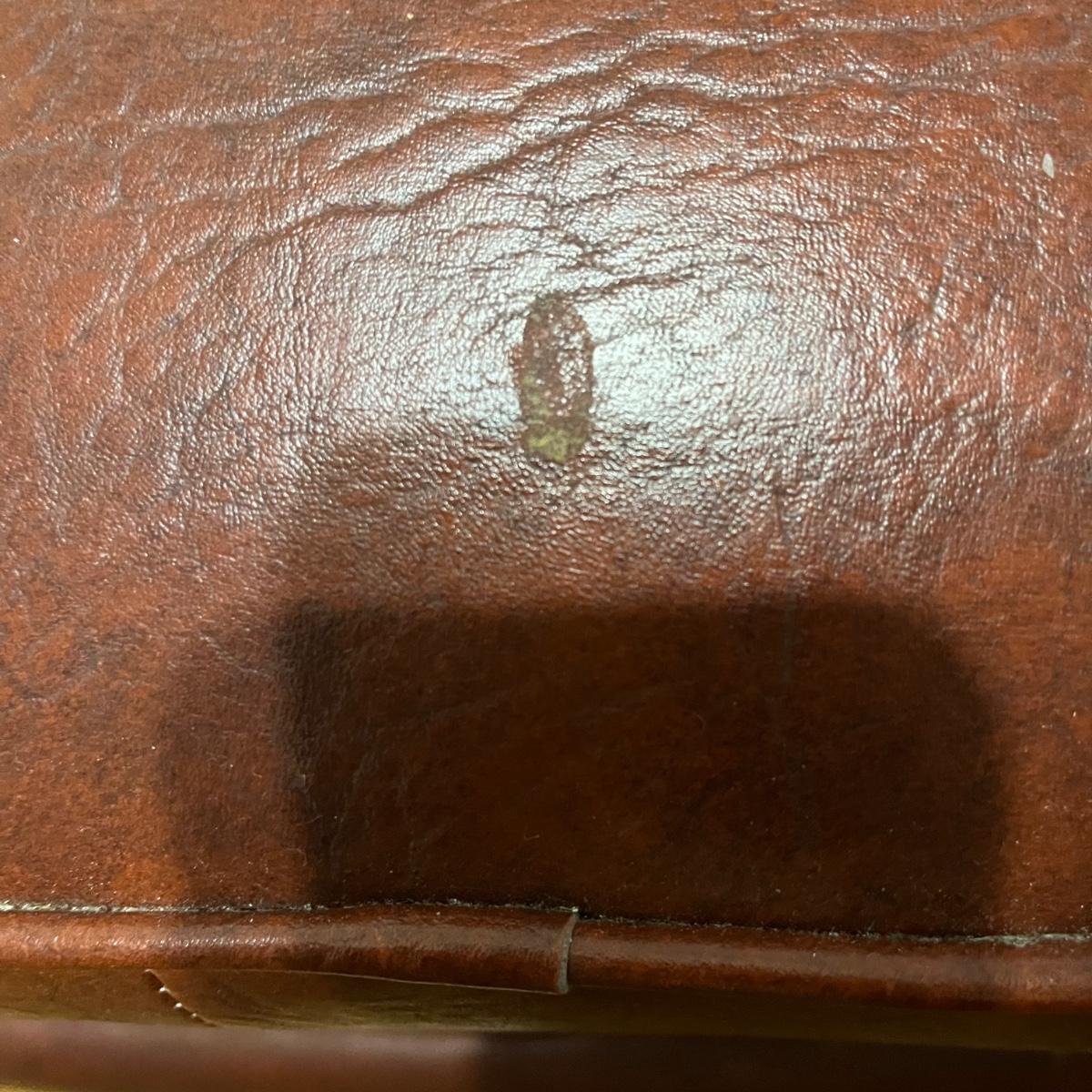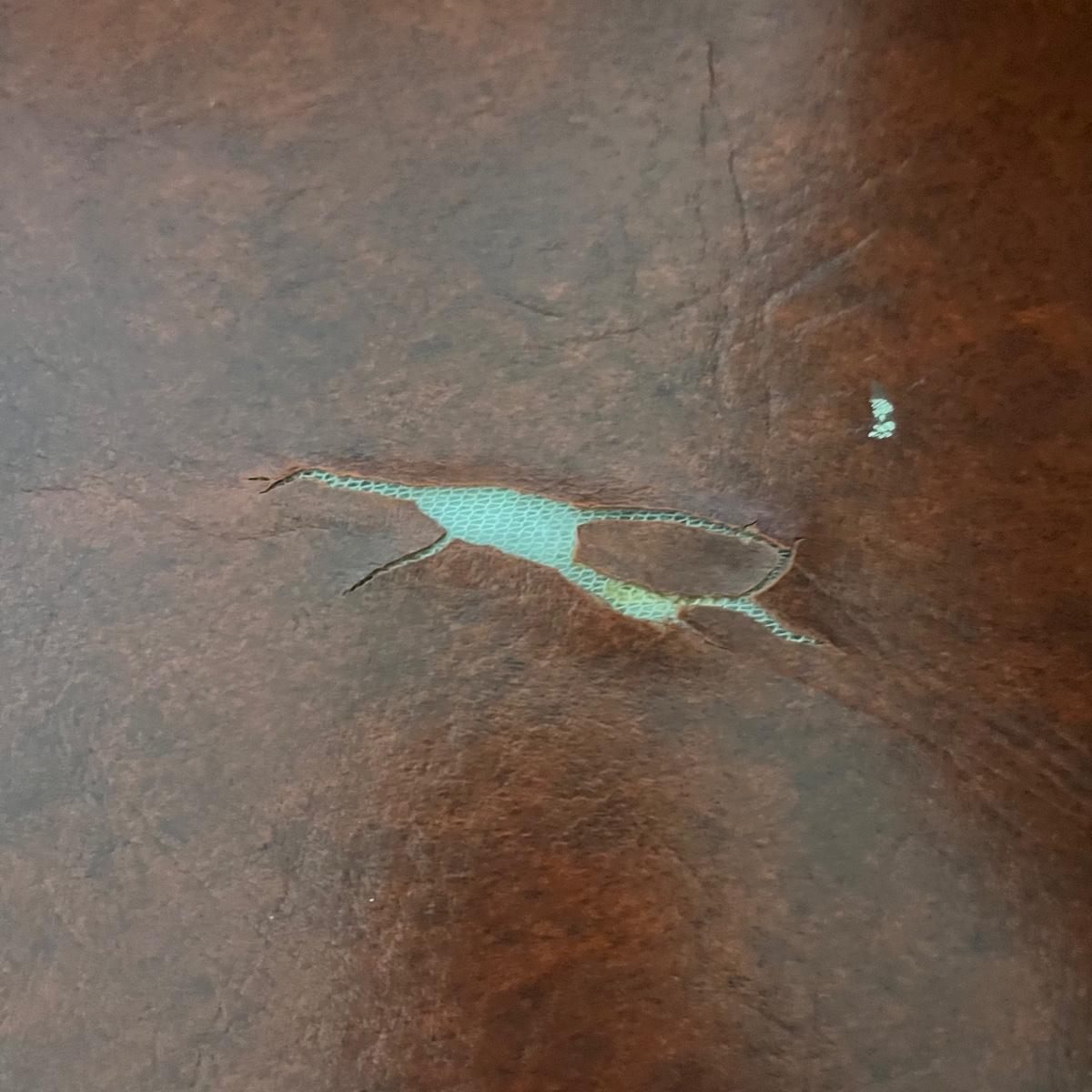 Armchair and matching ottoman. Covered in a brown vinyl fabric. Chair measures 36” x 39” x 35”H. With a seat height of 16”. Ottoman measures 18” x 25” x 16” H.