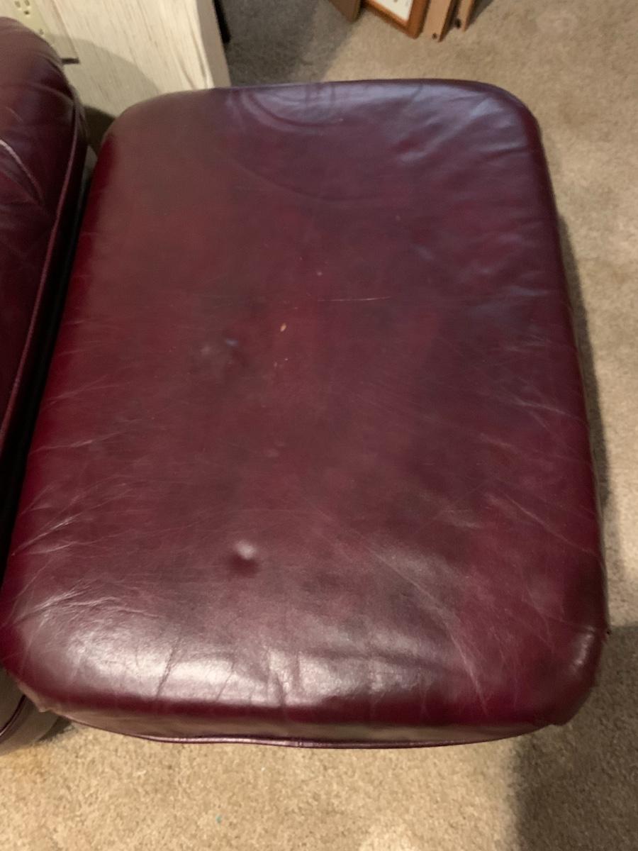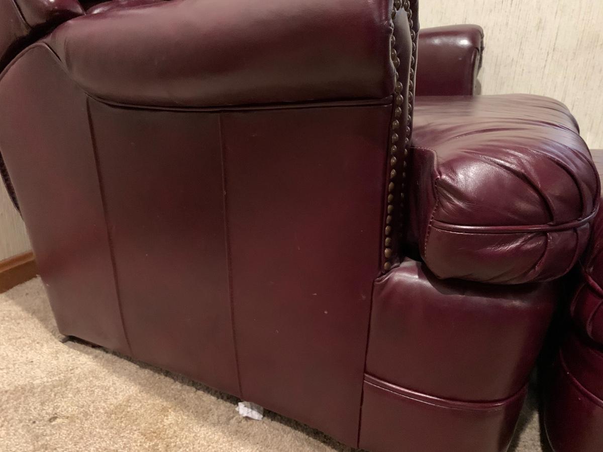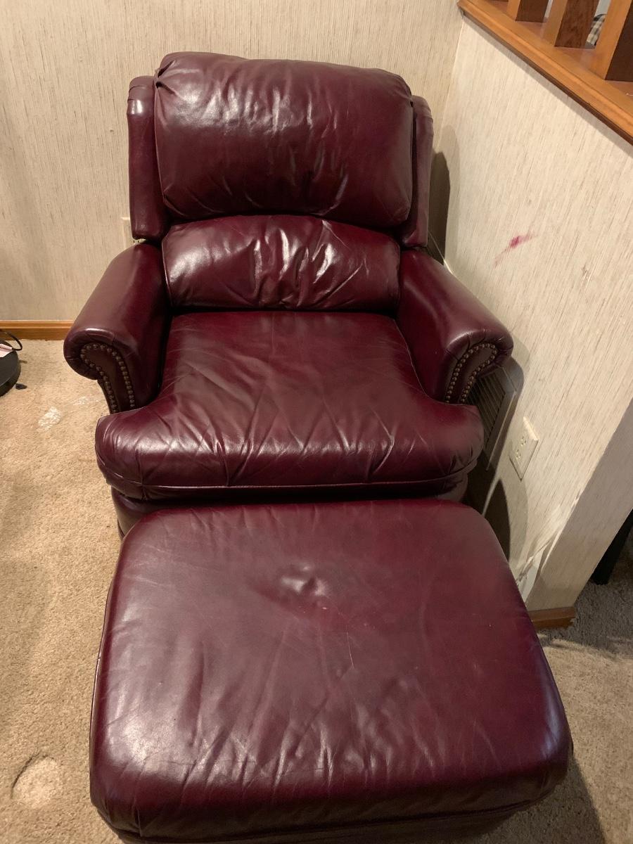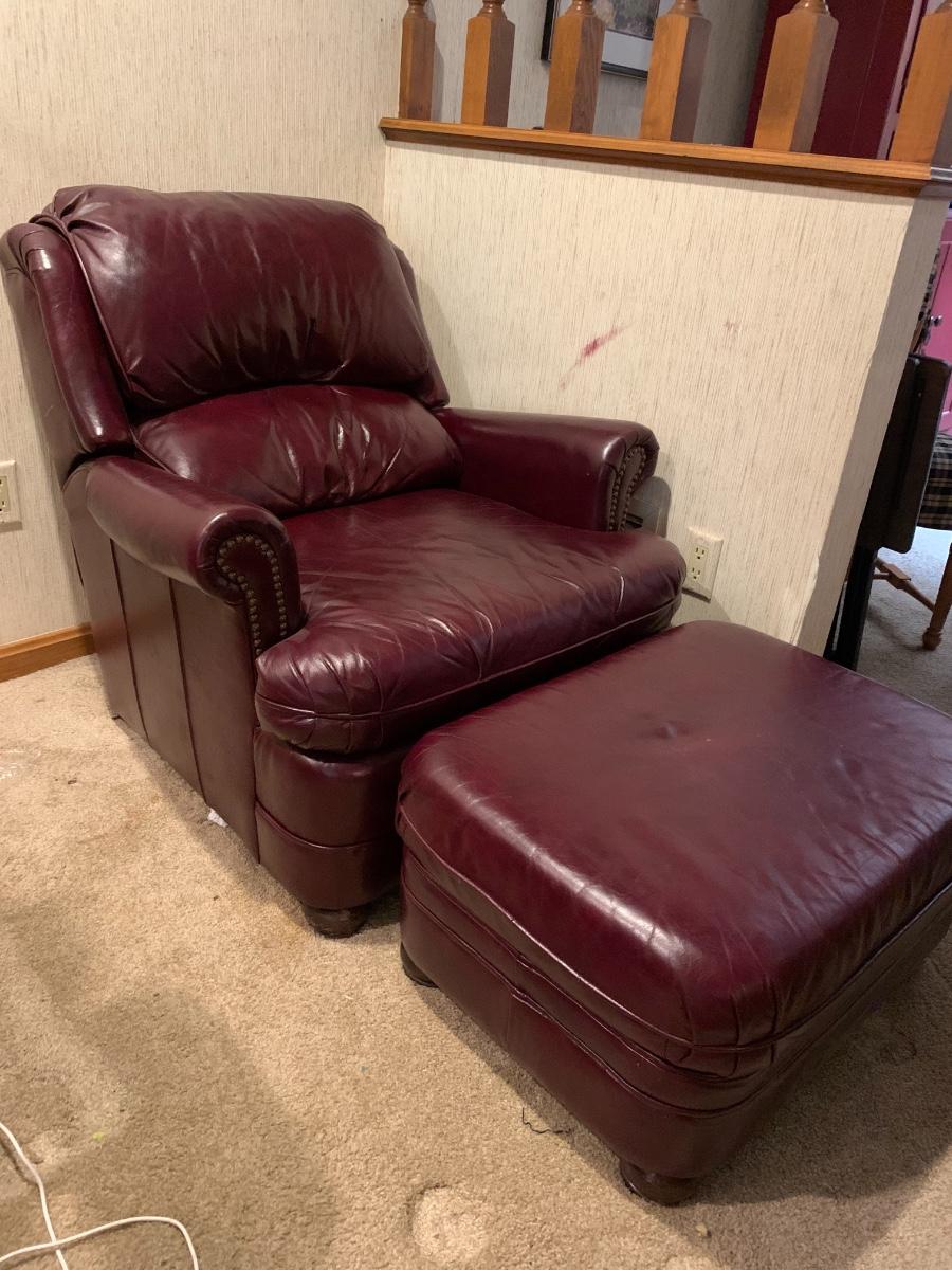Bradington Young vinyl chair in dark red/maroon in good condition, leans far back when in the sitting position with ottoman.