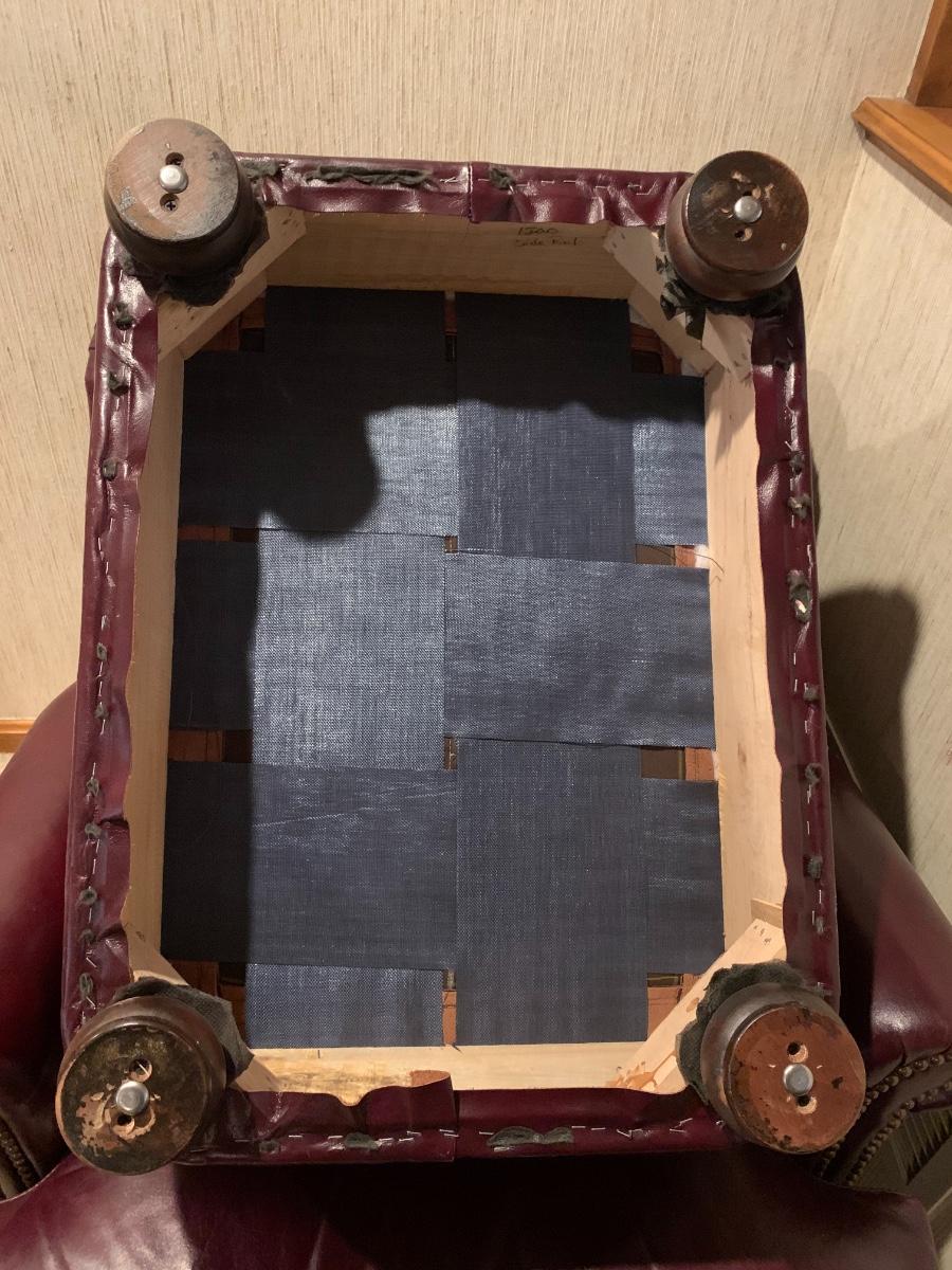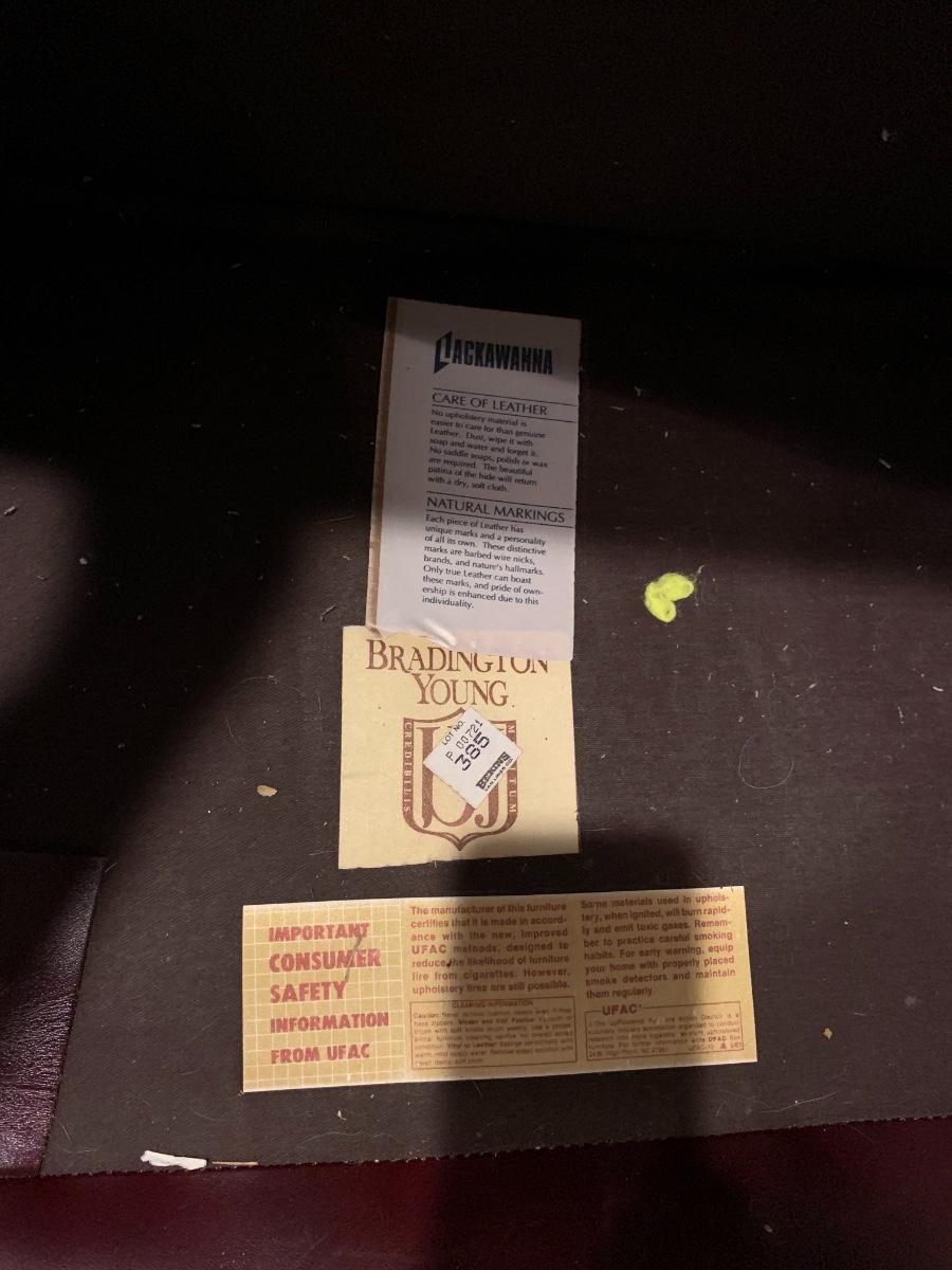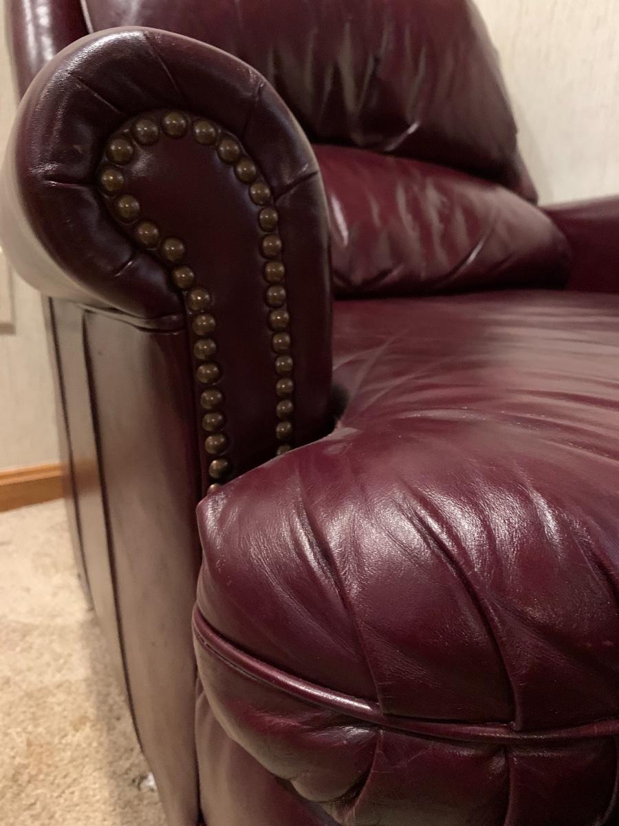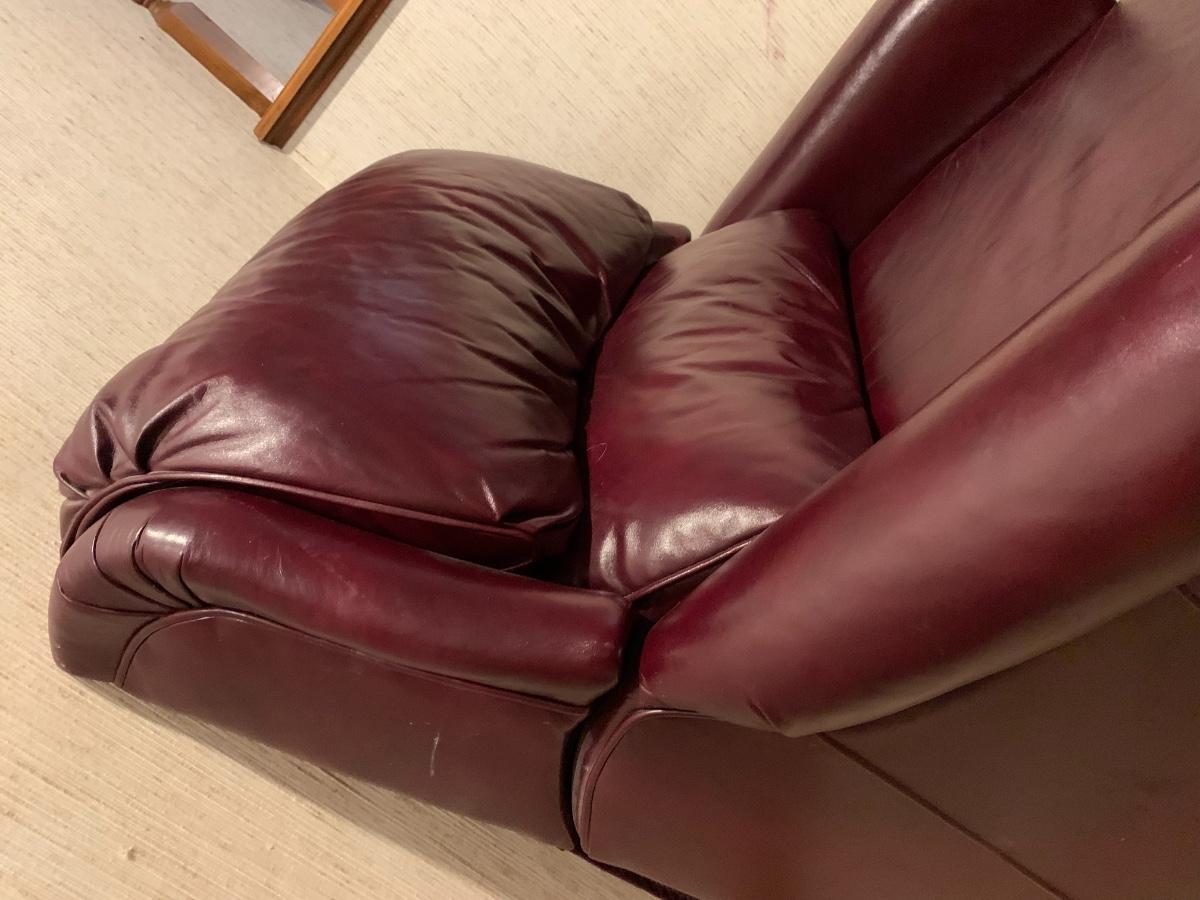 Bradington Young vinyl chair in dark red/maroon in good condition, leans far back when in the sitting position with ottoman.