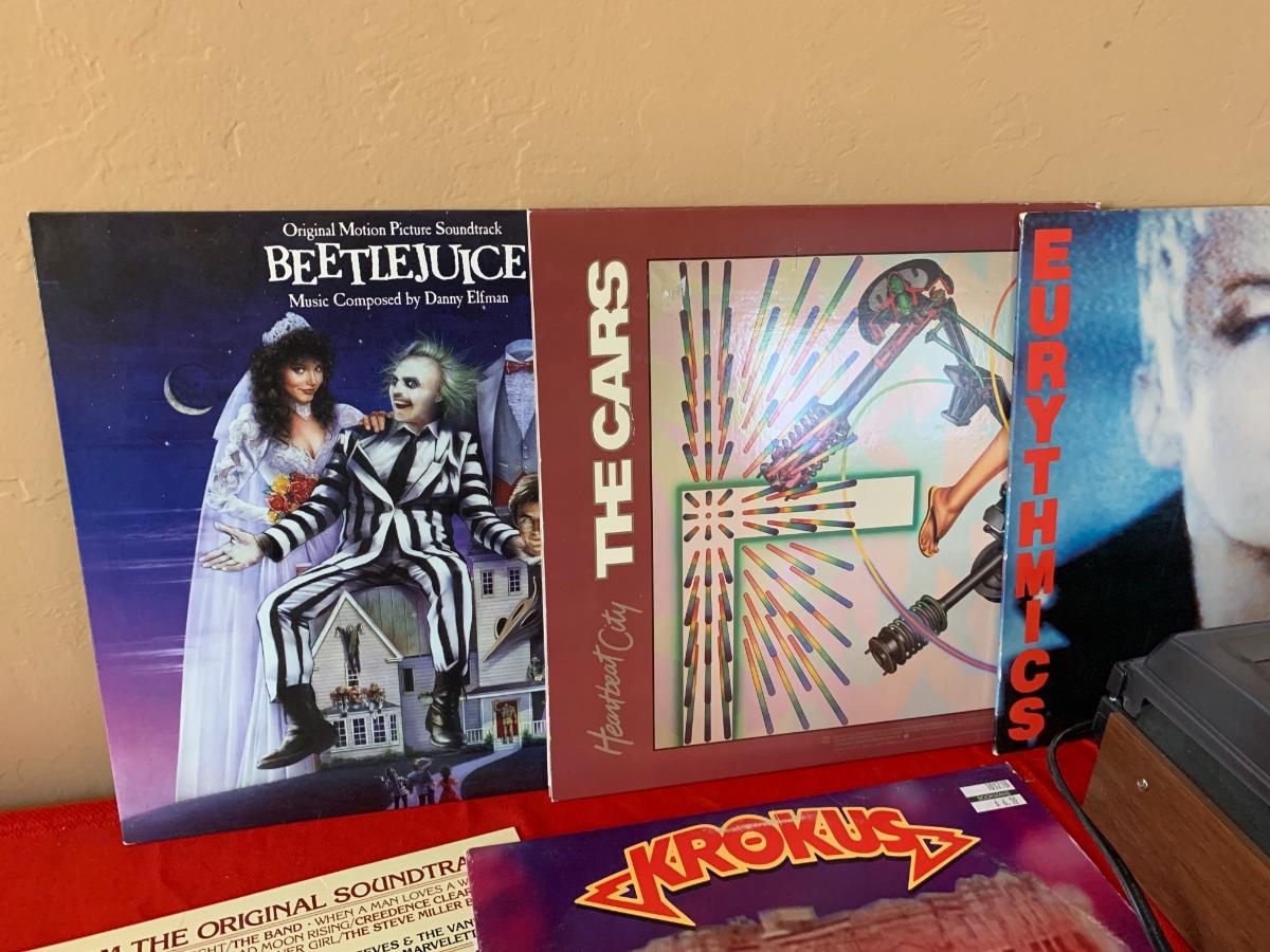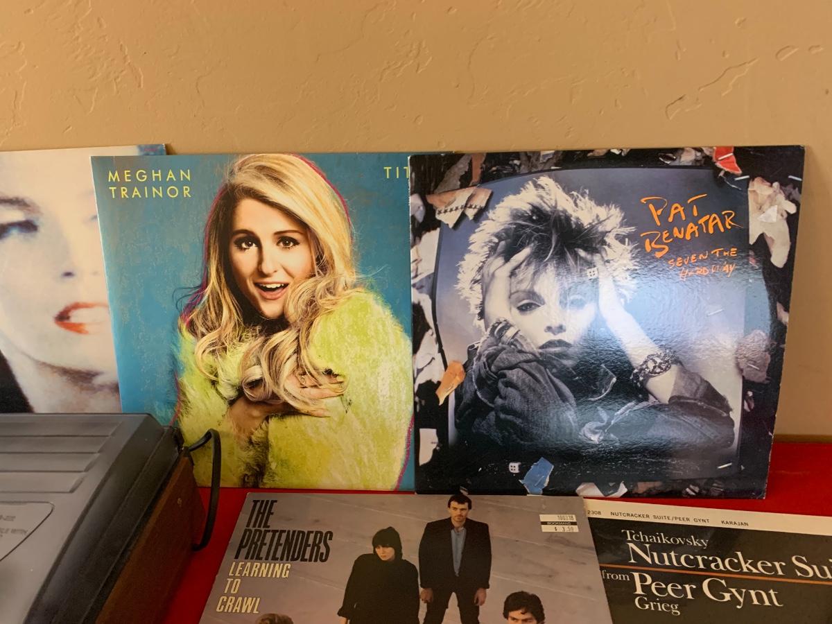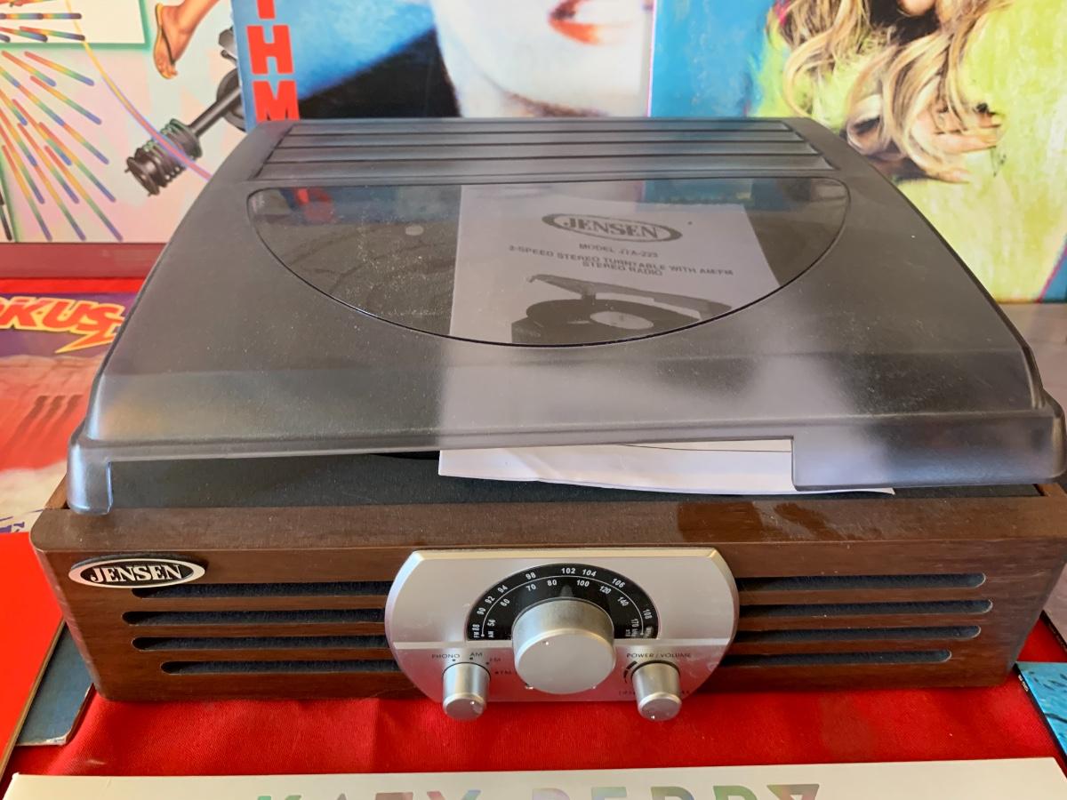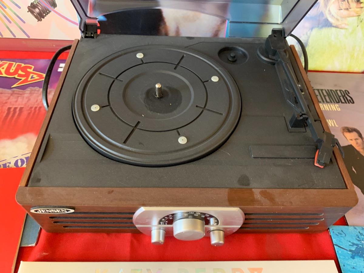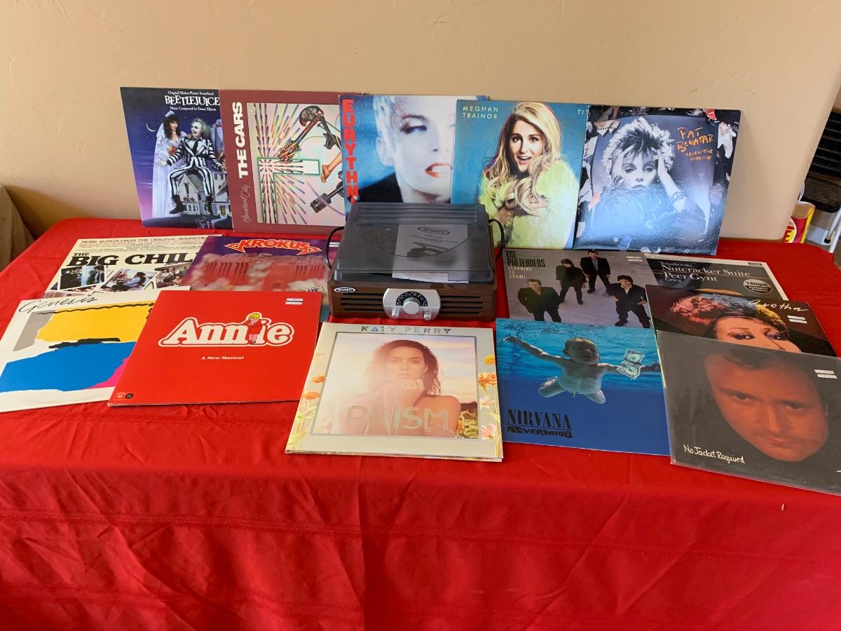 Includes a Jensen turntable and vinyl records including - Aretha, Genesis, Nirvana, Meghan Trainor, Katy Perry, Pat Beneath, Cars and more!