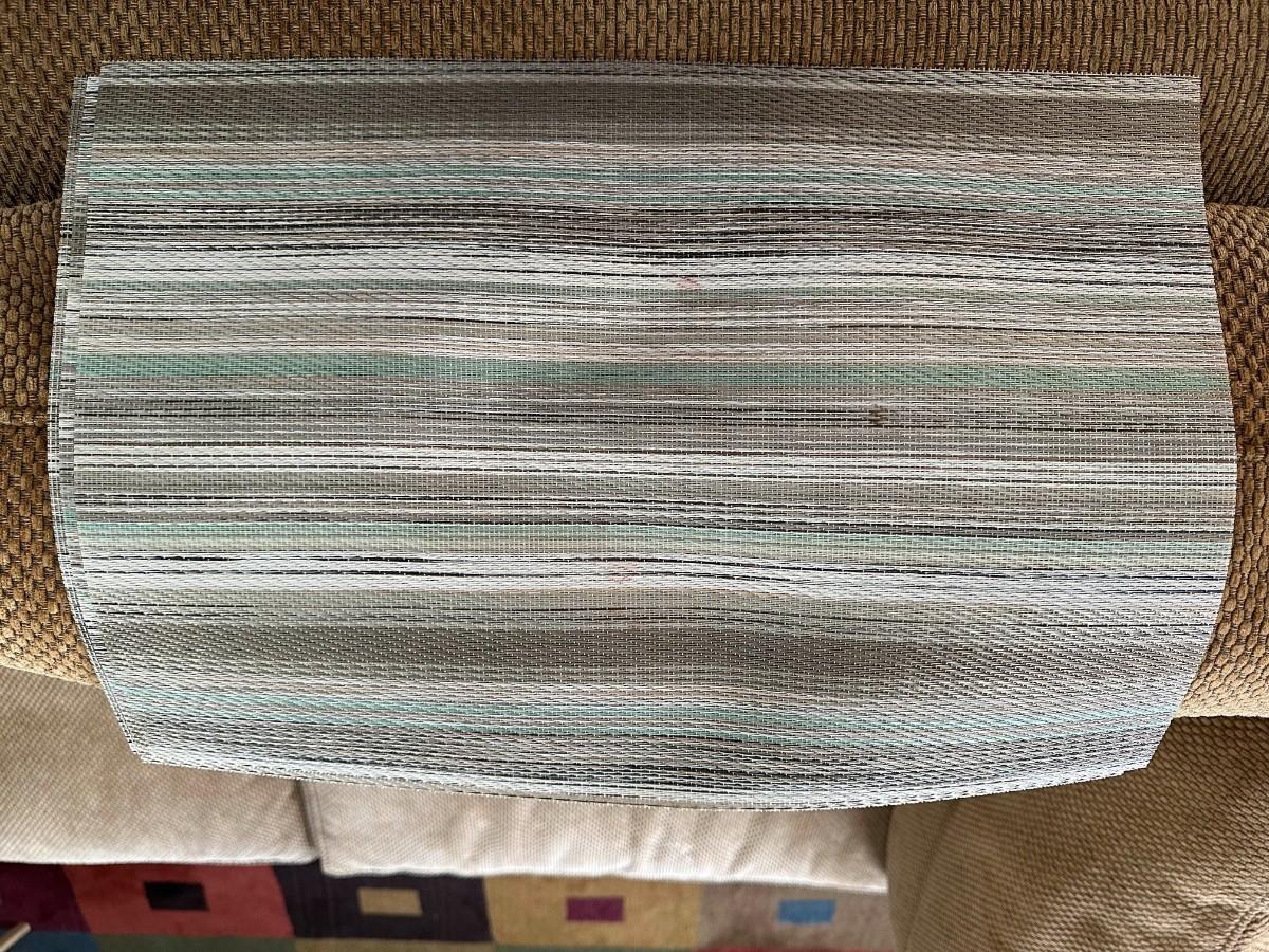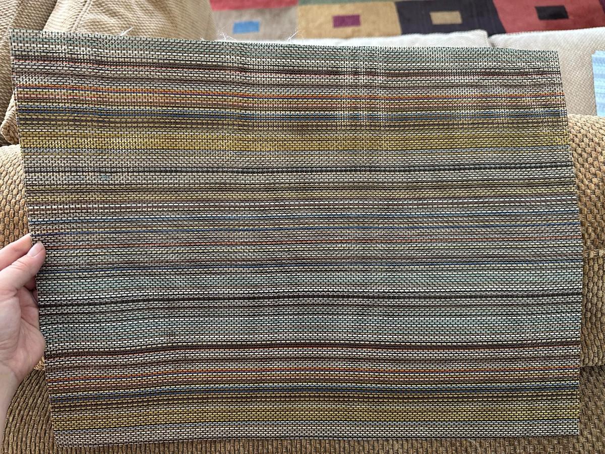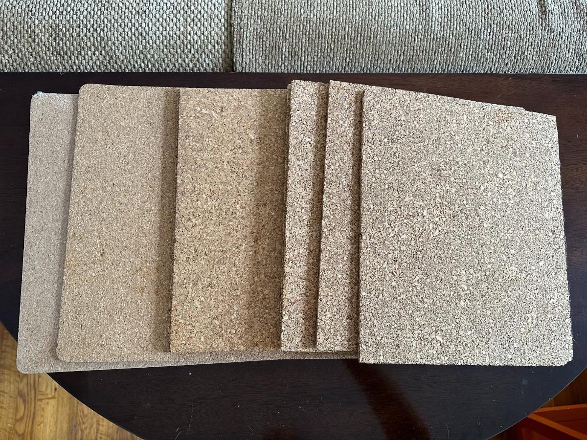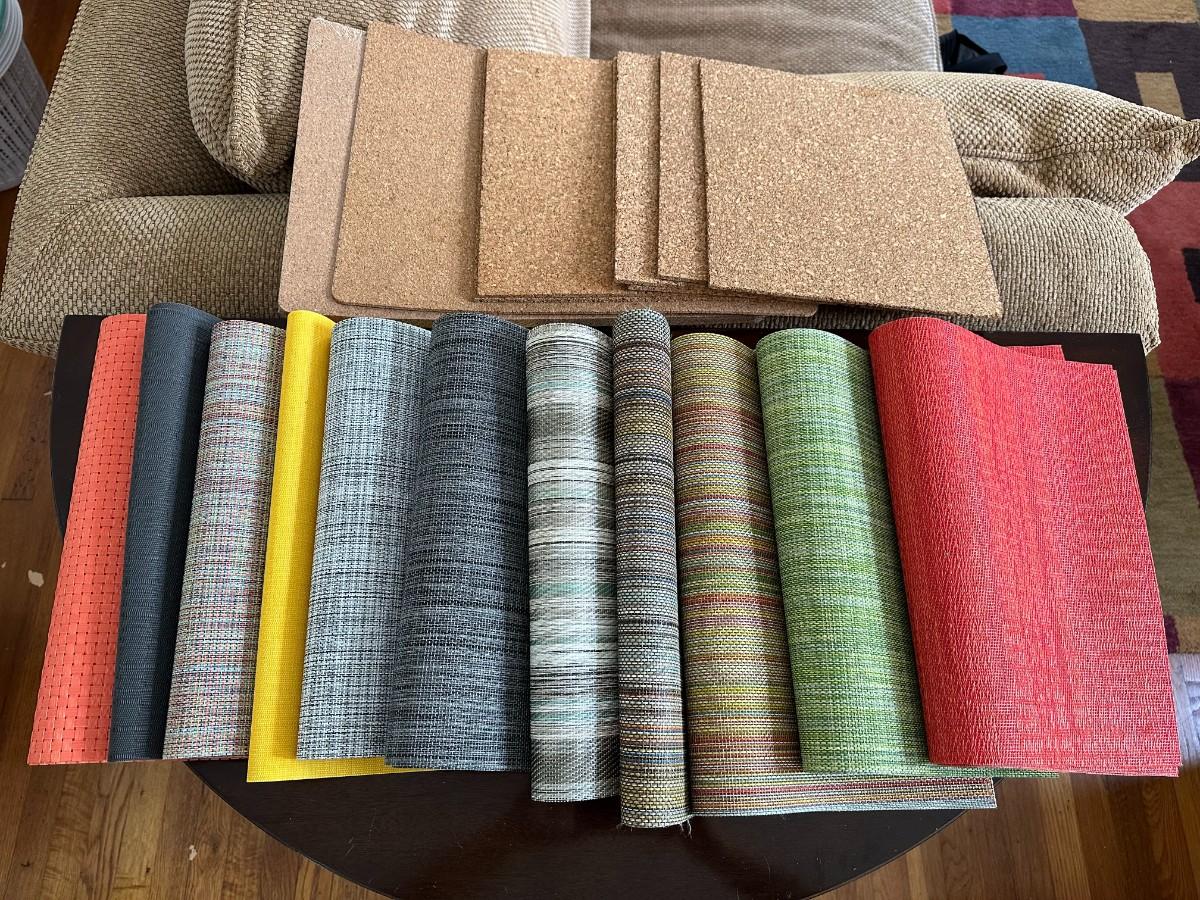 Rectangular Mats: 4 gray/black, 2 white/black, 2 yellow, 2 multi, 4 red/orange, 4 green/yellow, 4 yellow/orange/greenmulti stripe, 2 tan/yellow/brown multi stripe, 3 silver/tan/white multi. 2 orange square mats, 2 dk gray square mats. 5 rectangular corks 5 square corks, 1 odd size smaller cork.