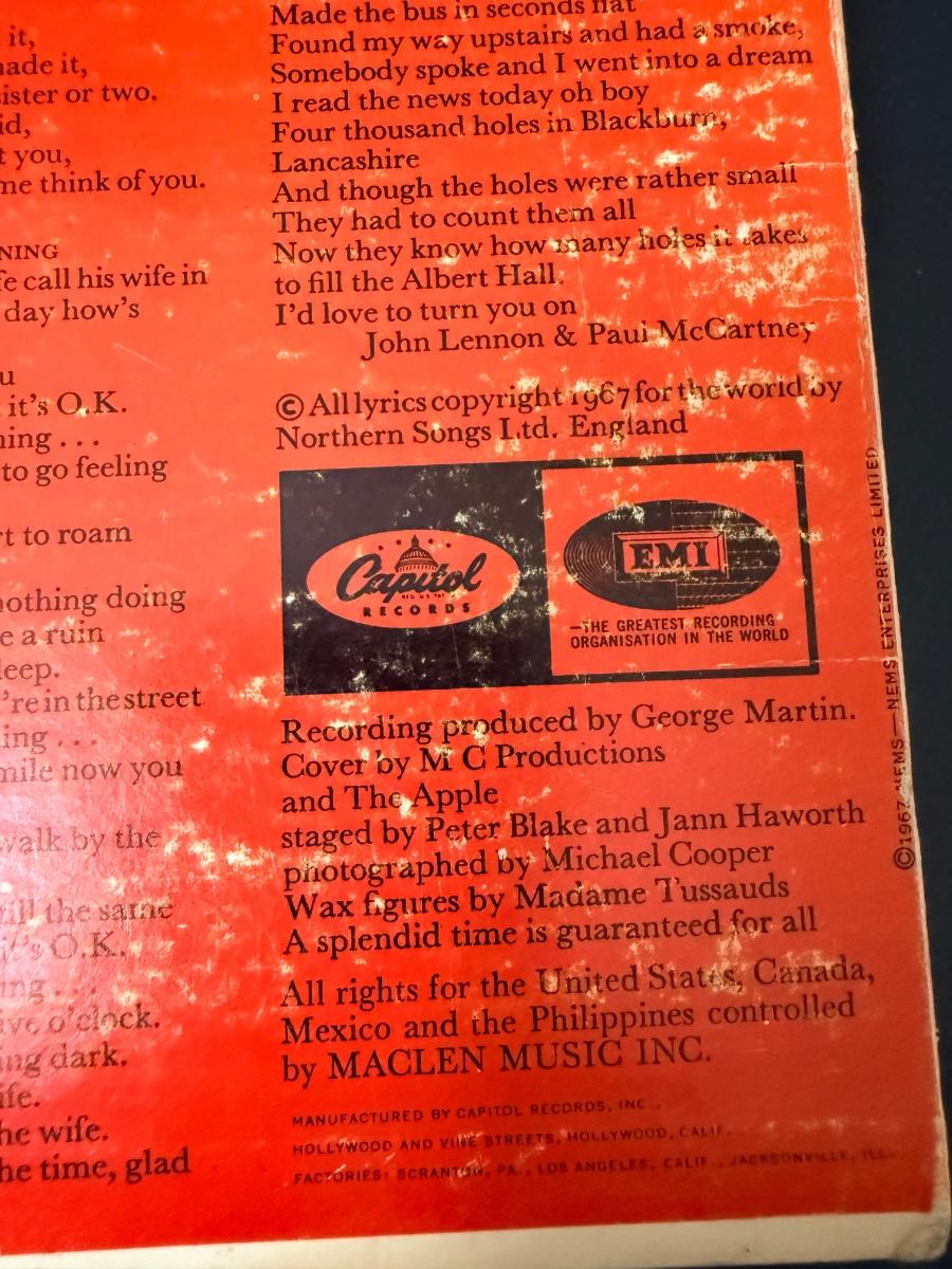 The Beatles - Sgt Peppers Lonely Hearts Club Band c1967 - original sleeve, good clean vinyl, cover has side tears