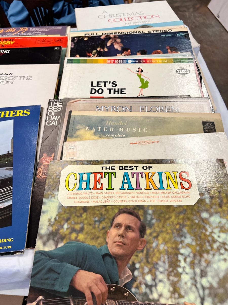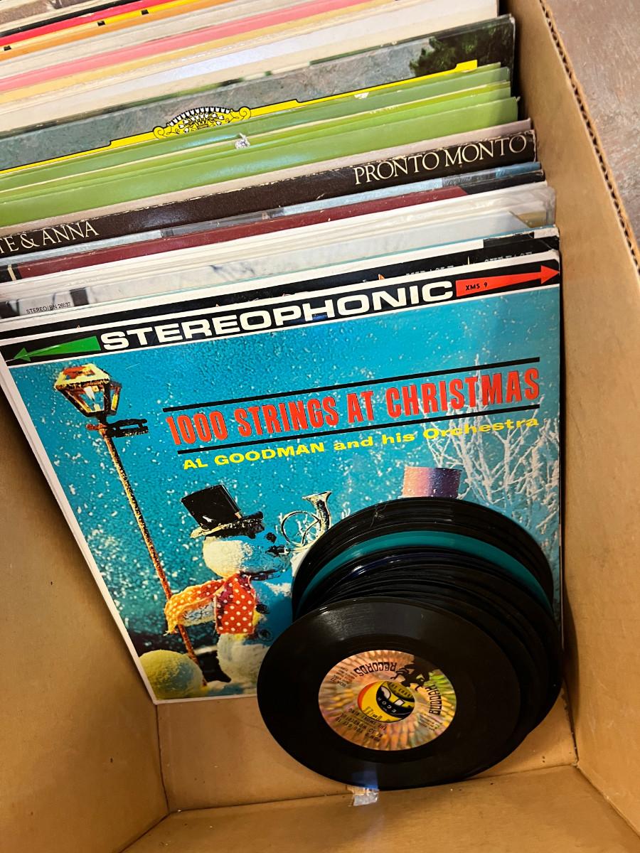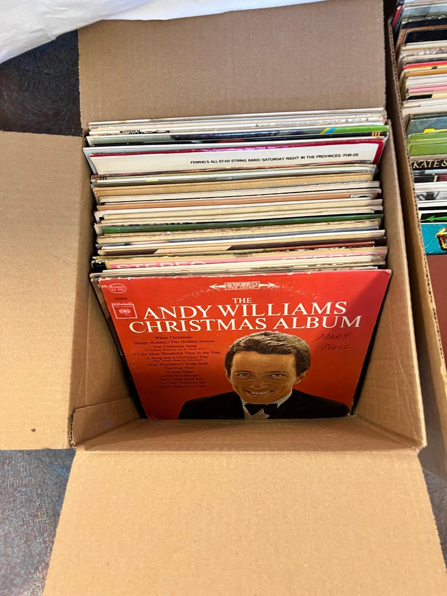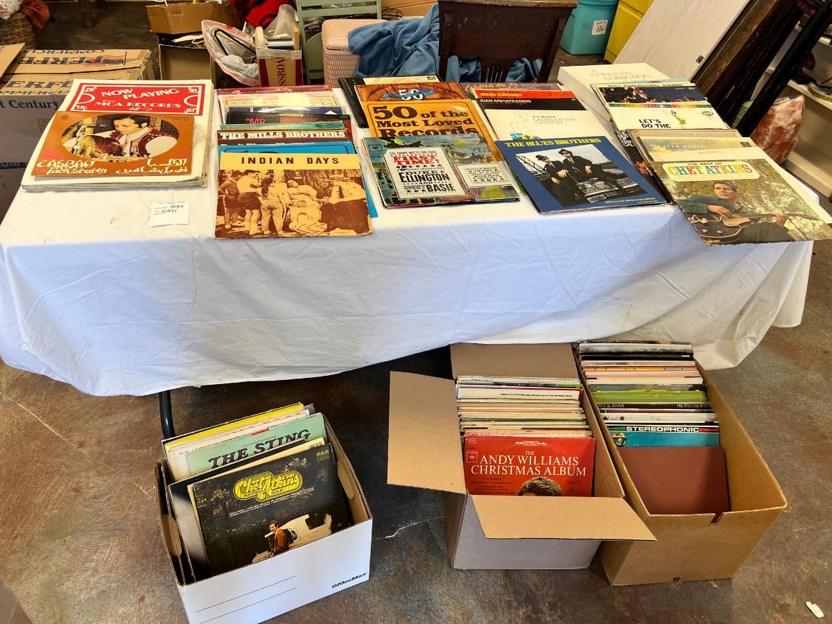 A large amount of vintage vinyl, all used. Christmas, country and rock, with some show tunes and musicals thrown in. Some unusual albums and a stack of "now playing" display poster NOS cards. No shipping