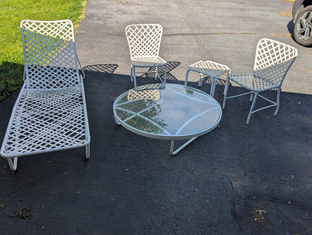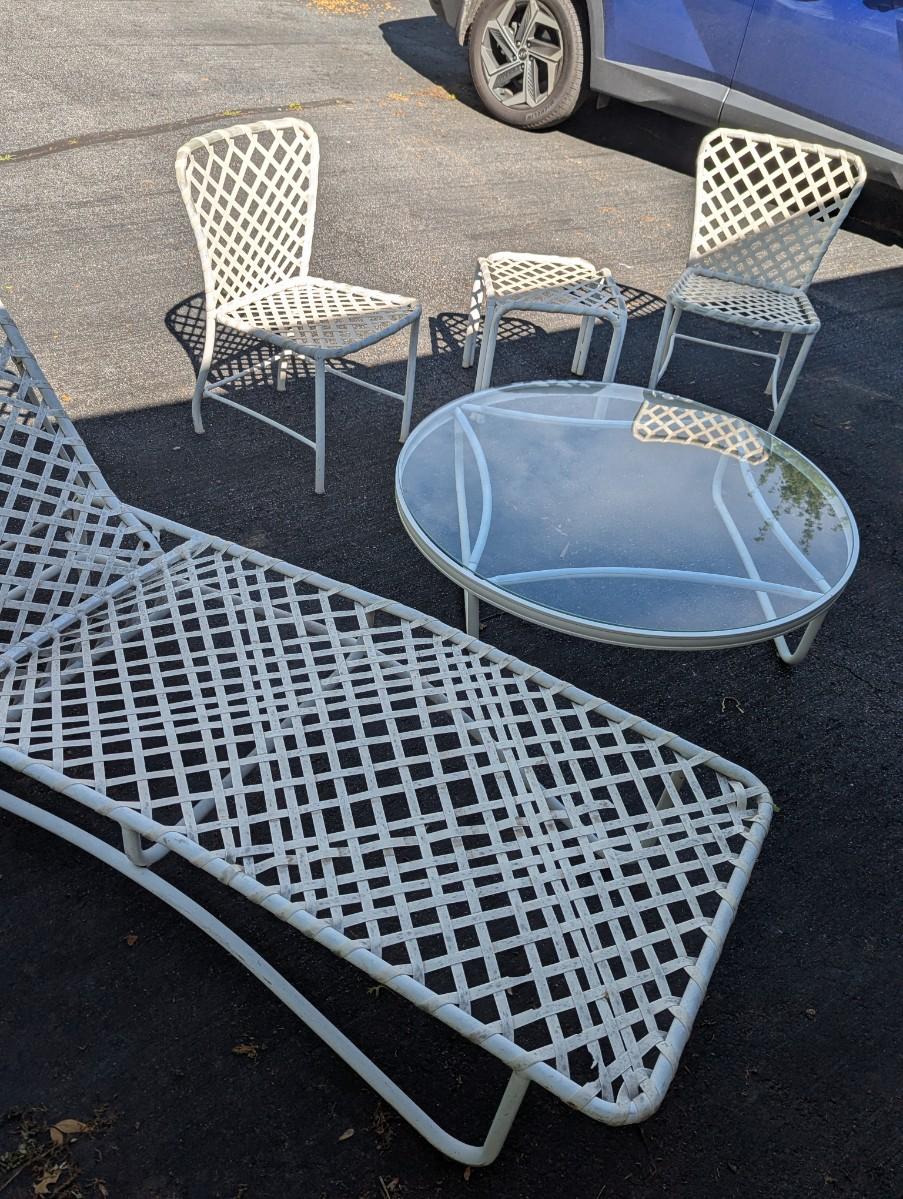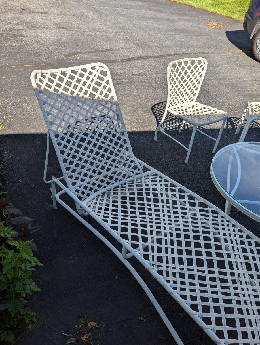 Marked - Vintage "Brown Jordan" Vinyl Strap White Patio Chase Lounge Chair Round Table Chairs & Side Table (G)