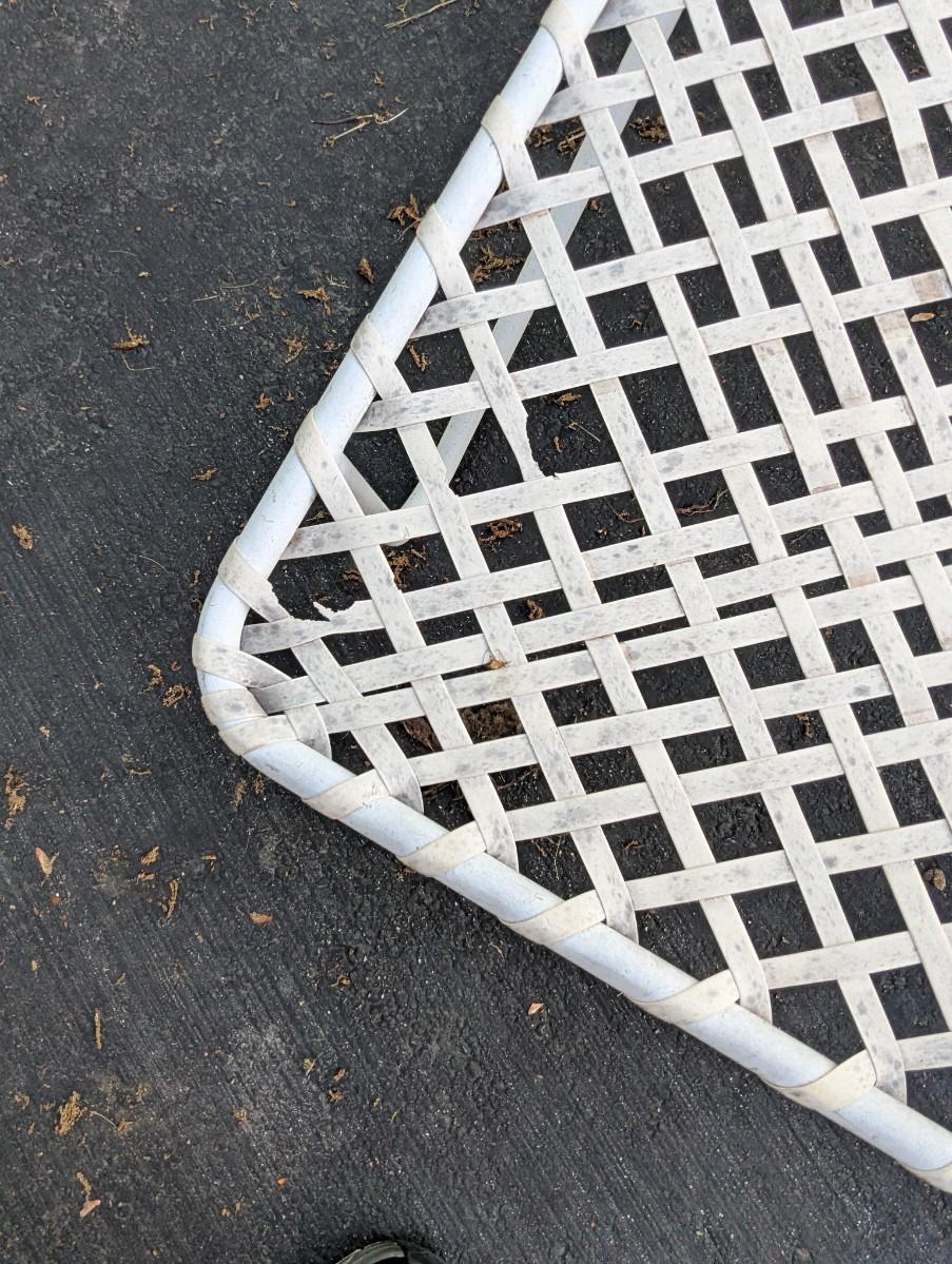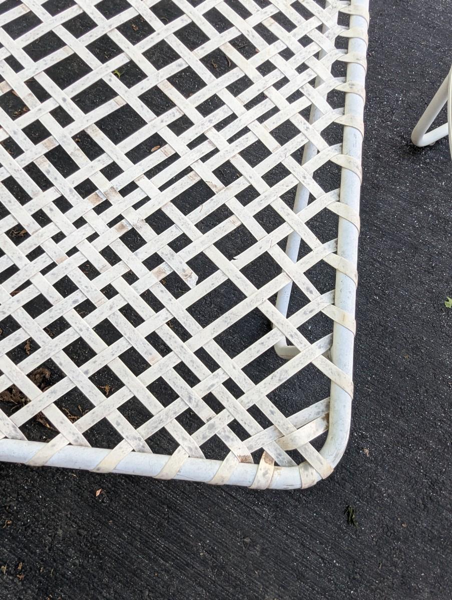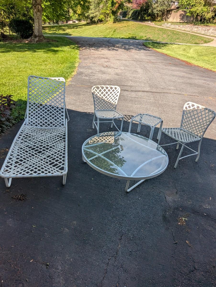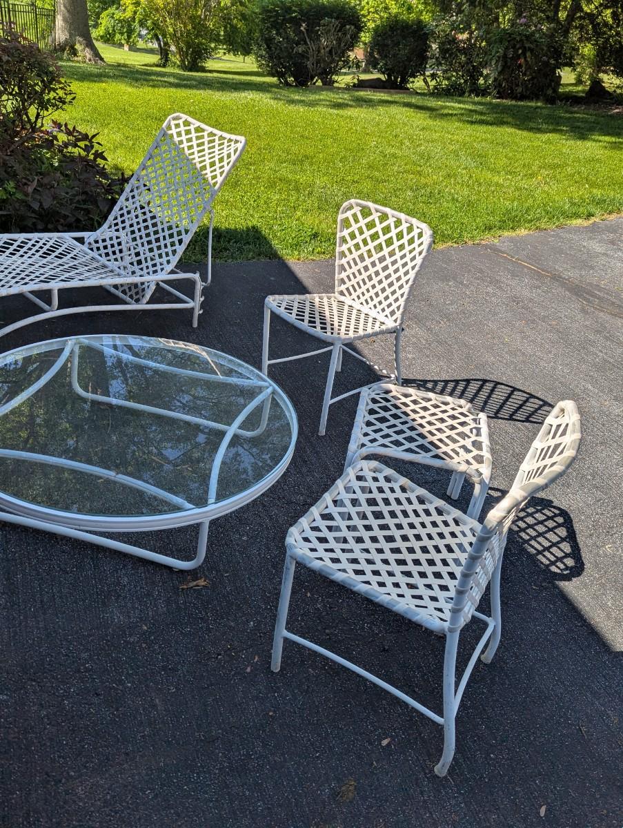 Marked - Vintage "Brown Jordan" Vinyl Strap White Patio Chase Lounge Chair Round Table Chairs & Side Table (G)