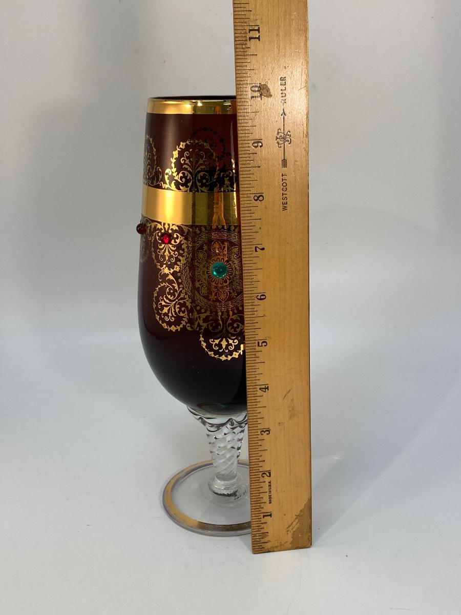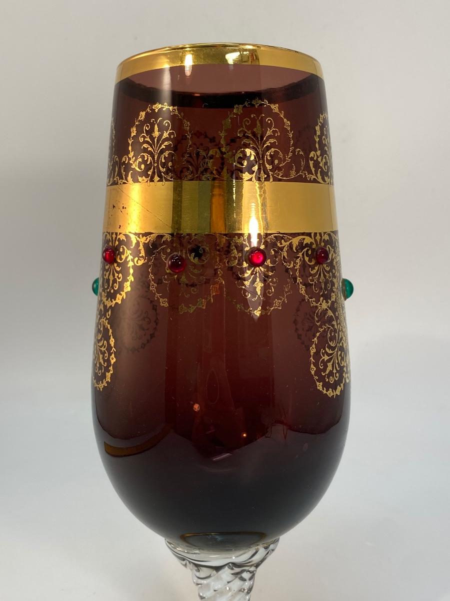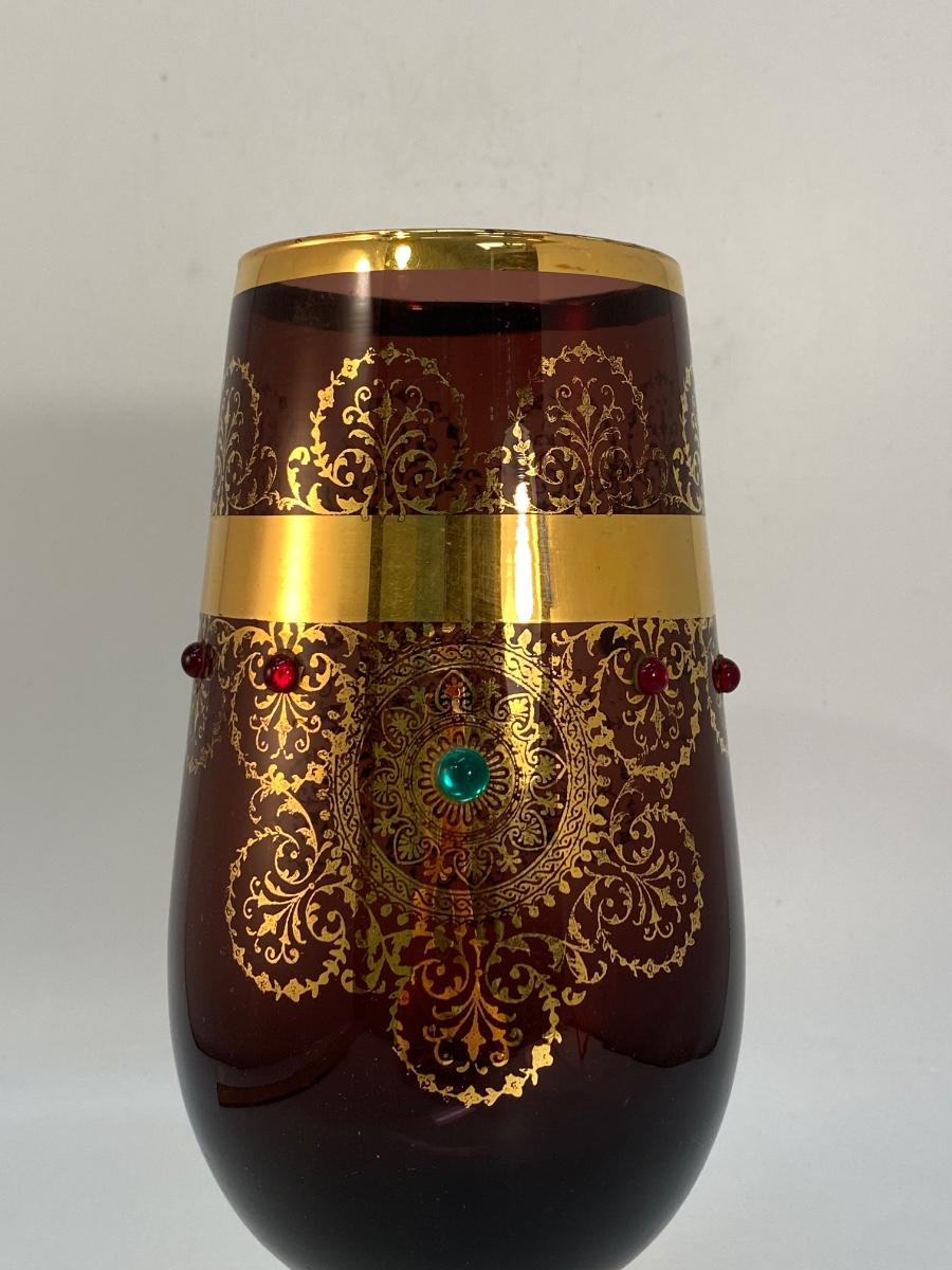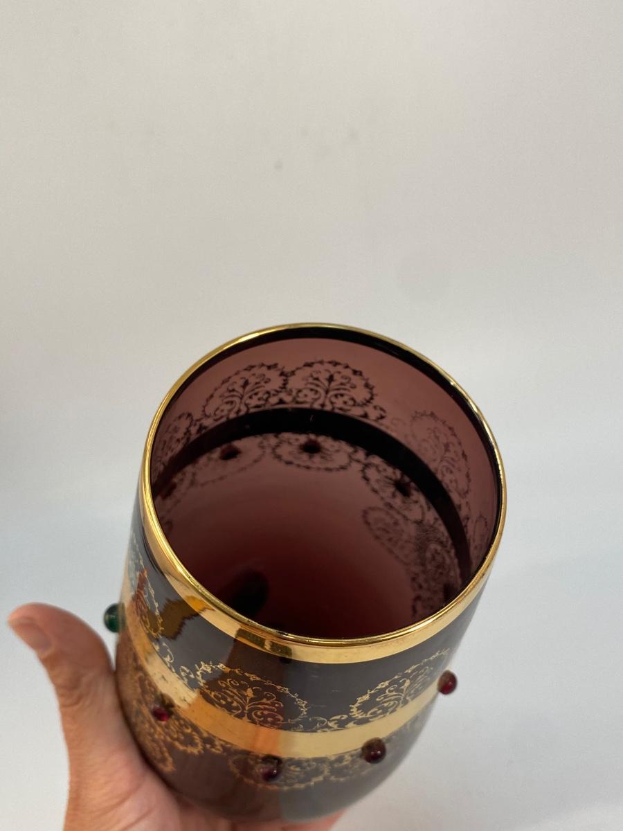 Violet Amethyst Glass Vase Chalice with Gold Medallion Pattern. Light wear but in good displayable condition. Has rhinestone like gems attached. 10" tall.