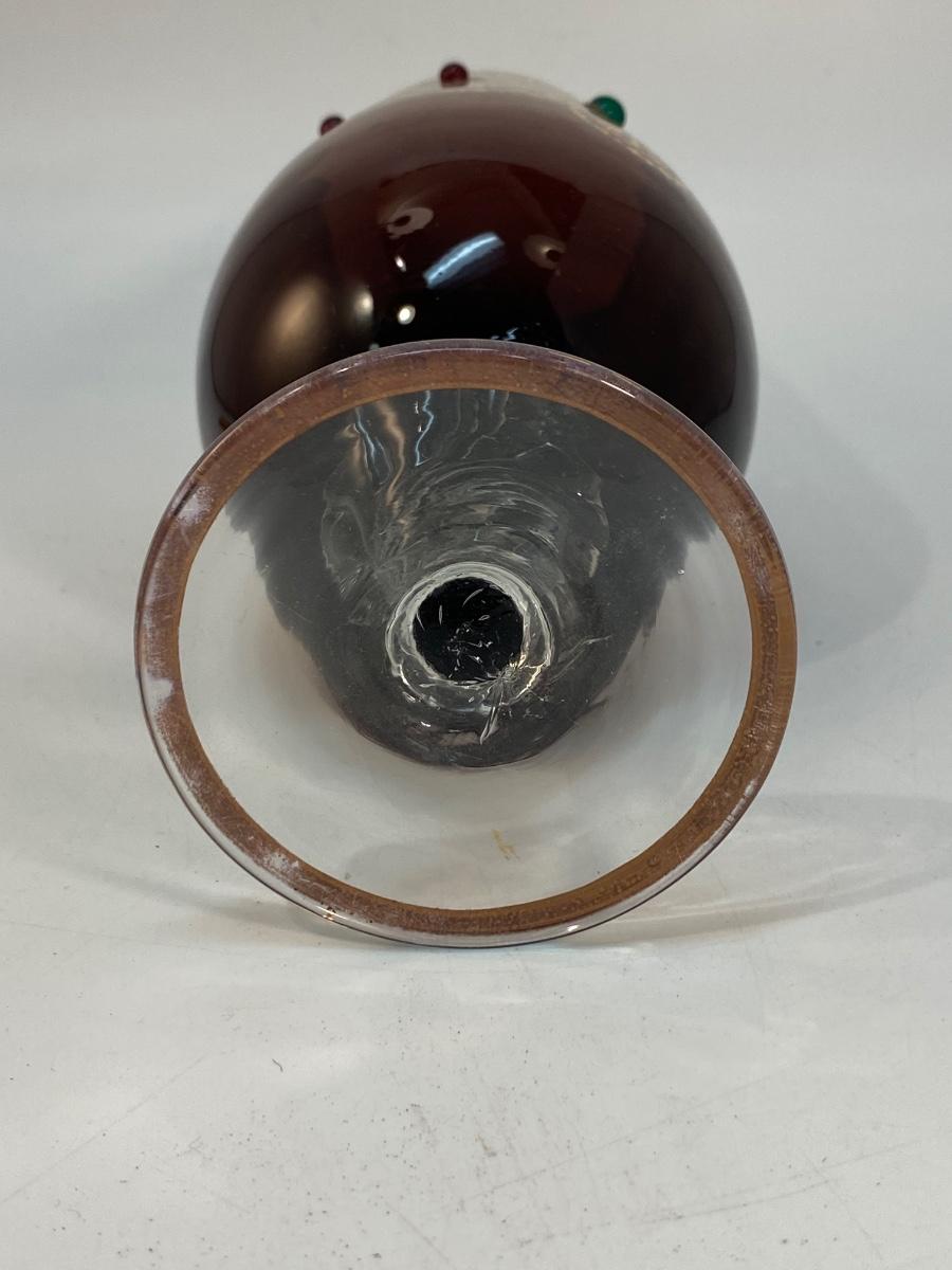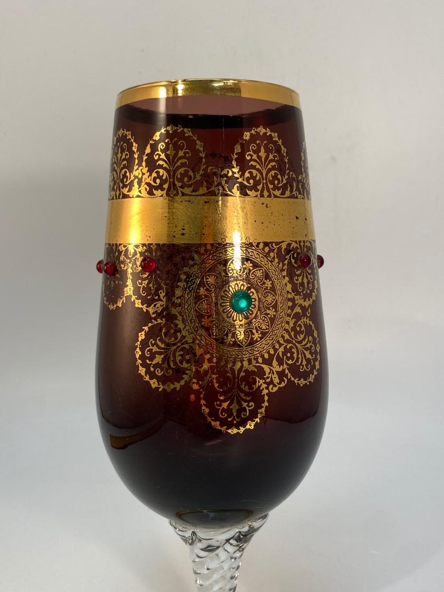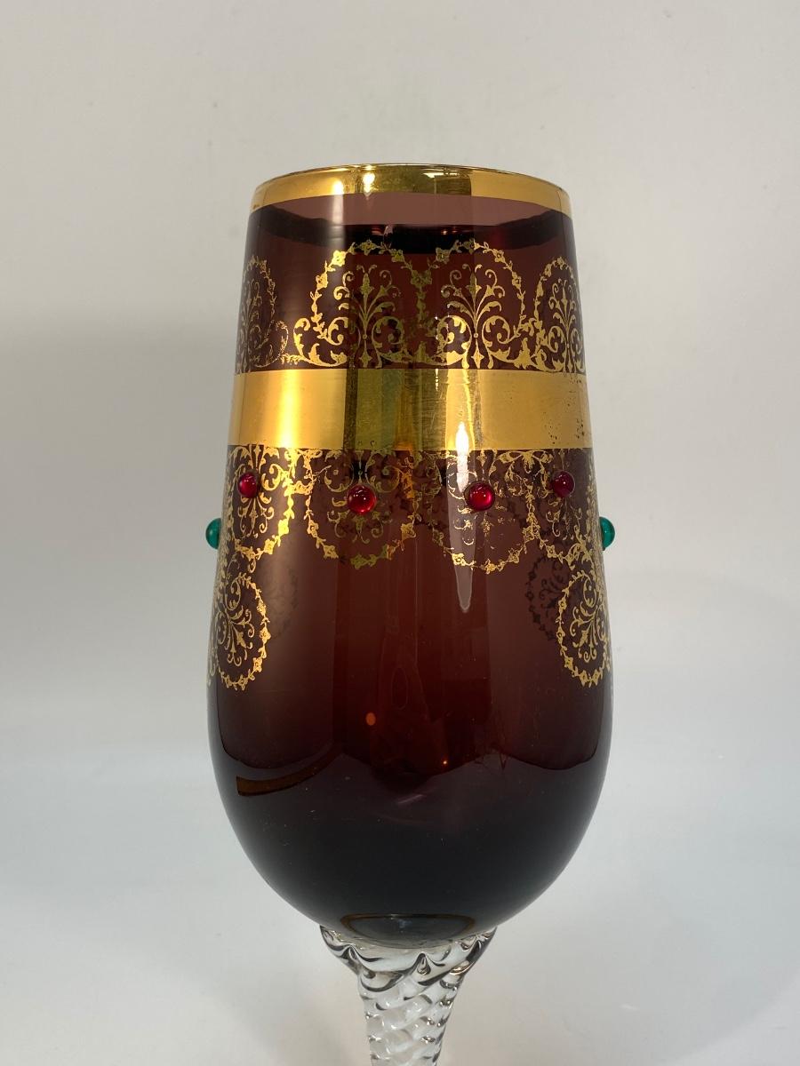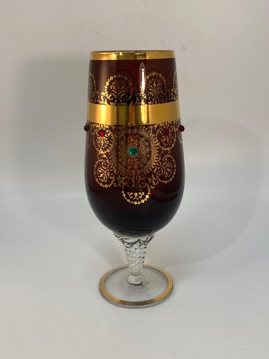 Violet Amethyst Glass Vase Chalice with Gold Medallion Pattern. Light wear but in good displayable condition. Has rhinestone like gems attached. 10" tall.